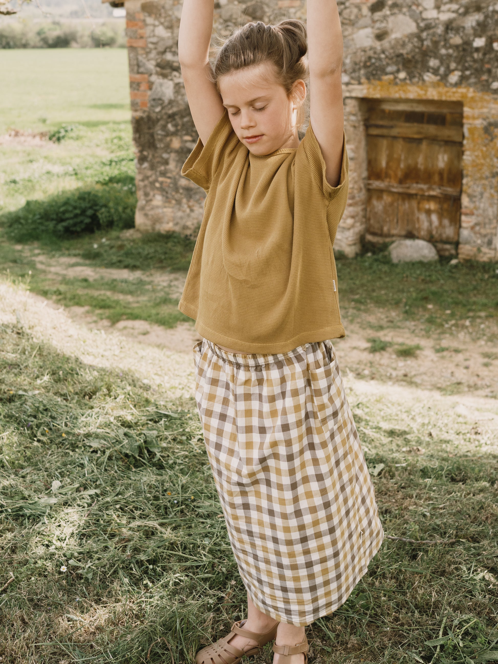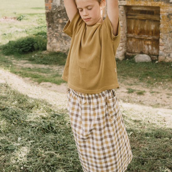 Hadiya is a long skirt made of organic cotton poplin. It's light and super fresh, featuring an elastic waistband, side pockets, and a back slit for added comfort and movement. The vichy print from our DREAM collection evokes rustic charm and simplicity—it's the attention to detail and care we put into each piece that makes it truly unique.