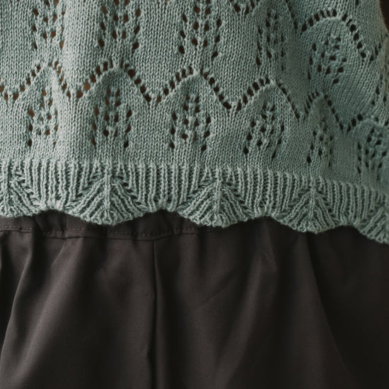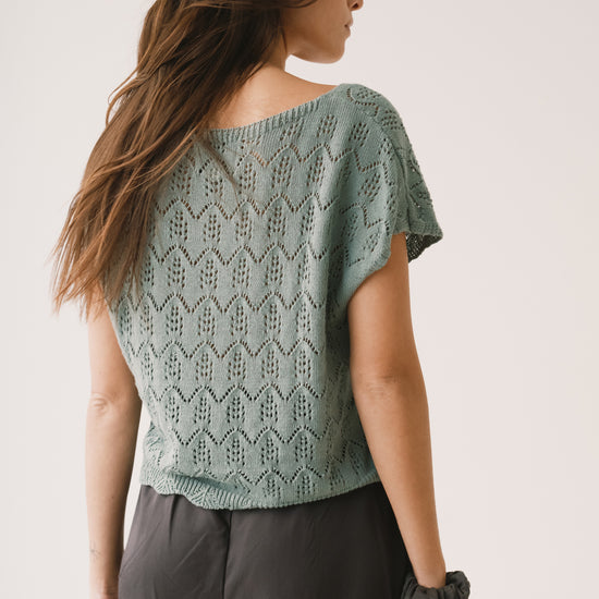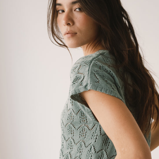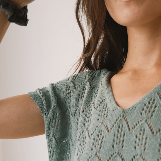 The Colette openwork knit top is inspired by a light, bohemian spirit and designed for effortless wear on warm days. Its dropped sleeves and V-neckline create a relaxed, feminine silhouette, while the openwork knit adds texture and depth to the piece. Crafted from organic cotton, it feels light on the skin and stands out for its exceptionally soft touch. A delicate yet timeless top, perfect for pairing with fluid pieces like our linen skirt for a fresh look, or with everyday essentials such as jeans for a more relaxed feel. This light blue shade conveys serenity and understated elegance. A versatile and flattering color for all skin tones, especially lighter complexions.