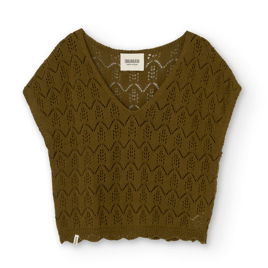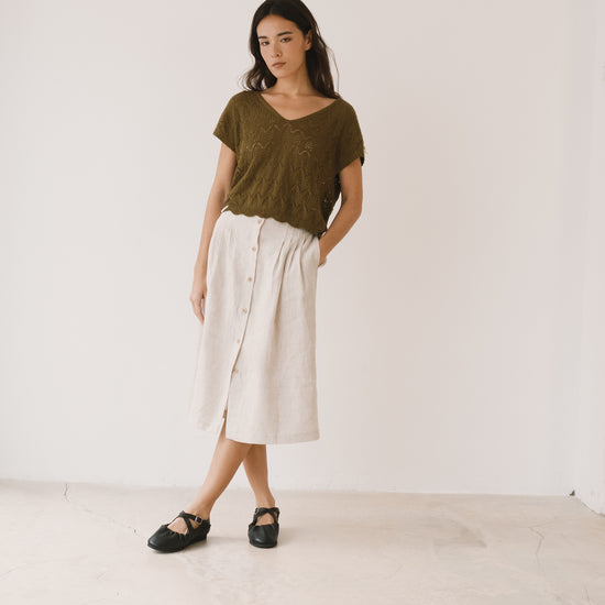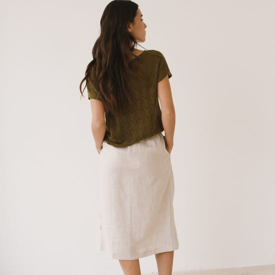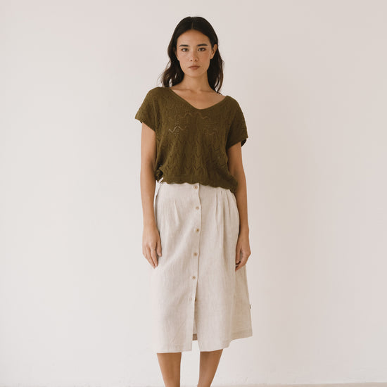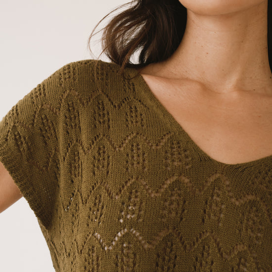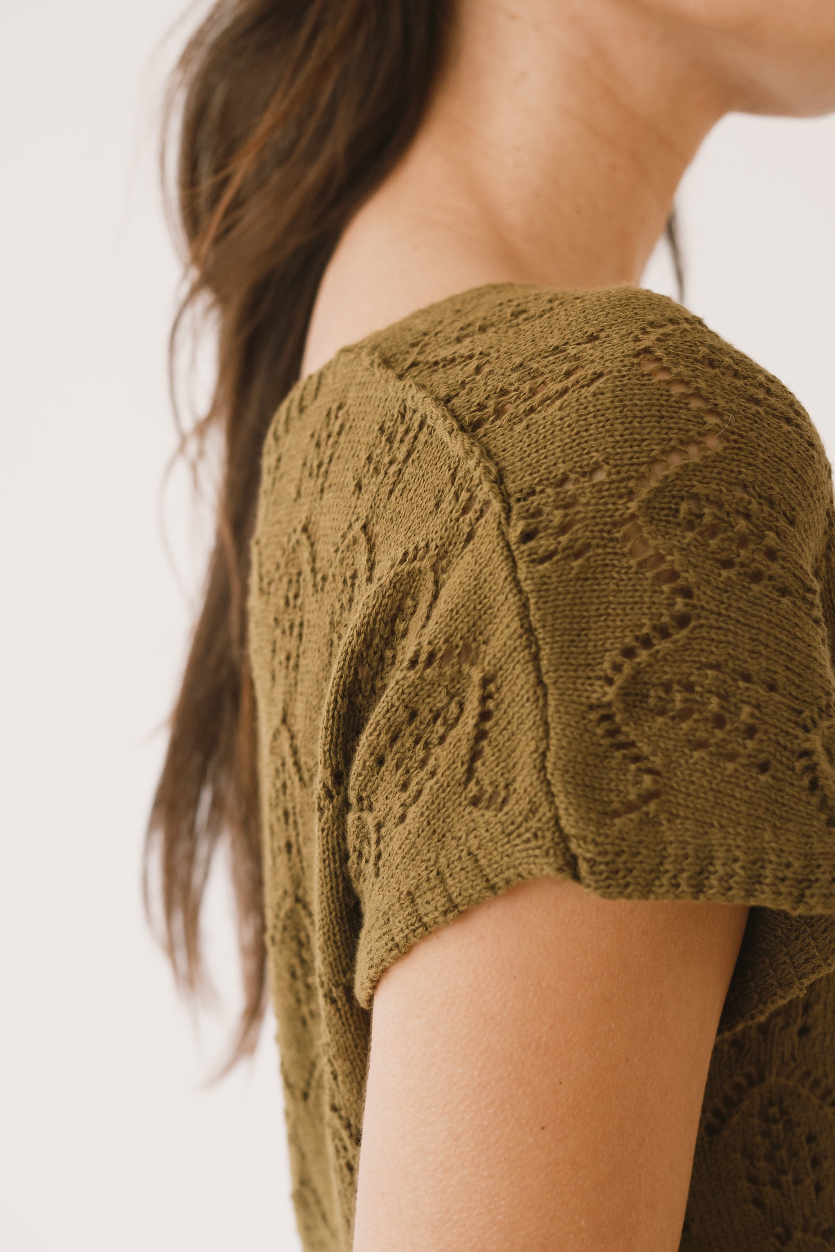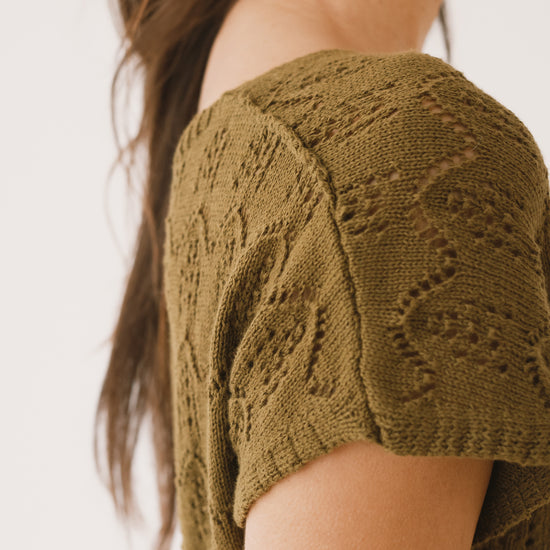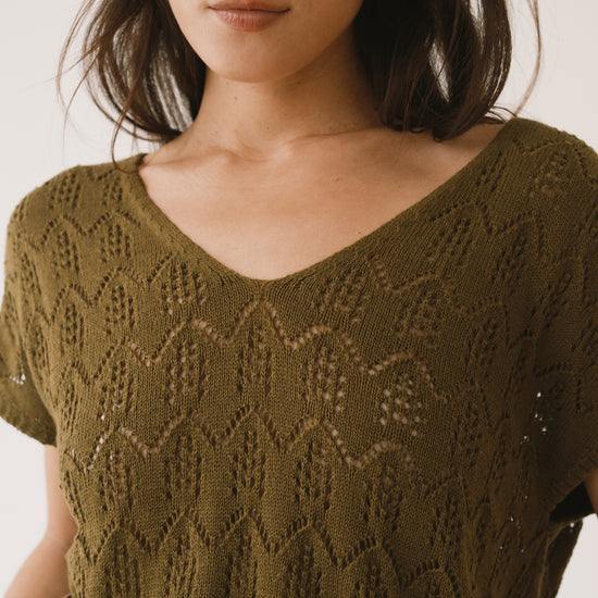 Crafted from organic cotton, the Colette openwork knit top feels lightweight and exceptionally soft against the skin. Its intricate openwork design brings texture and subtle depth, creating a piece that feels both delicate and refined. Dropped sleeves and a V-neckline shape a relaxed, feminine silhouette, perfect for warm days. Style it with our linen skirt for an airy look, or pair it with jeans for effortless everyday ease. This green hue conveys serenity and reminds us of the exuberance and lushness of a forest.