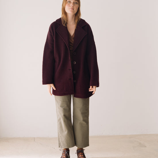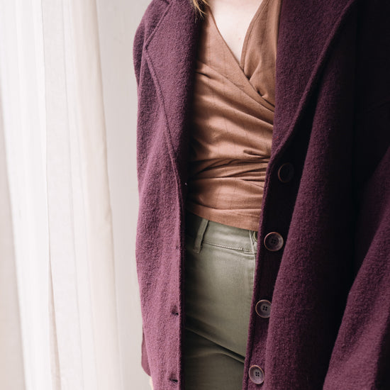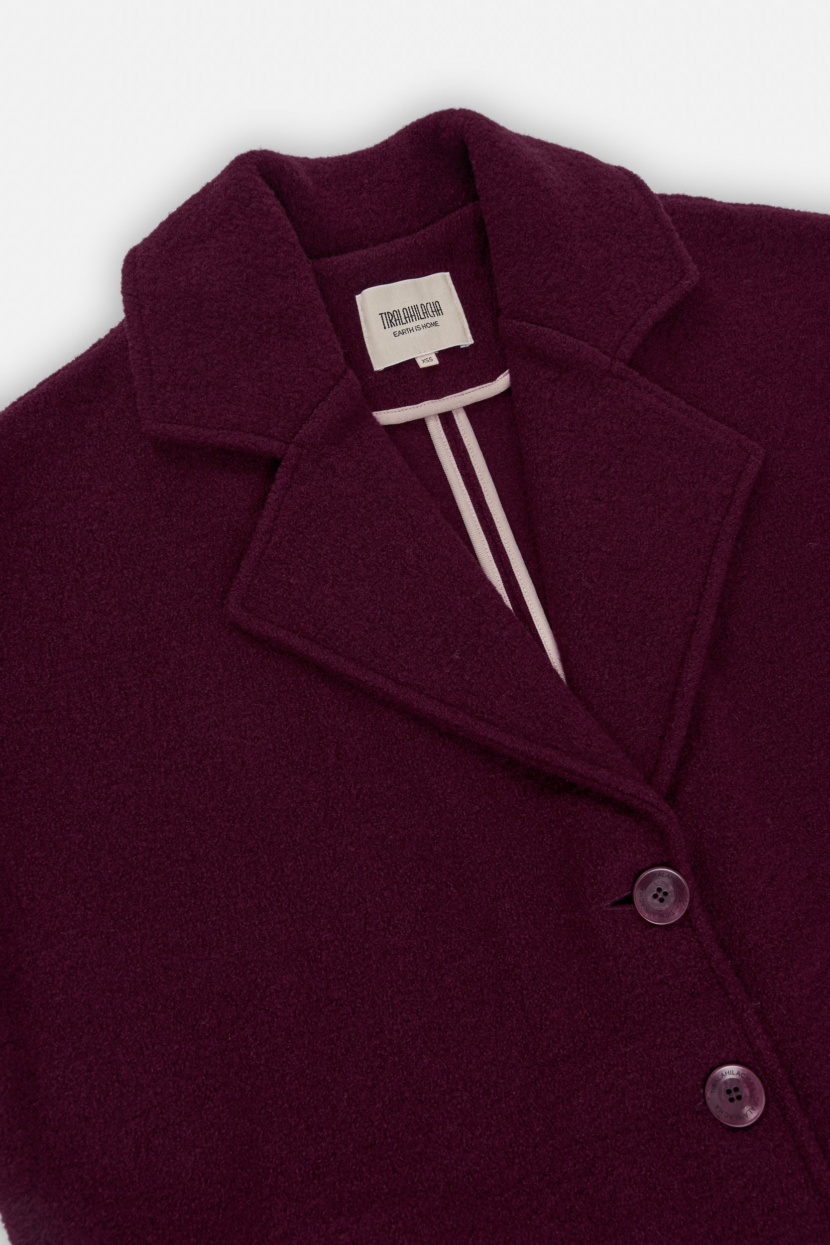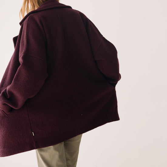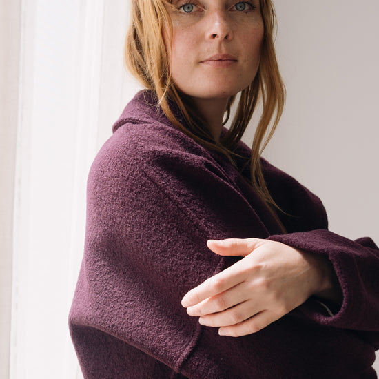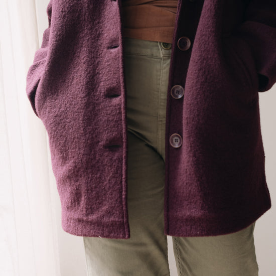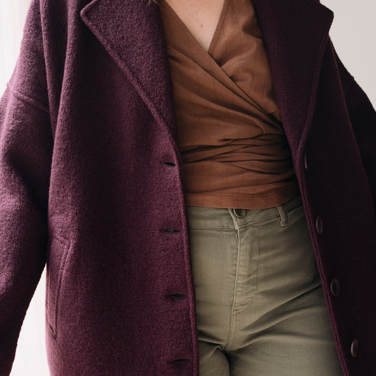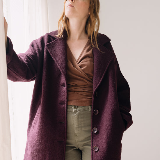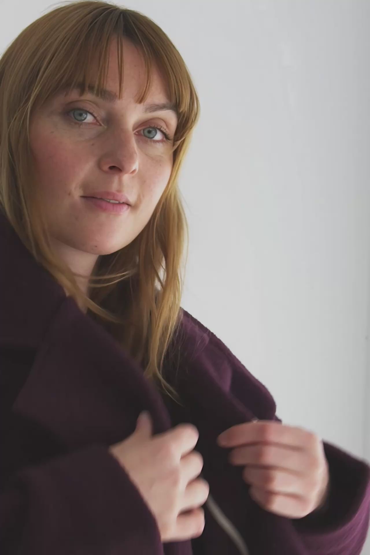 We’re truly in love with this Coat—designed to accompany you for many winters without ever going out of style. With a mid-length cut, dropped shoulders, and natural corozo buttons, it’s finished with contrasting cotton binding on the inside seams for an elegant touch. Made from 100% responsible merino wool, mulesing-free and certified by RWS and Woolmark, this sustainable winter coat is high-quality, warm, and timeless. Carefully crafted in our atelier in Tàrrega, Spain. The purple shade evokes depth, introspection, and mystery—a color that connects with our inner world, creativity, and sensitivity.
