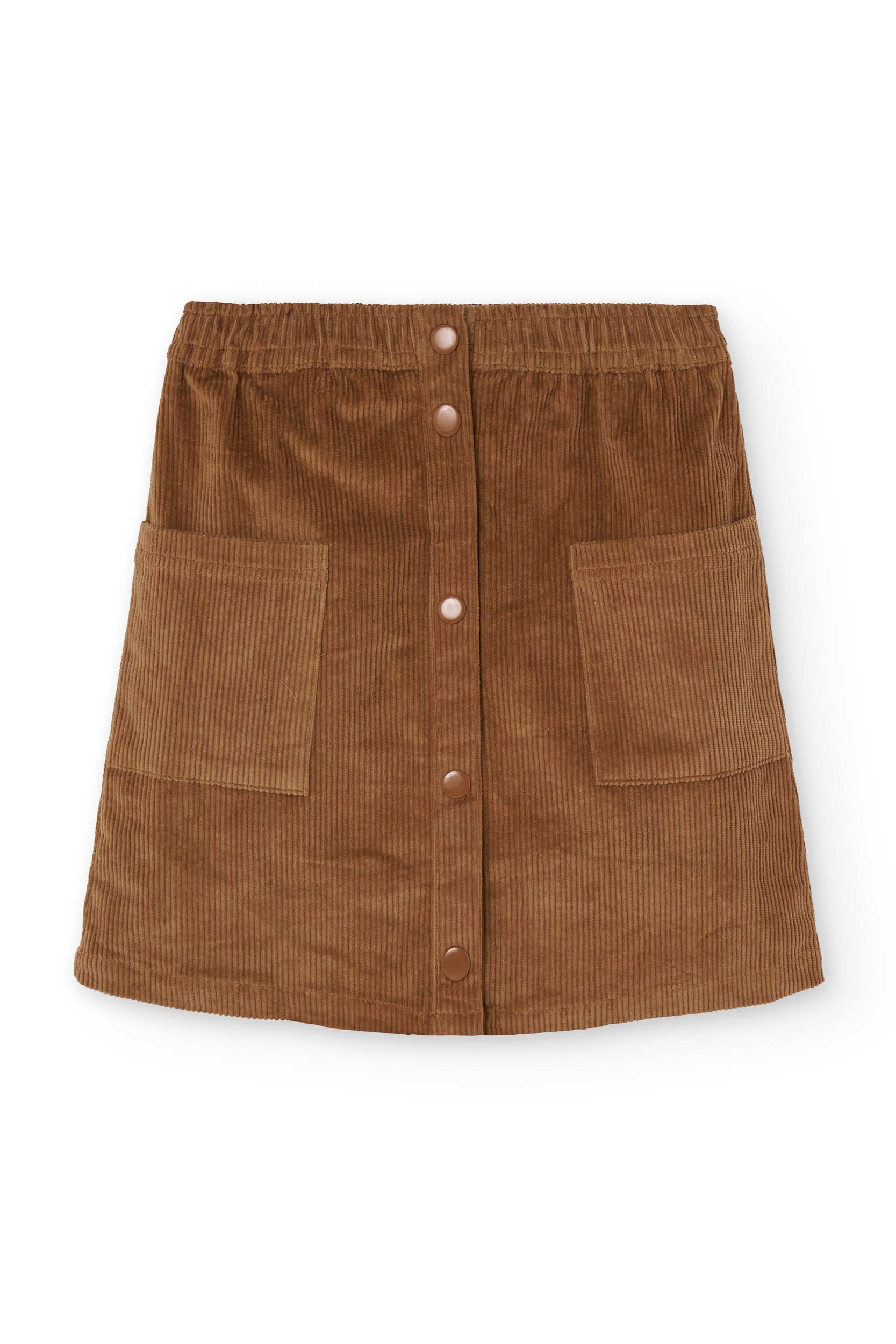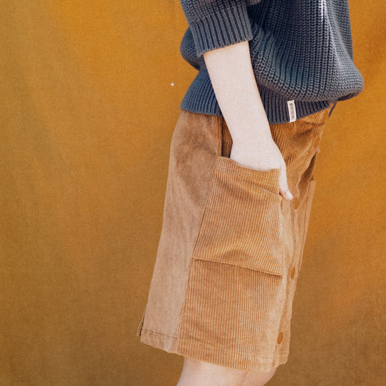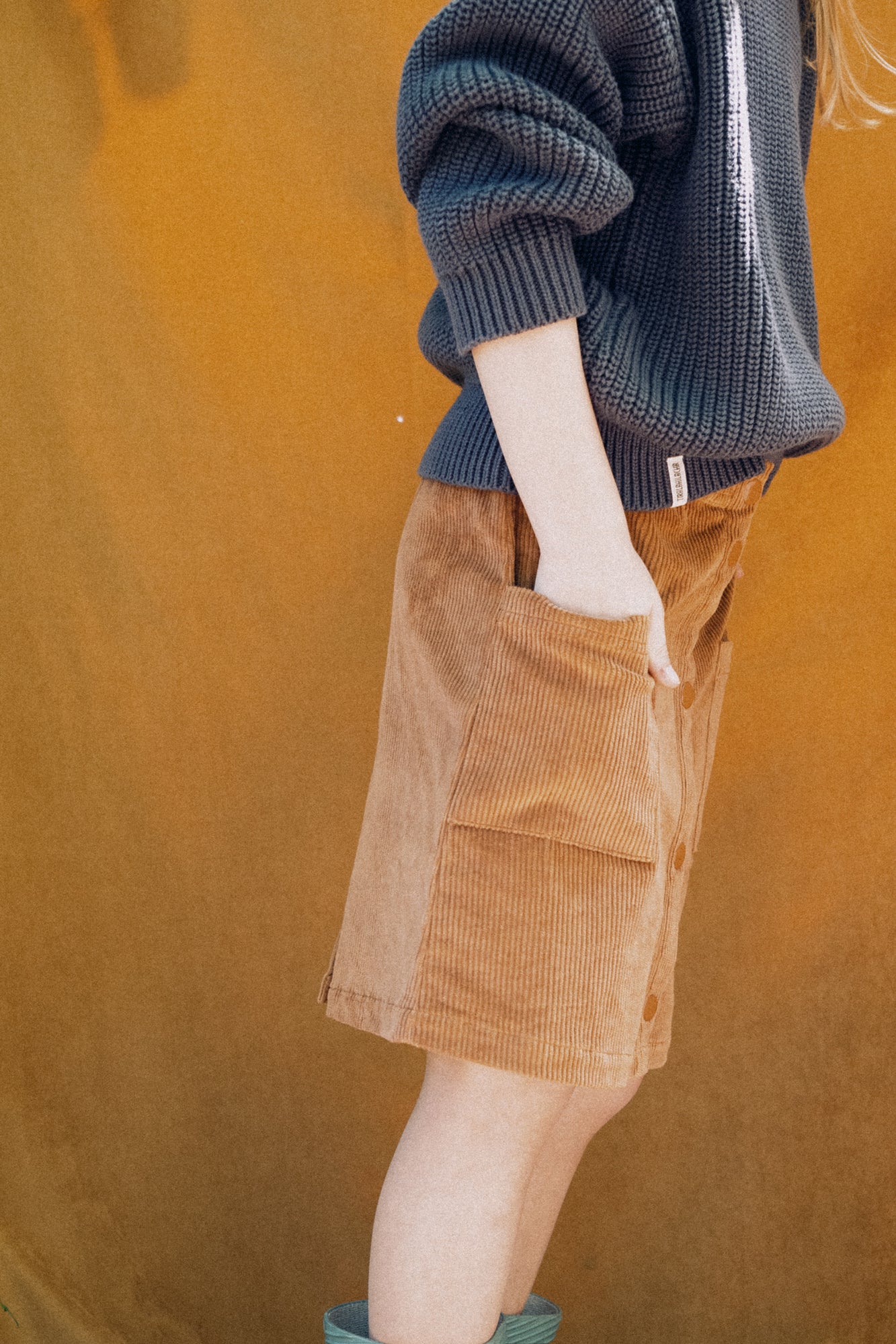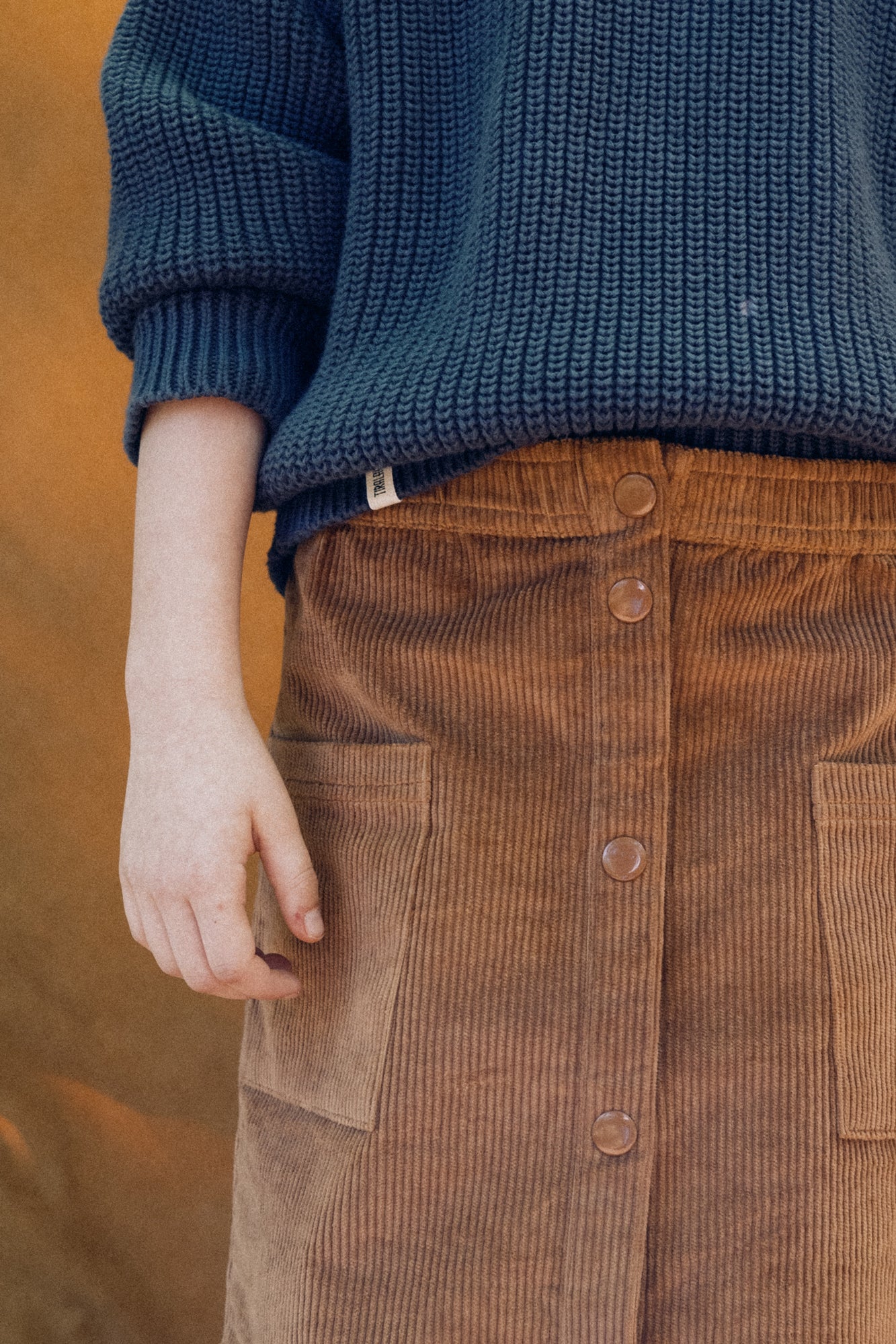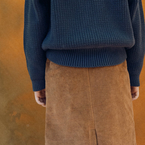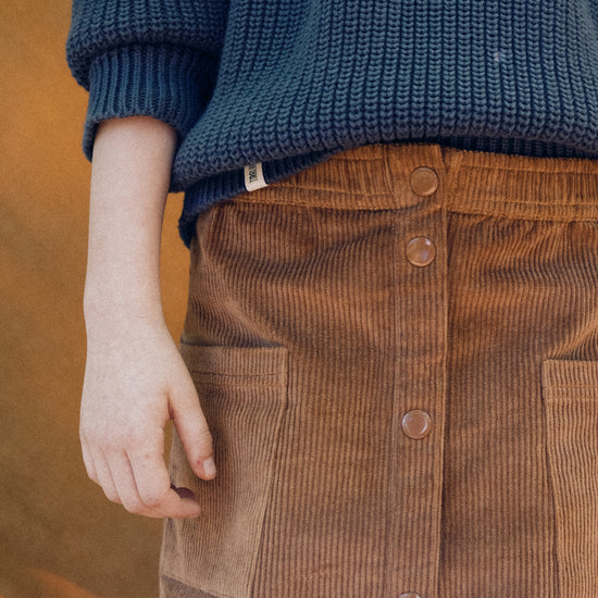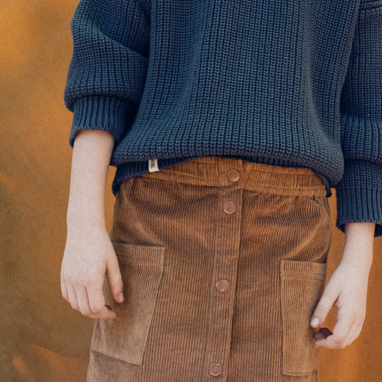 This corduroy skirt will be your little one’s best ally in winter. With a slightly flared cut, an elastic waistband for extra comfort, and nickel-free snap buttons that are easy to open and close—encouraging independence. Designed to last, it’s warm, soft, and resistant thanks to its GOTS-certified organic cotton corduroy fabric. All our garments are toxin-free and hypoallergenic, carefully crafted to protect and respect your little one's delicate skin. This terracotta shade conveys warmth, strength, and an earthy connection. A timeless and versatile color that adds depth and natural elegance to any outfit.