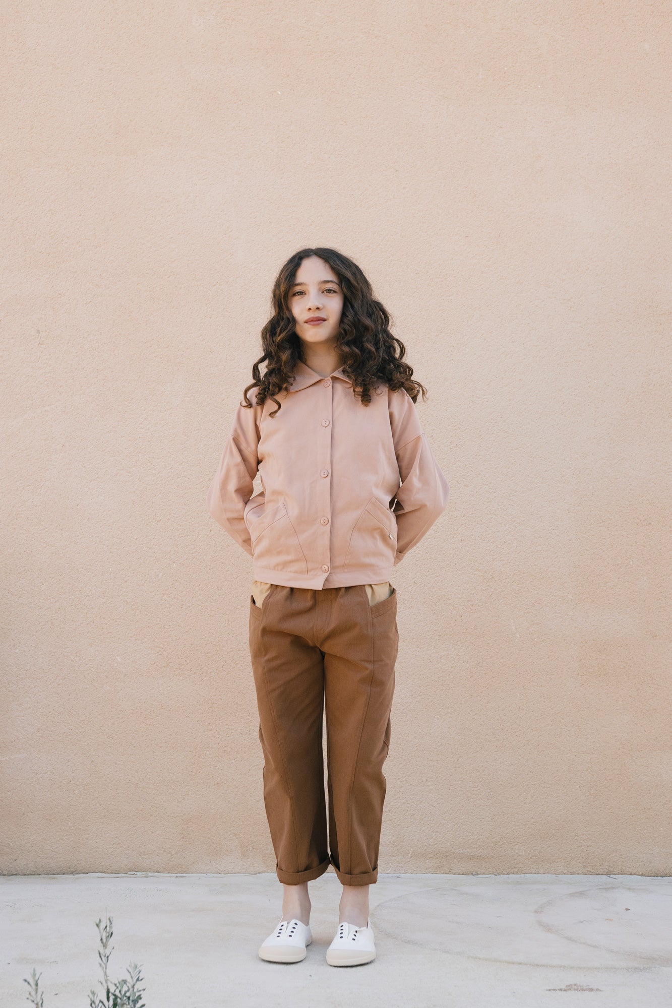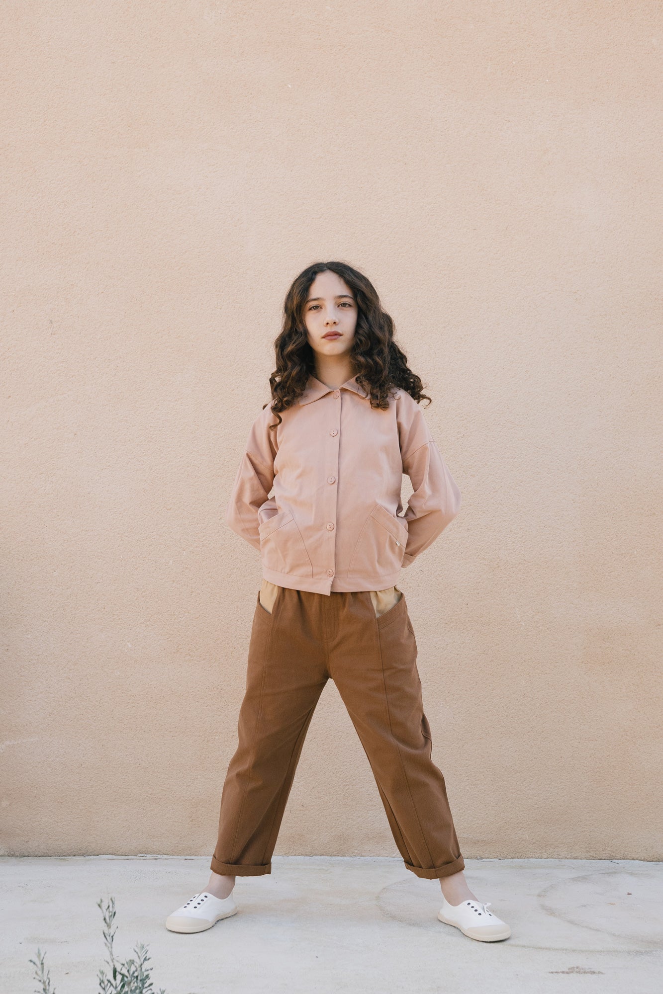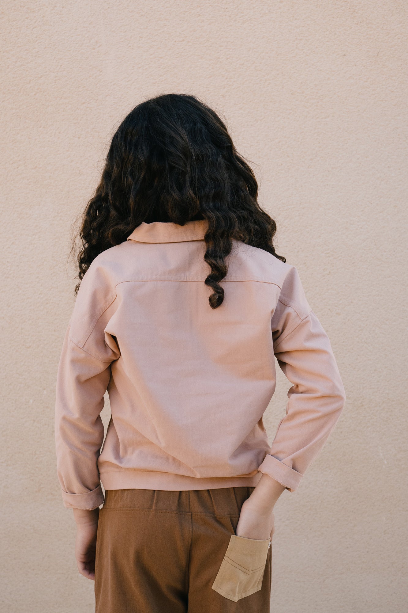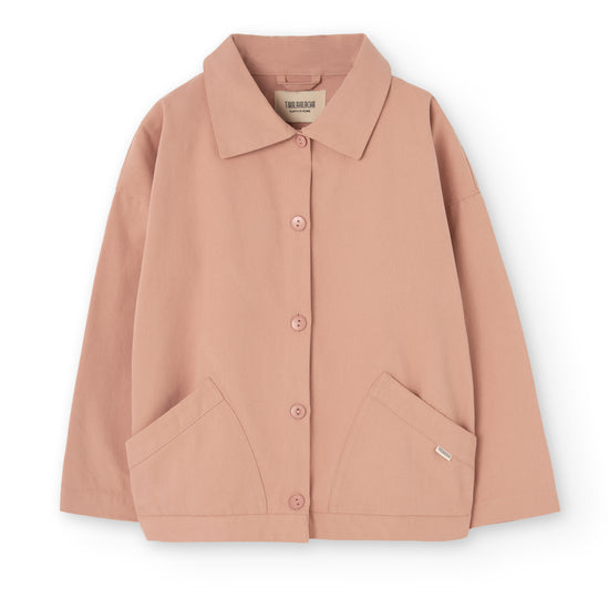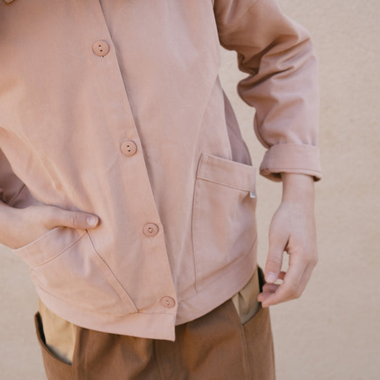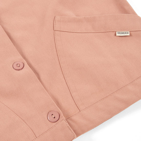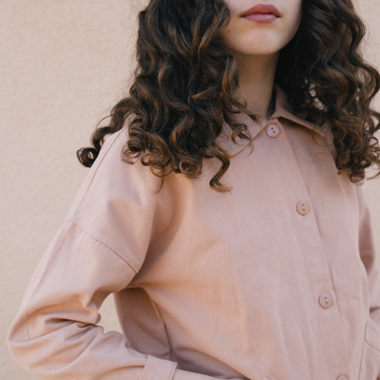 Designed with a relaxed silhouette and adjustable wear in mind, the Aiko jacket is the kids version of our Aude jacket, created for everyday movement and comfort. Choosing one size up allows for a more oversized fit and longer use as they grow. Constructed from durable organic cotton twill with a soft, peach-skin feel, it balances resilience and comfort. Retro-inspired details, natural corozo buttons and front pockets complete a thoughtful, versatile jacket ideal for transitional weather. Dusty pink is sweet and gentle and communicates tenderness and kindness.