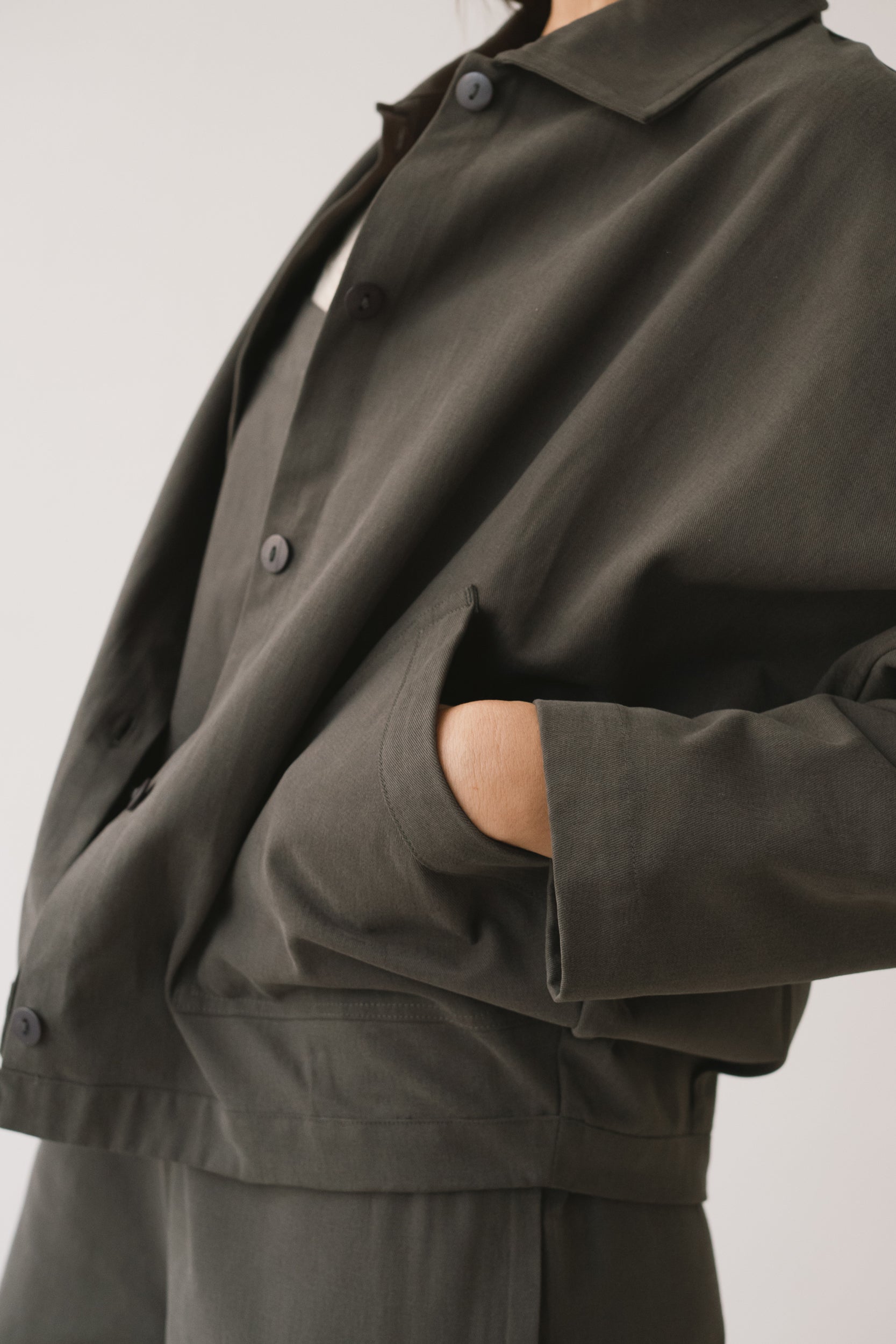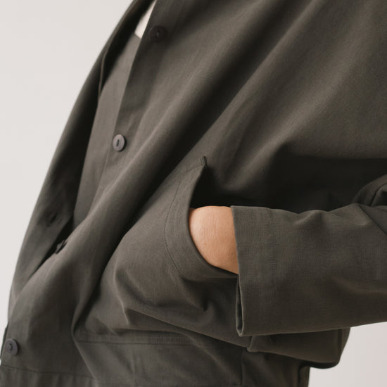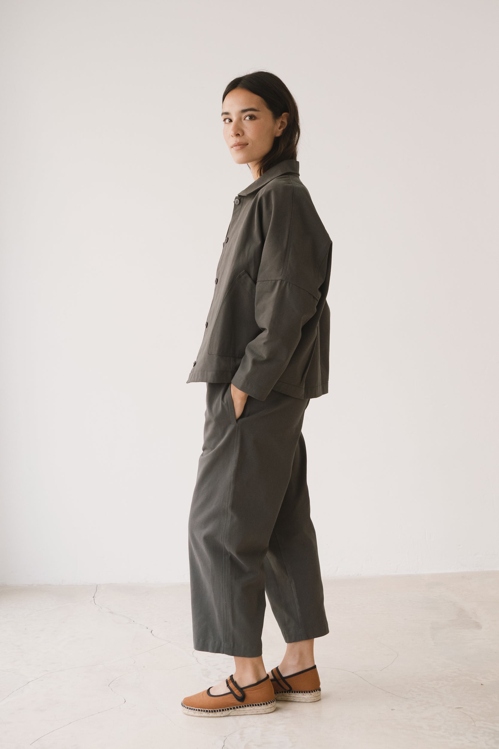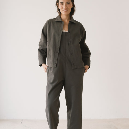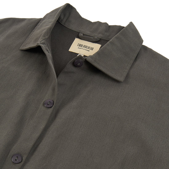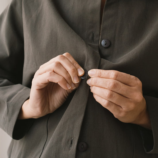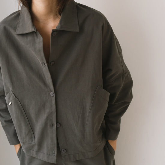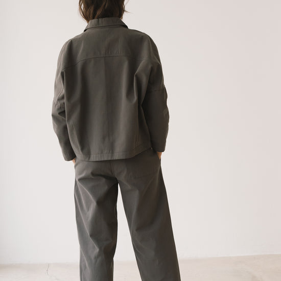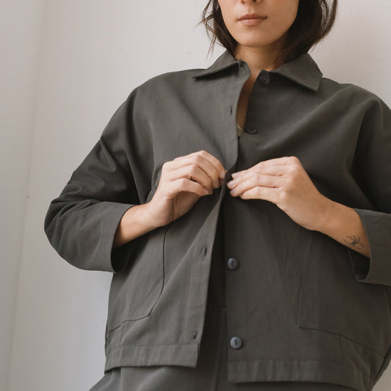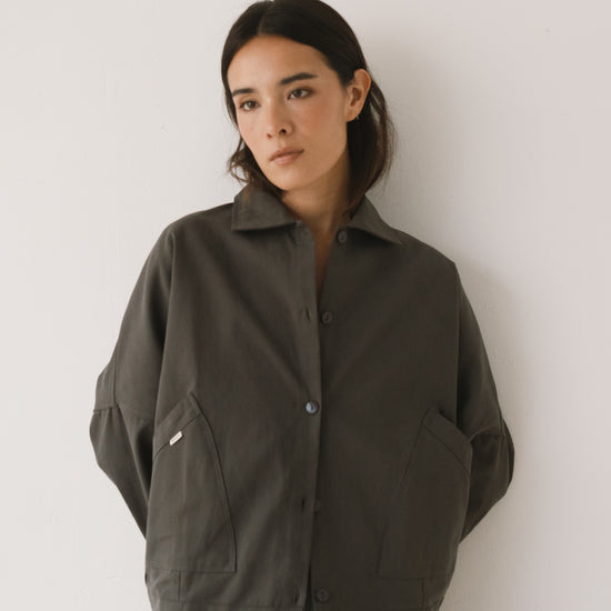 Aude is the new version of our Henny jacket, one of our bestsellers. A thoughtful reinterpretation that keeps its oversized fit with dropped shoulders, now updated with a subtle design change: a shirt collar that adds a more structured and versatile feel. Crafted from organic cotton twill—the same durable yet soft fabric used in our Ayrin overalls—Aude is the perfect jacket for the in-between seasons. Wide pockets and tone-dyed, biodegradable natural corozo buttons complete a timeless, long-lasting piece designed to be worn and loved for many years to come. Grey is a long-lasting, timeless shade that brings a sense of understated, minimalist elegance.