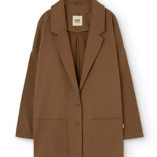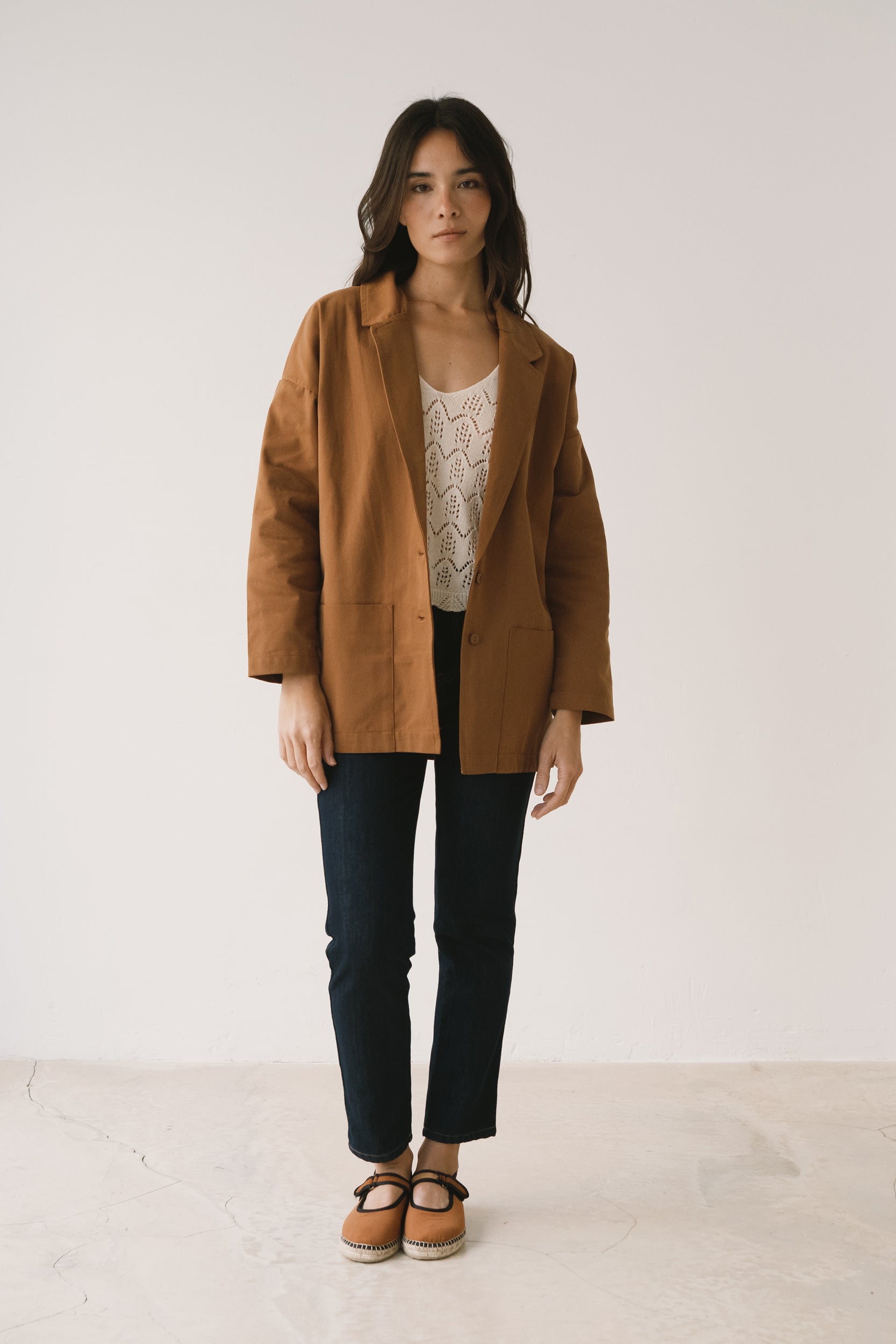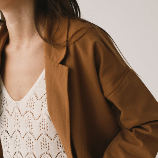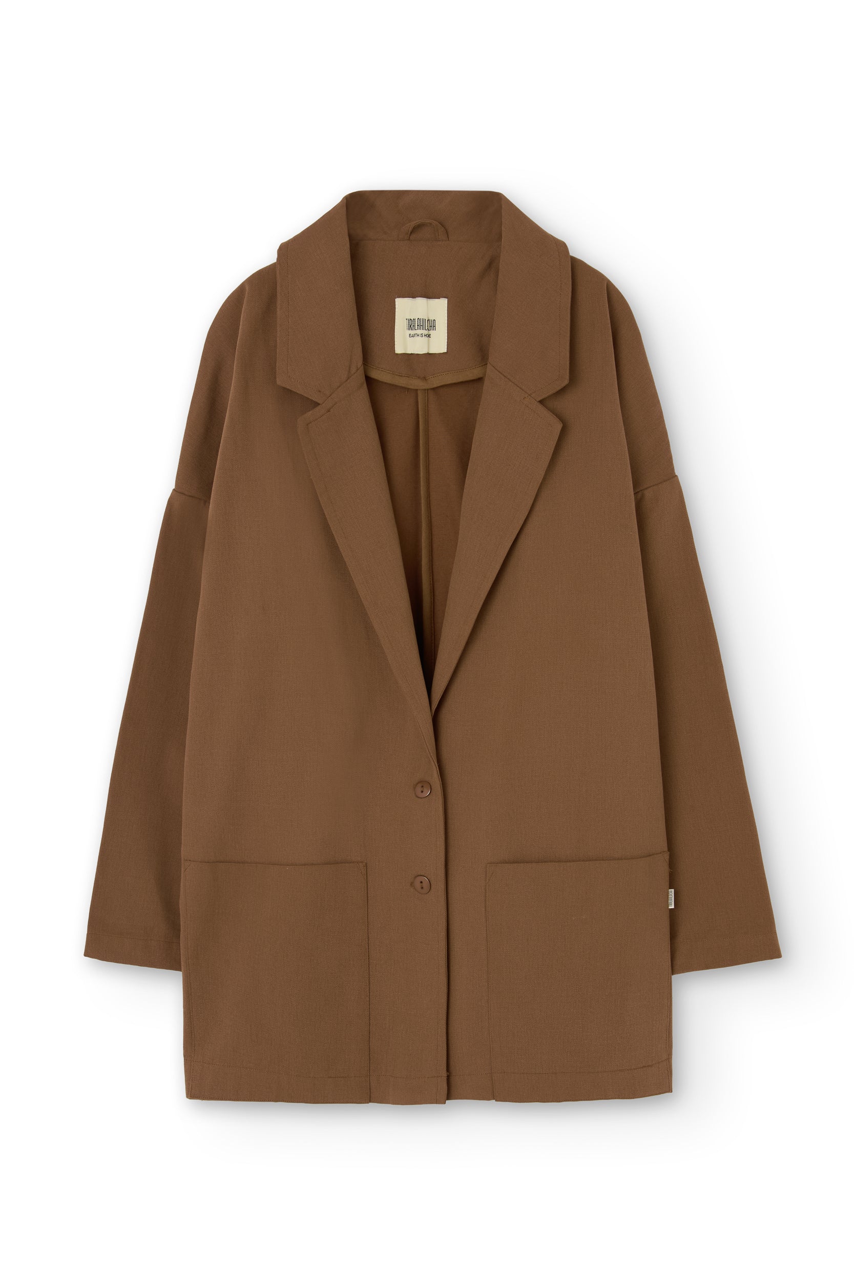 Crafted from the same soft yet durable fabric as our Raíces overalls and jackets, the Anne tailored jacket balances structure and comfort with ease. Two patch pockets and natural corozo buttons enhance its honest, timeless appeal. Marking a new chapter at Tiralahilacha, this is our first tailored jacket—reimagined through a conscious, relaxed perspective. A classic lapel collar and dropped shoulders create shape without rigidity. Style it with our jeans or Henna fluid trousers for an effortless look, or layer it over the Ayrin jumpsuit for a more refined ensemble. Brown evokes warmth, connection to the earth, and stability. A cozy and timeless shade that brings balance and depth to any look.