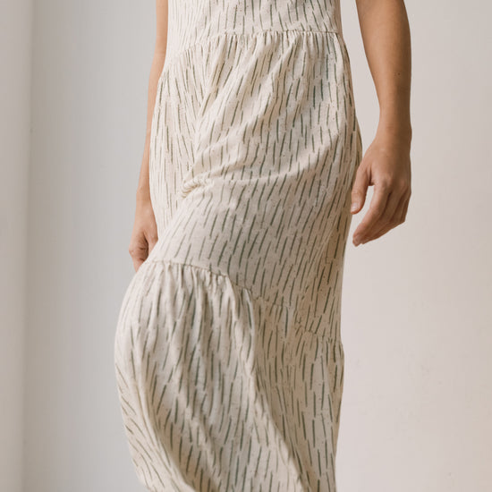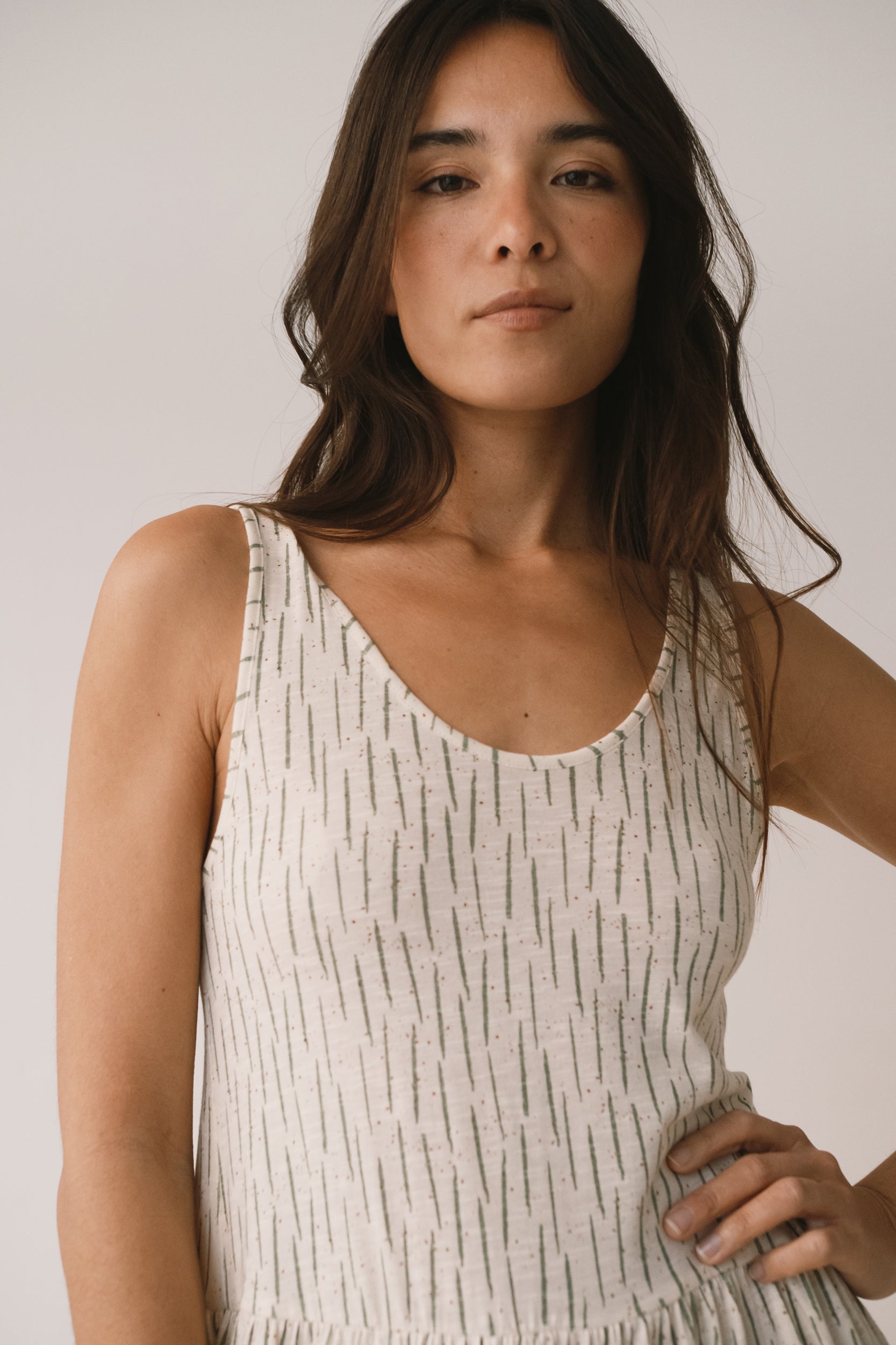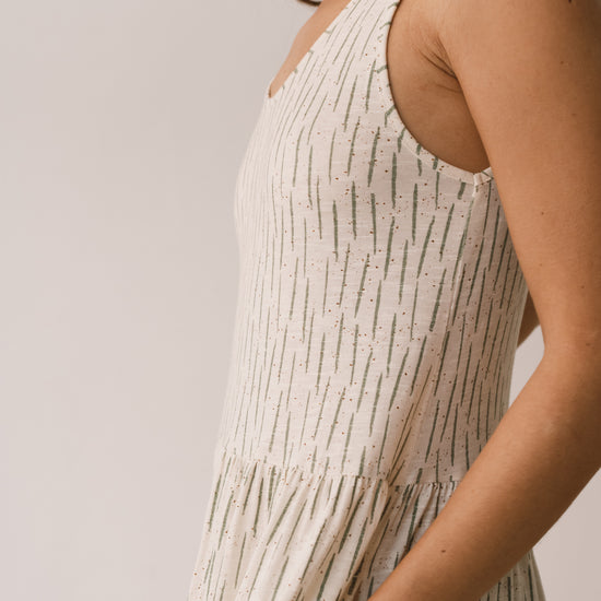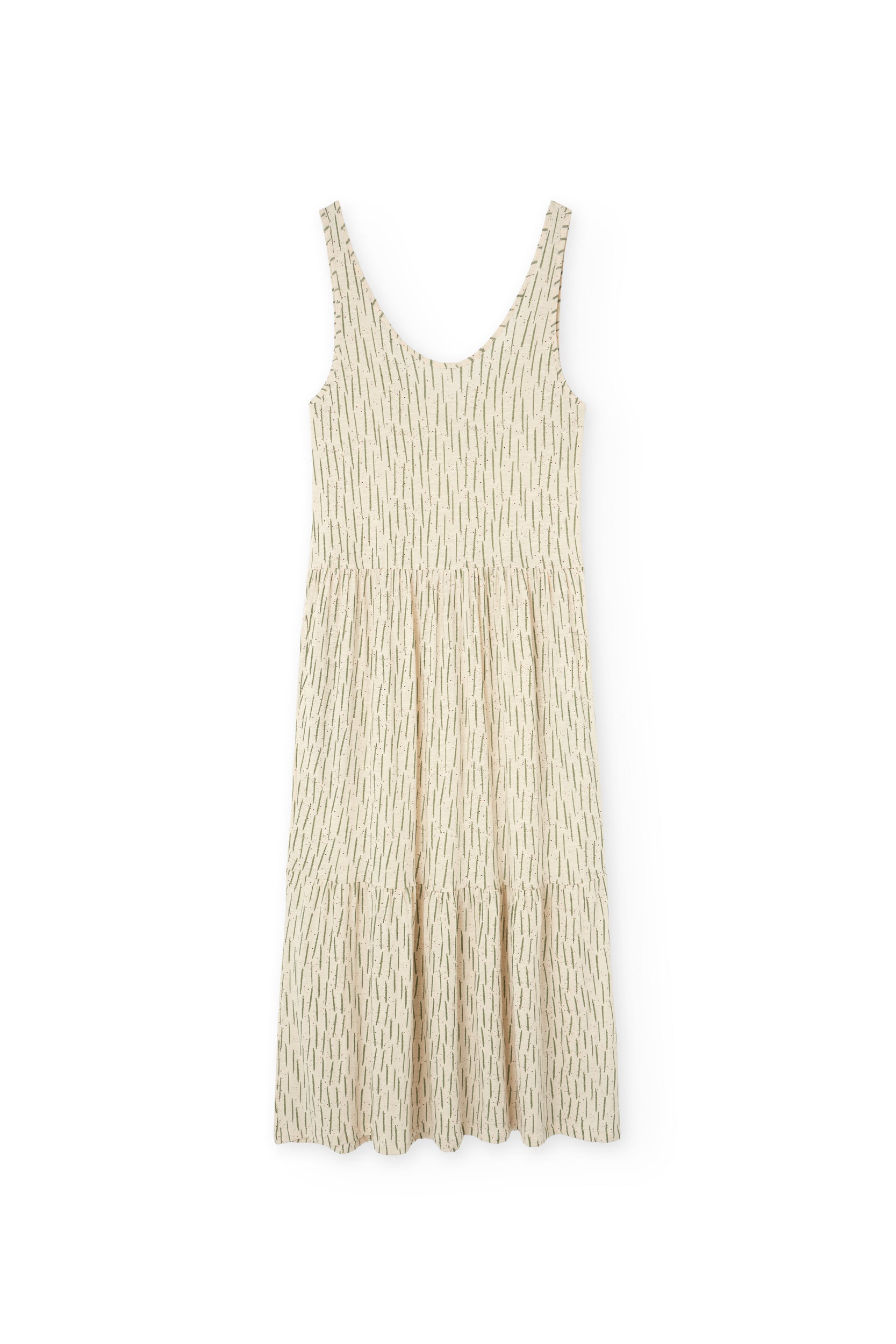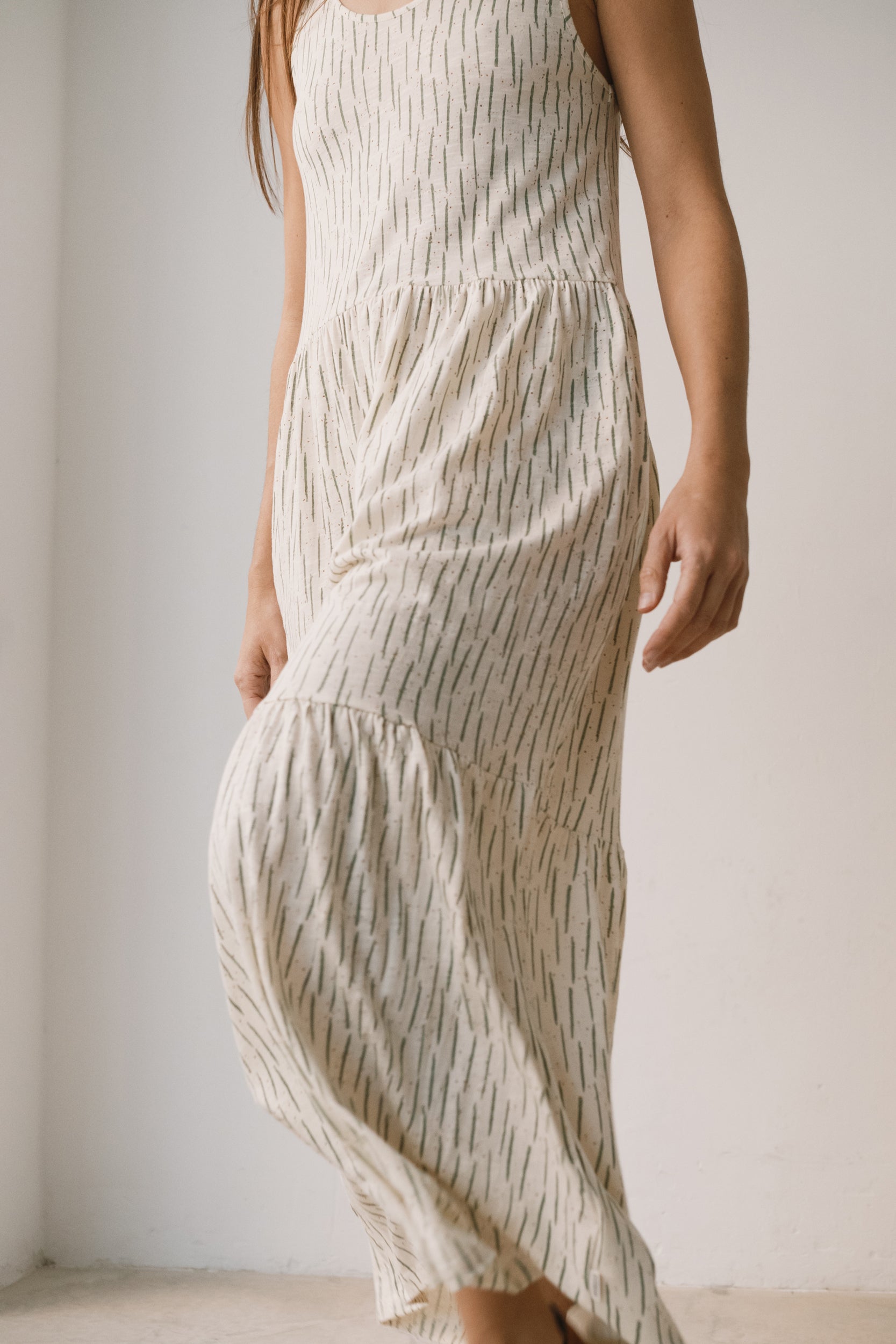 Light, effortless and easy to wear, the Alice long ruffled dress is made for warm summer days. Its flowing silhouette moves naturally with the body, while the deeper back neckline adds a refined, feminine detail without compromising comfort. Discreet side pockets complete the design with practical ease. Cut from a soft blend of organic cotton and modal, the fabric drapes beautifully and feels cool and breathable against the skin. Whether styled with sandals for a coastal walk or worn to a relaxed evening gathering, it’s a timeless piece designed for slow, sun-filled days. Meadow is a print that evokes the calm of grass gently swaying in the wind. Its soft, natural green tones connect us to the earth, bringing freshness, balance and a sense of serene well-being to our looks.