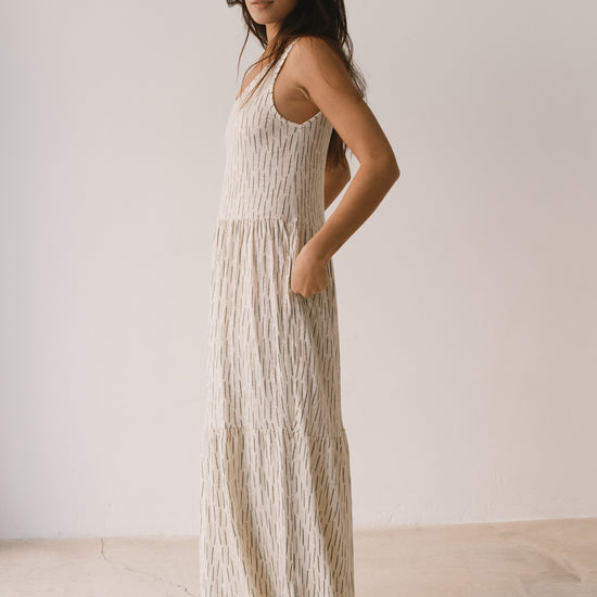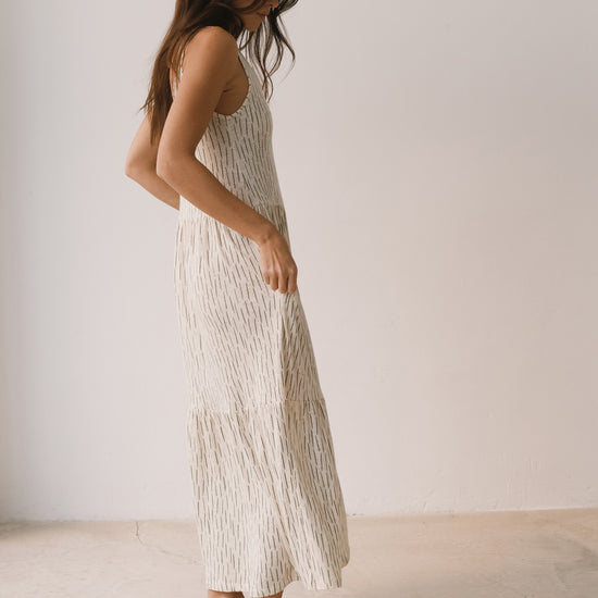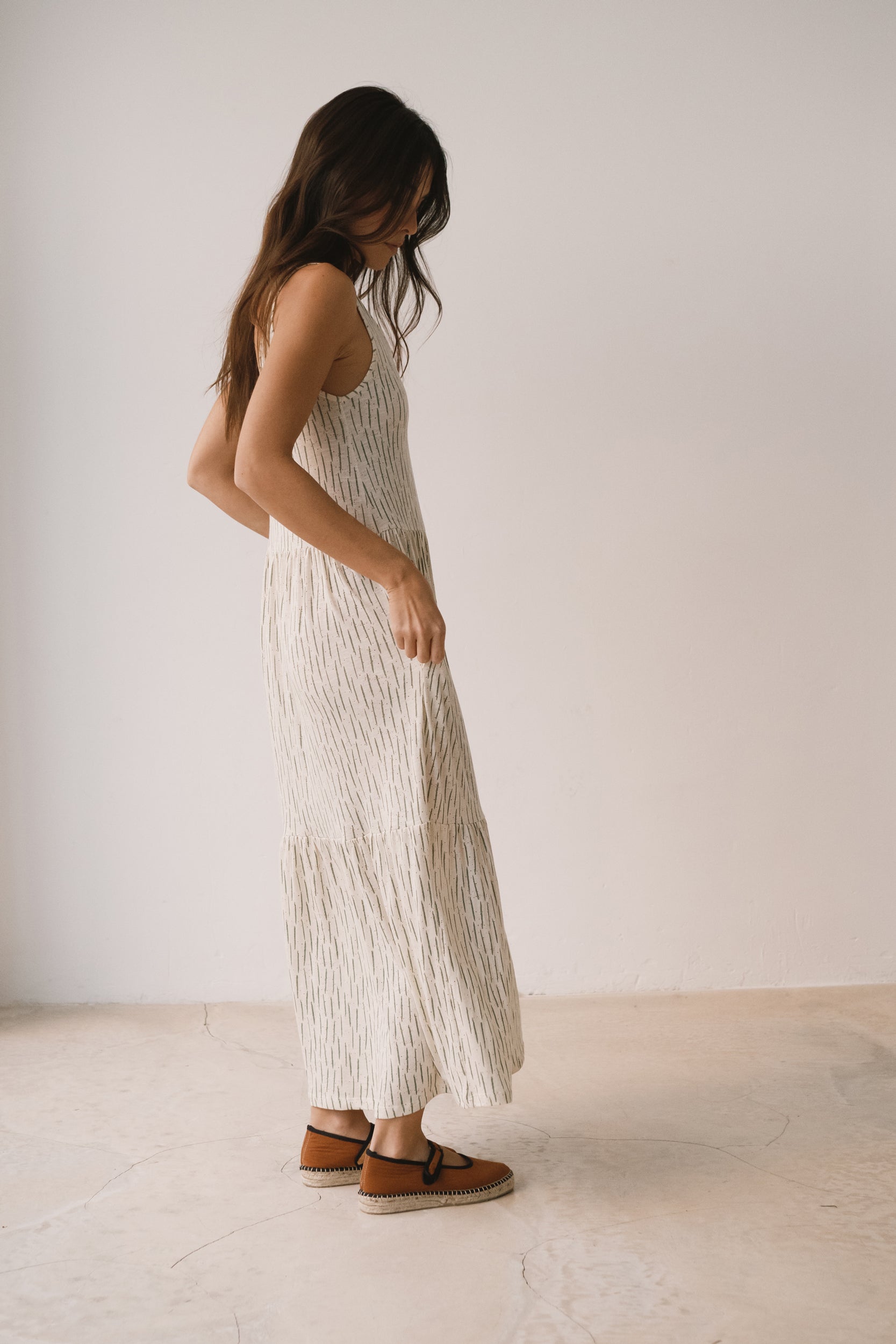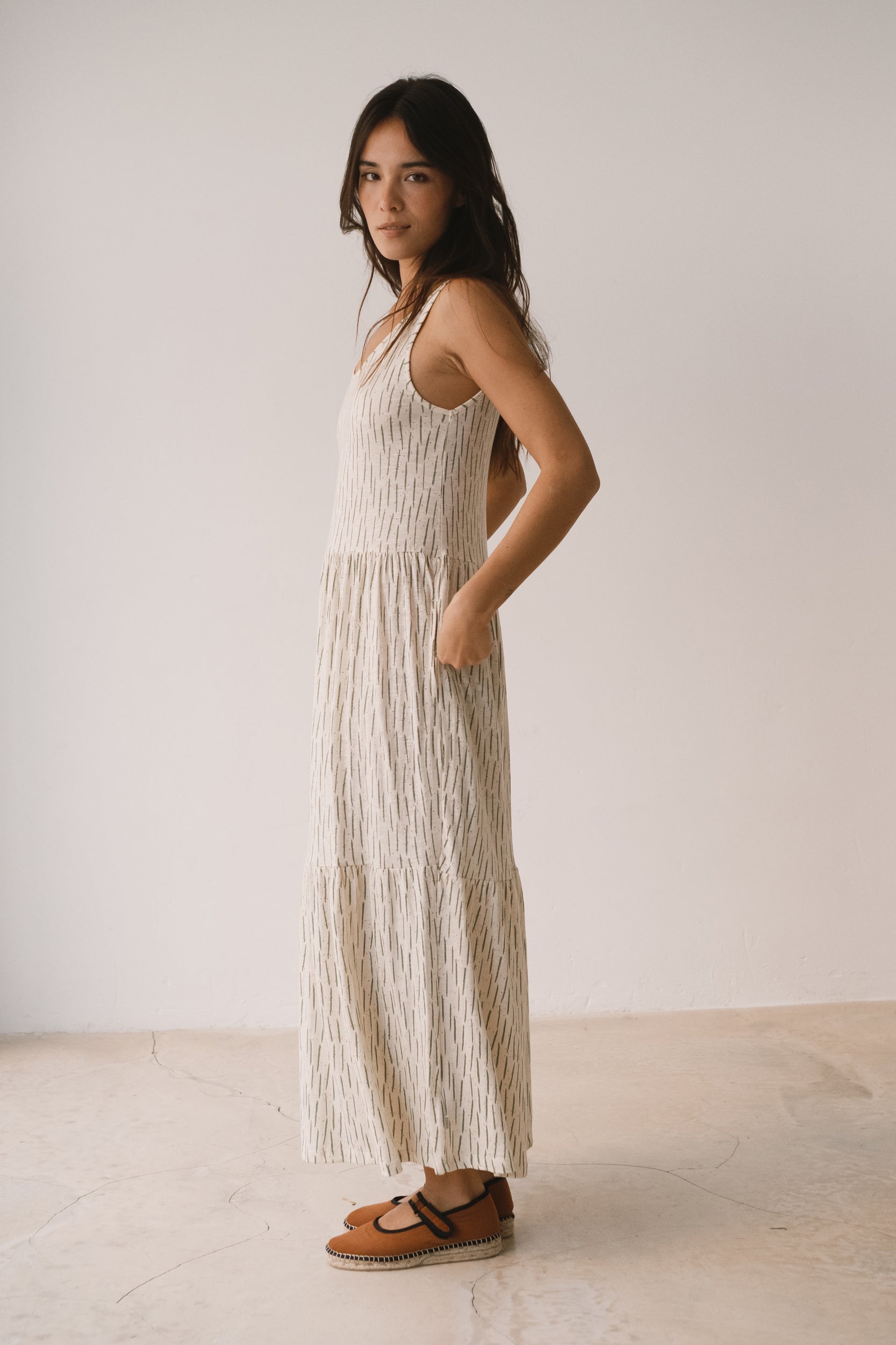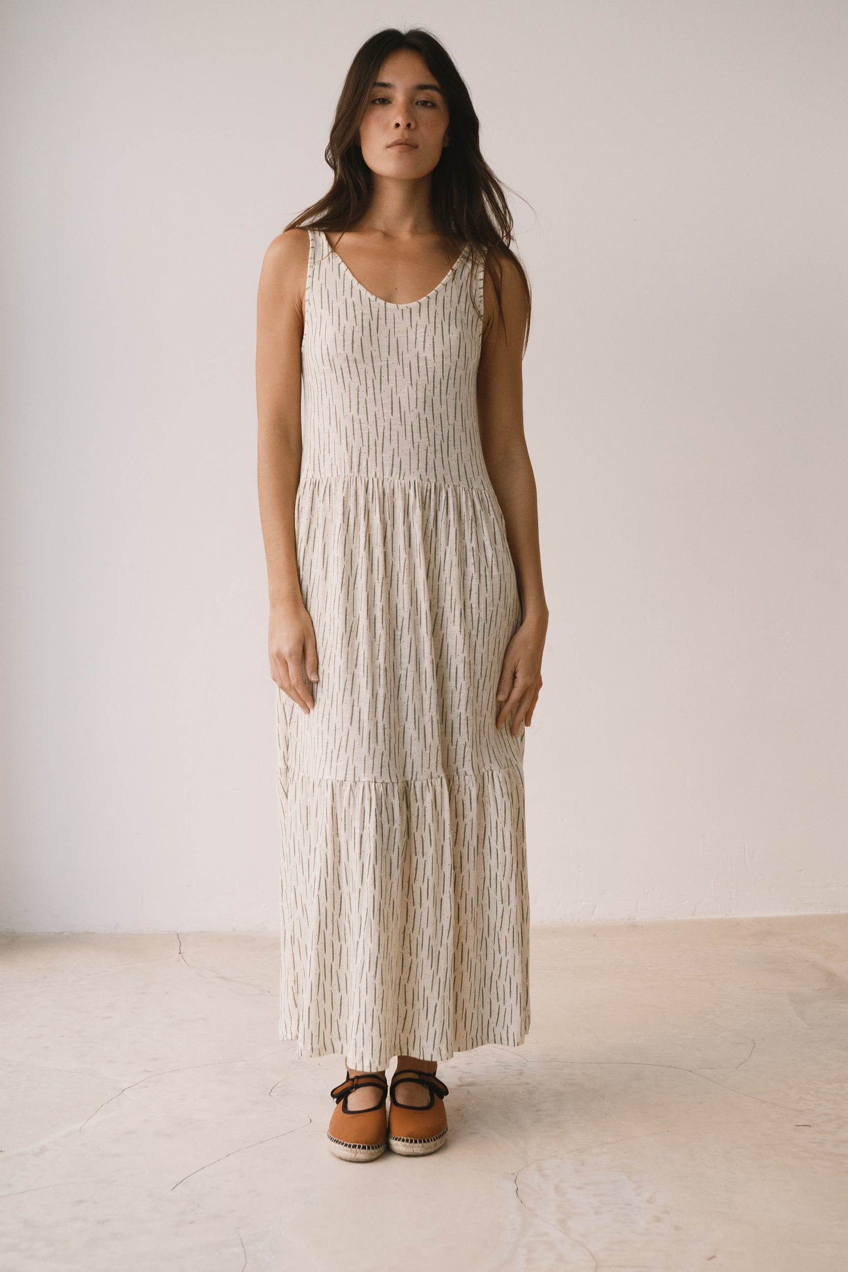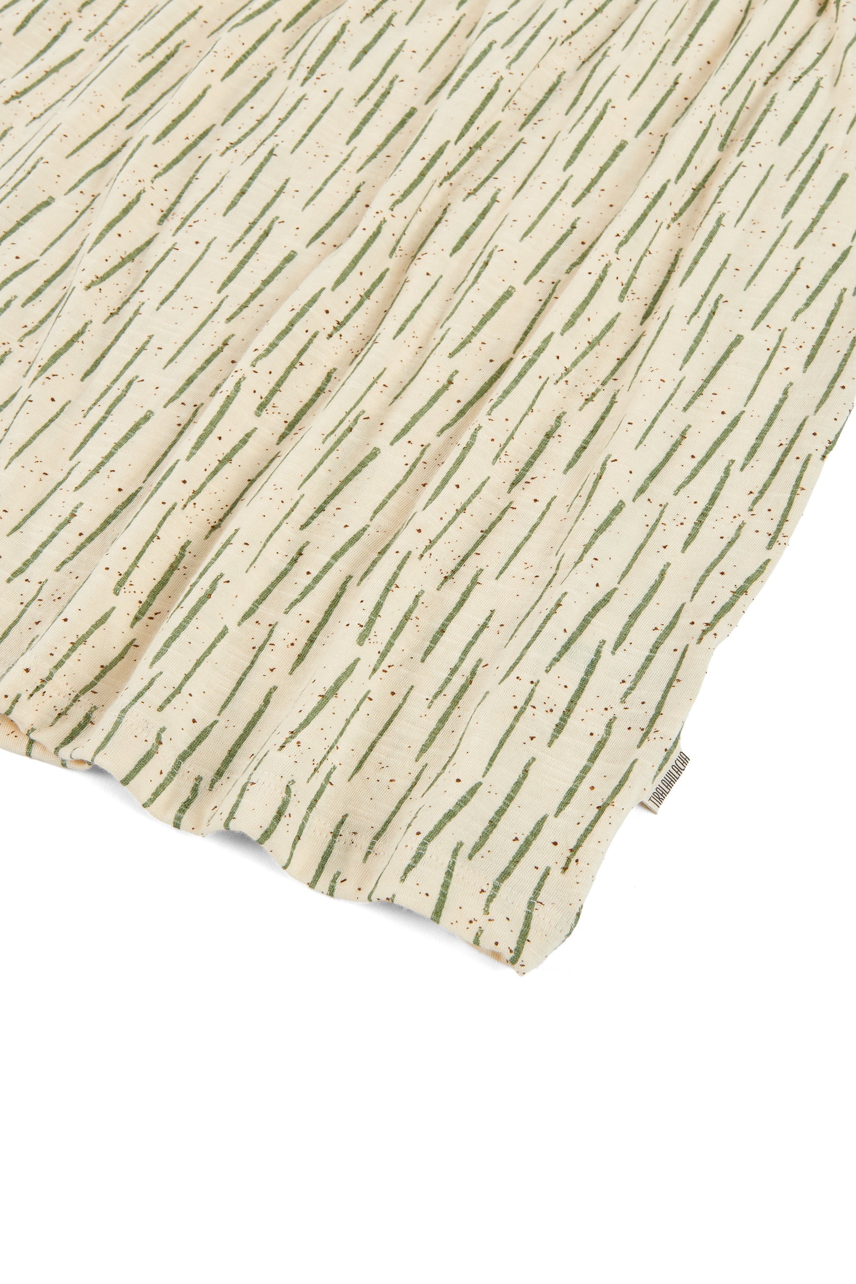 Light, effortless and easy to wear, the Alice long ruffled dress is made for warm summer days. Its flowing silhouette moves naturally with the body, while the deeper back neckline adds a refined, feminine detail without compromising comfort. Discreet side pockets complete the design with practical ease. Cut from a soft blend of organic cotton and modal, the fabric drapes beautifully and feels cool and breathable against the skin. Whether styled with sandals for a coastal walk or worn to a relaxed evening gathering, it’s a timeless piece designed for slow, sun-filled days. Meadow is a print that evokes the calm of grass gently swaying in the wind. Its soft, natural green tones connect us to the earth, bringing freshness, balance and a sense of serene well-being to our looks.