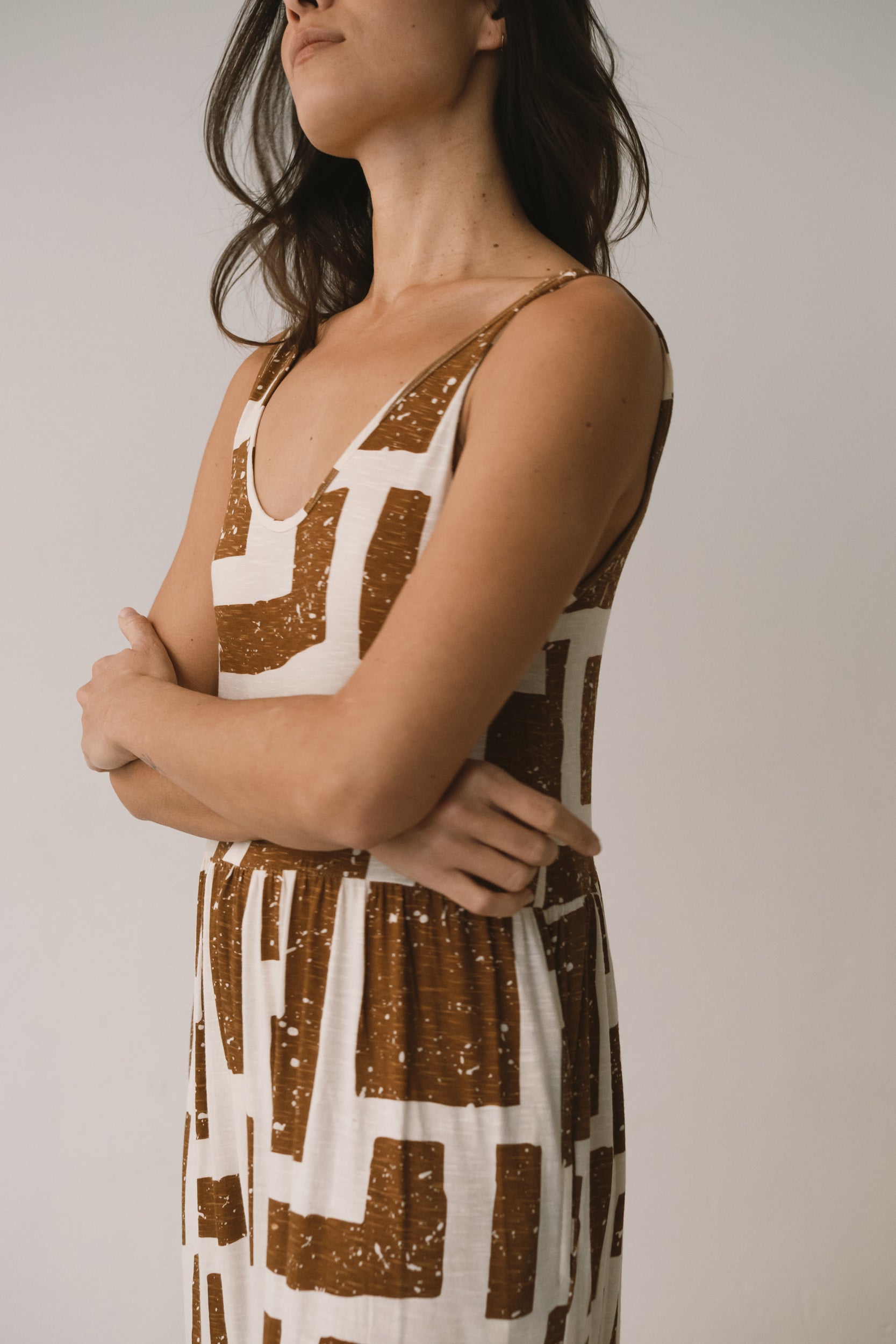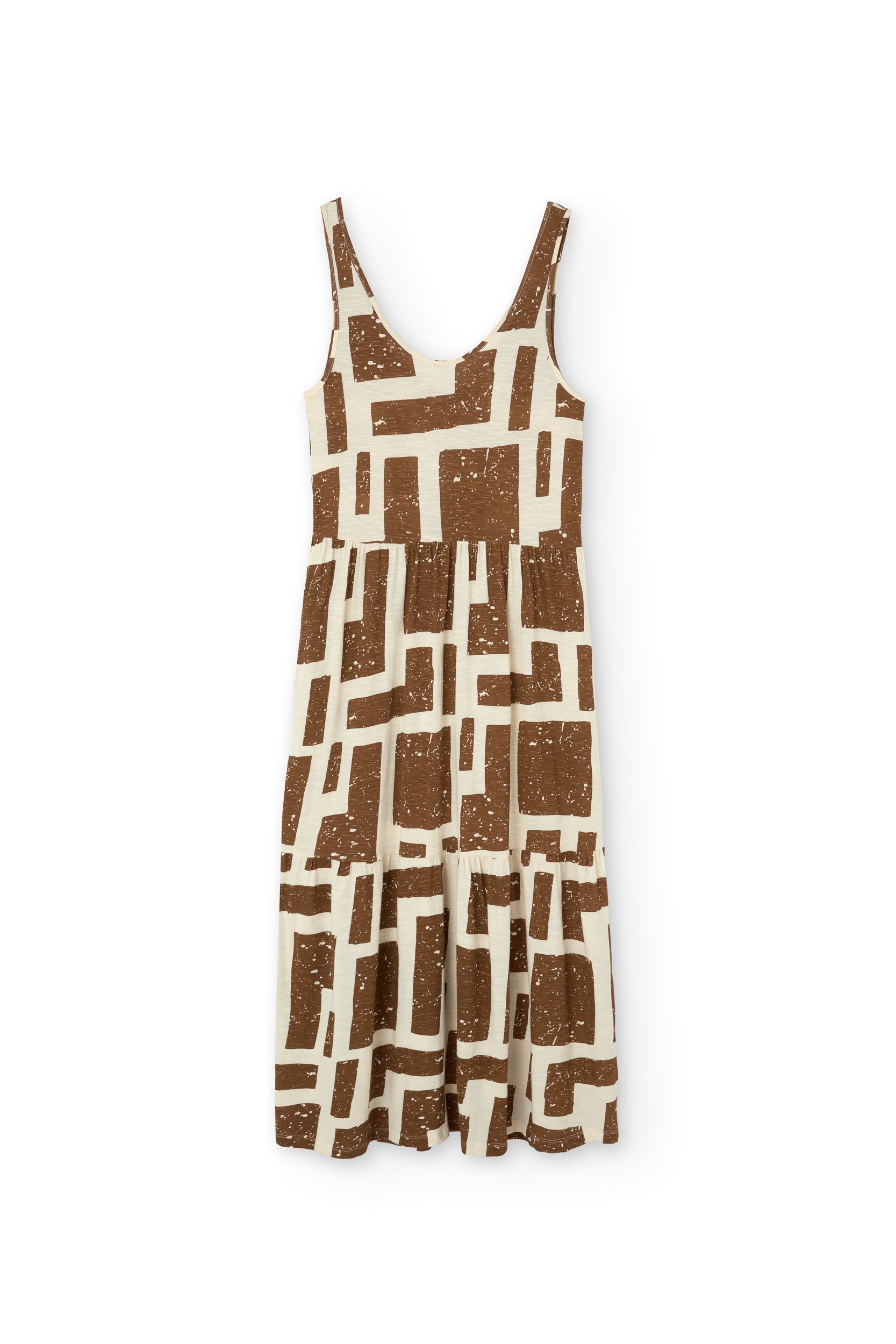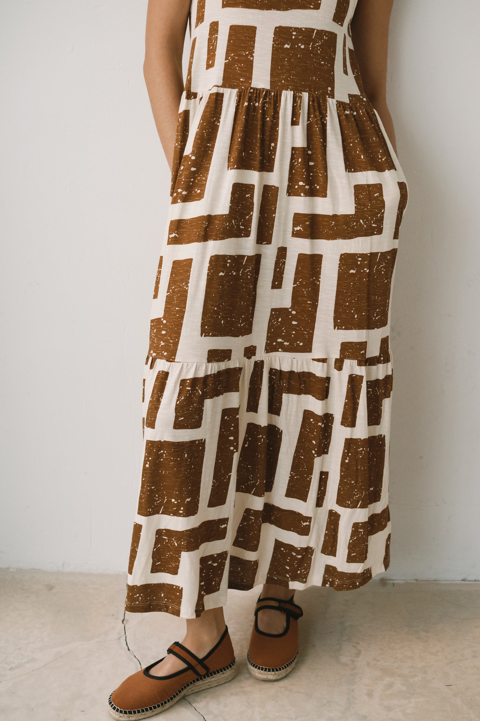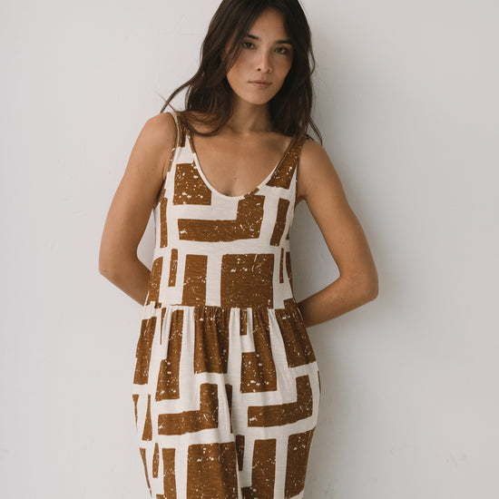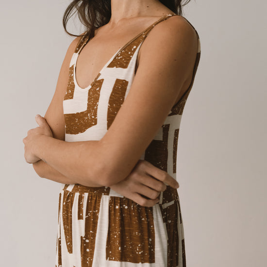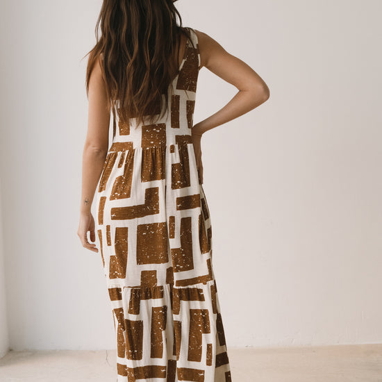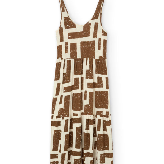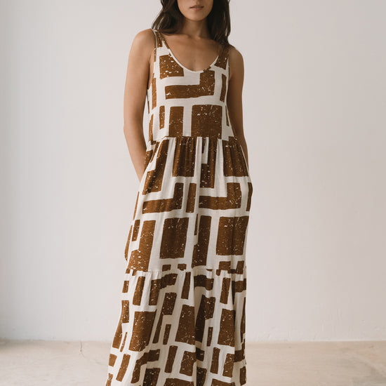 Crafted from a soft blend of organic cotton and modal, the Alice long ruffled dress feels fresh, lightweight and wonderfully gentle on the skin—ideal for the warmest days. Its fluid silhouette is complemented by a deeper back neckline, adding a subtle touch of femininity while preserving comfort. Side pockets introduce everyday practicality to a piece designed to move with you effortlessly. A versatile dress, equally suited to seaside strolls in sandals or relaxed dinners under a starry summer sky. Its brown geometric pattern is inspired by the textures of tree bark, creating a quiet connection with nature wherever you are. The print conveys warmth and stability, bringing balance and depth to any look.