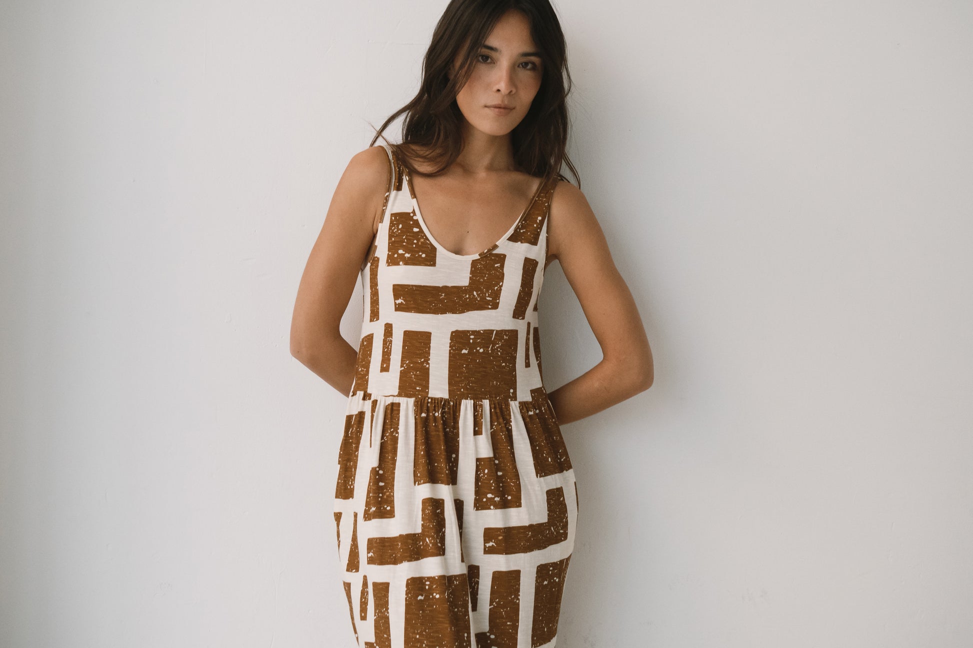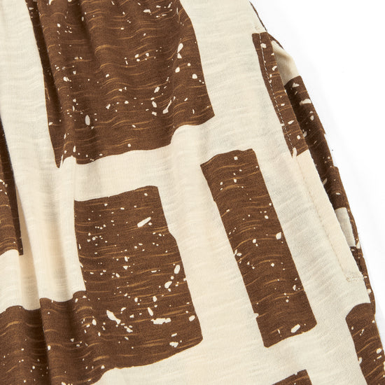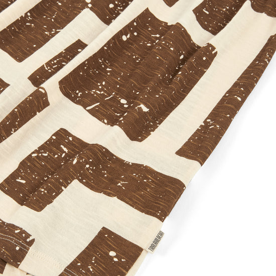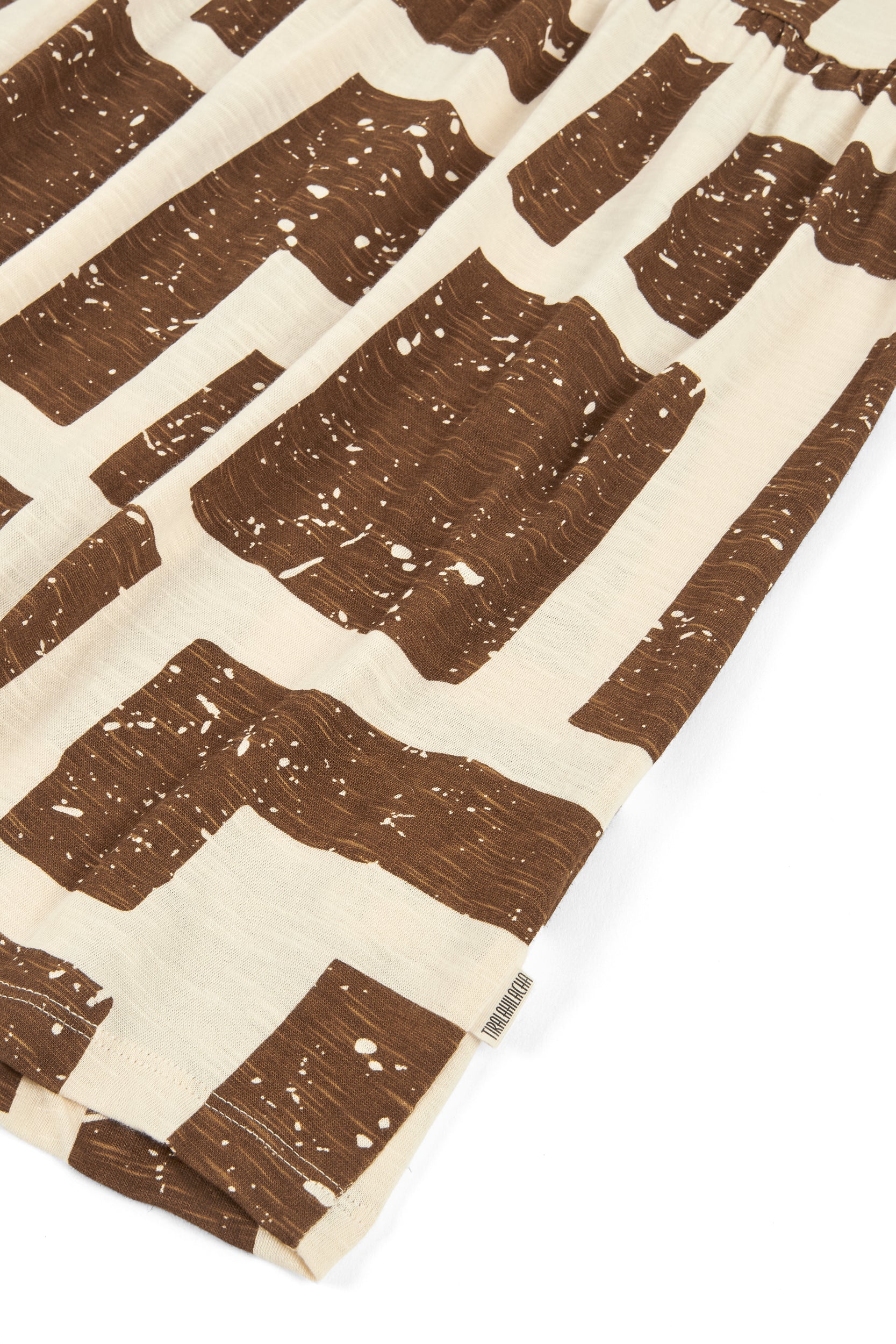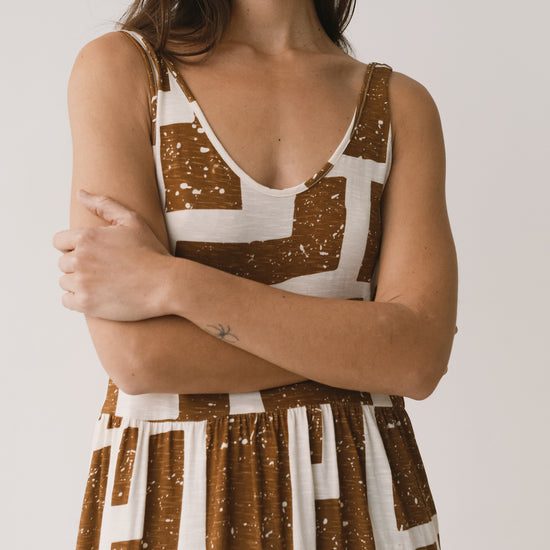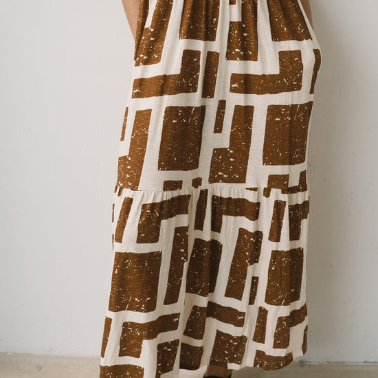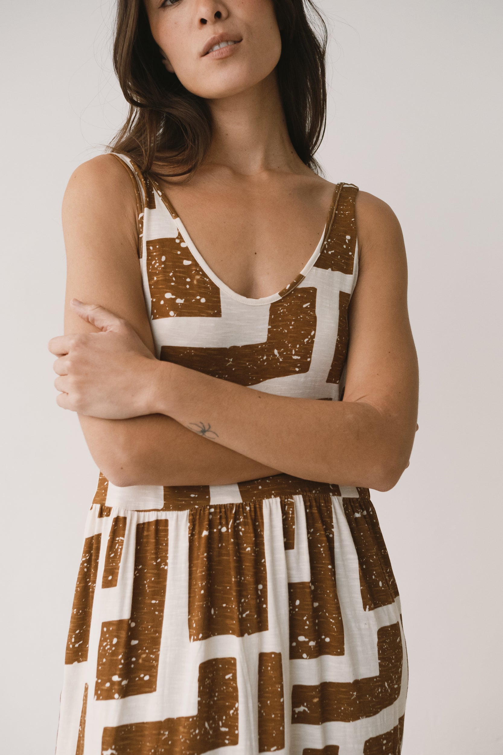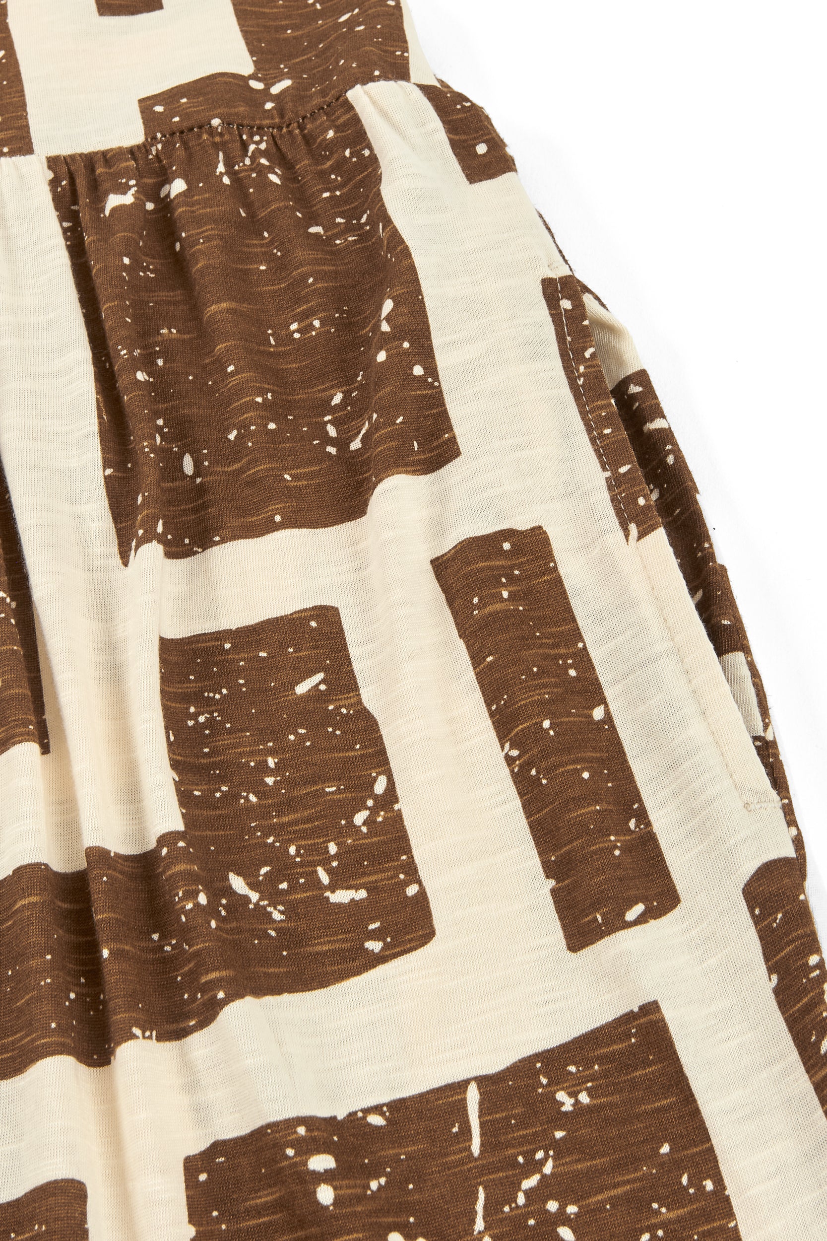 Crafted from a soft blend of organic cotton and modal, the Alice long ruffled dress feels fresh, lightweight and wonderfully gentle on the skin—ideal for the warmest days. Its fluid silhouette is complemented by a deeper back neckline, adding a subtle touch of femininity while preserving comfort. Side pockets introduce everyday practicality to a piece designed to move with you effortlessly. A versatile dress, equally suited to seaside strolls in sandals or relaxed dinners under a starry summer sky. Its brown geometric pattern is inspired by the textures of tree bark, creating a quiet connection with nature wherever you are. The print conveys warmth and stability, bringing balance and depth to any look.