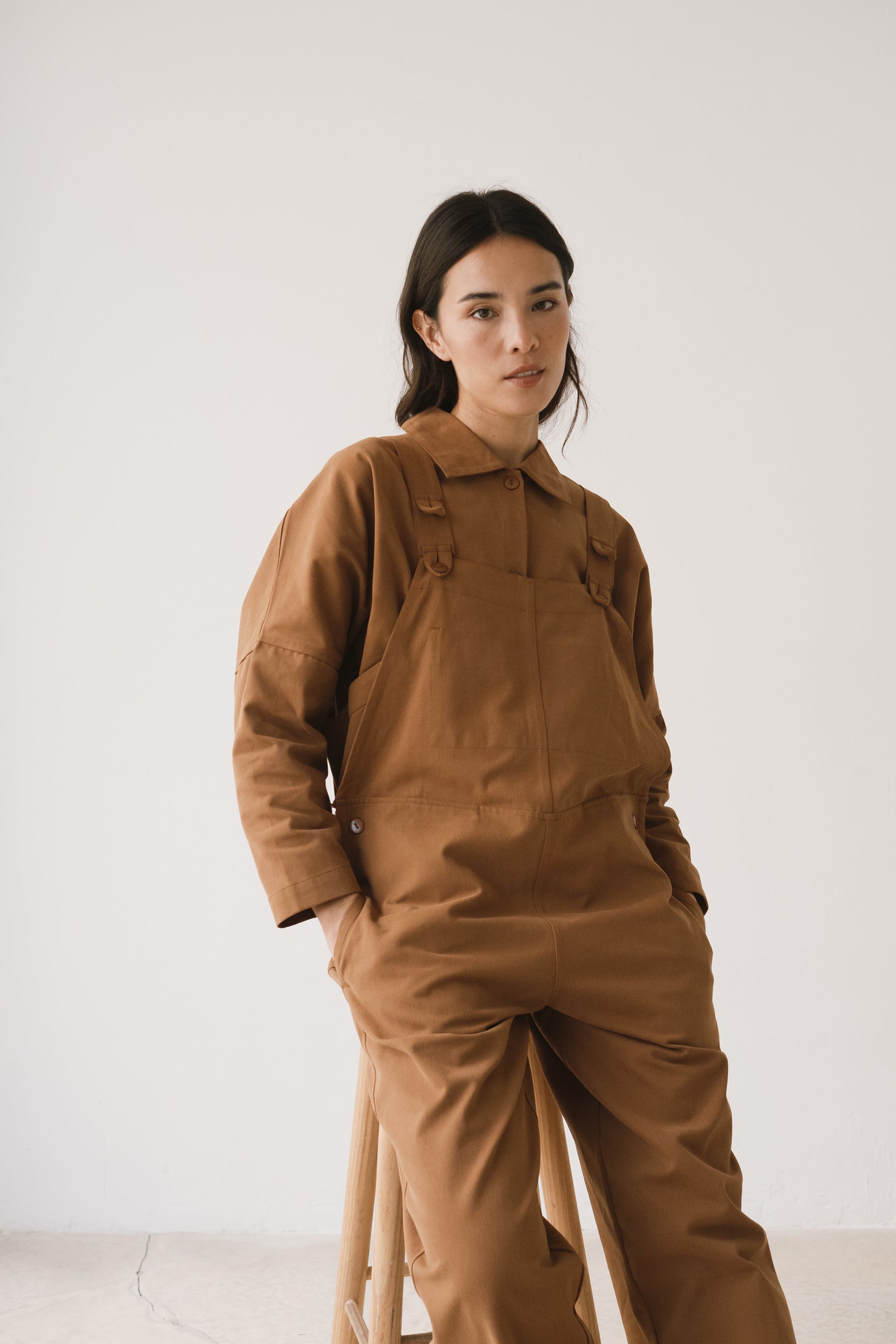 Ayrin is a worker-style jumpsuit created for everyday ease. With side pockets, a back pocket and a hidden front pocket, it offers thoughtful functionality while maintaining a streamlined silhouette. The adjustable straps make it a versatile piece that adapts effortlessly to your body and how you choose to wear it. Made from organic cotton twill, the fabric is structured and durable yet exceptionally soft to the touch—designed to remain a long-lasting staple in your wardrobe. Natural corozo buttons, biodegradable and plant-based, complete the design with a conscious finish. Brown evokes warmth, connection to the earth, and stability. A cozy and timeless shade that brings balance and depth to any look.