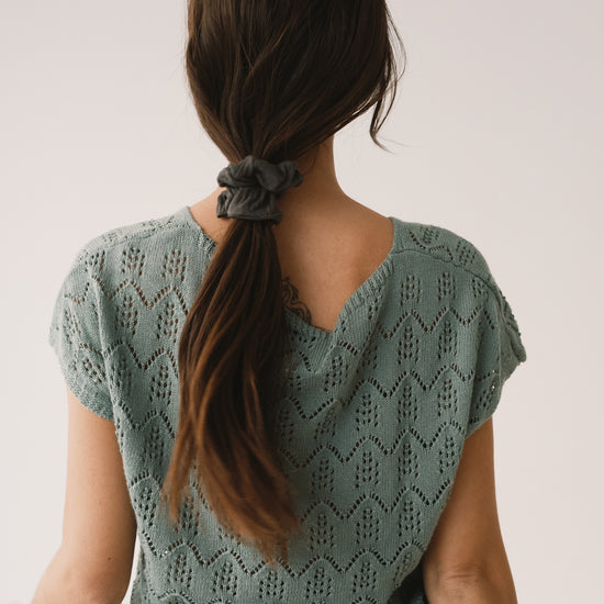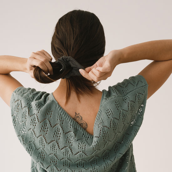 This scrunchie is created using an upcycling approach, repurposing leftover fabrics from our production cutting process to reduce waste and support a more circular system. Crafted from delicate, premium organic cotton, it carries the same natural quality as the rest of the collection. Anthracite grey is a long-lasting, timeless shade that brings a sense of understated, minimalist elegance.
