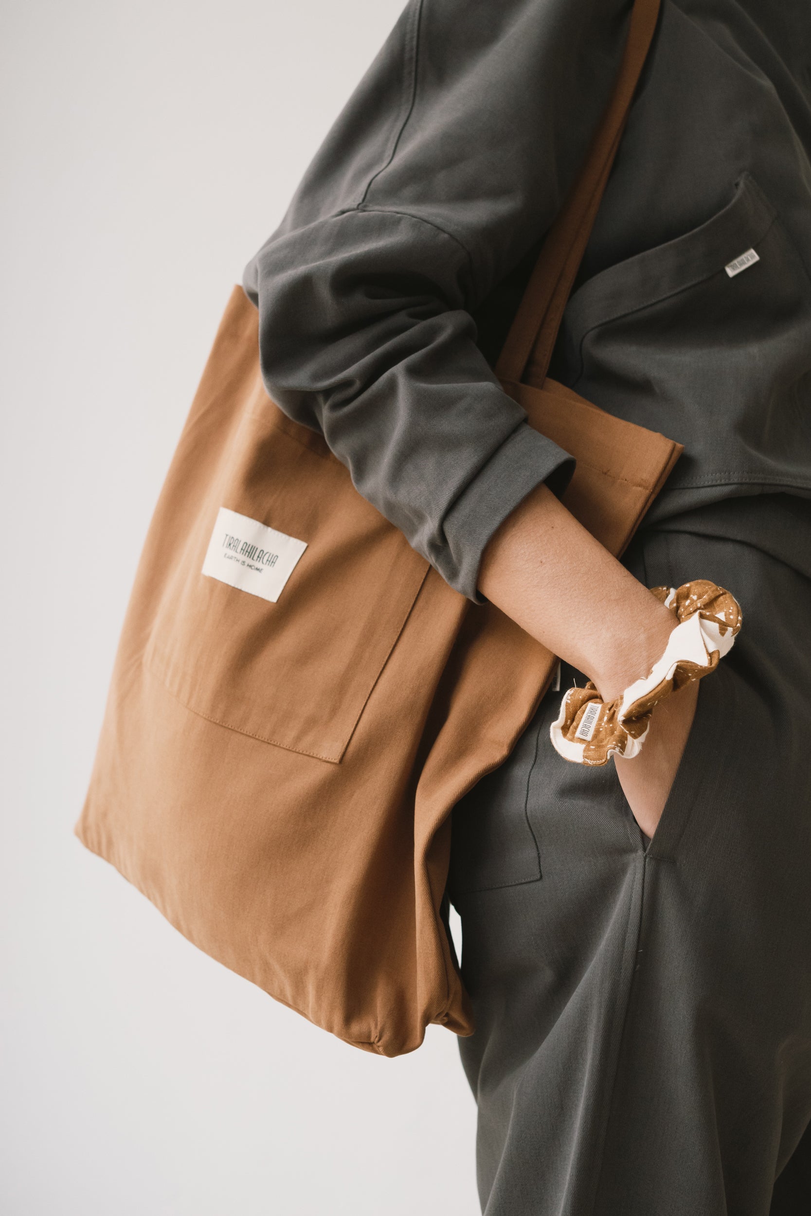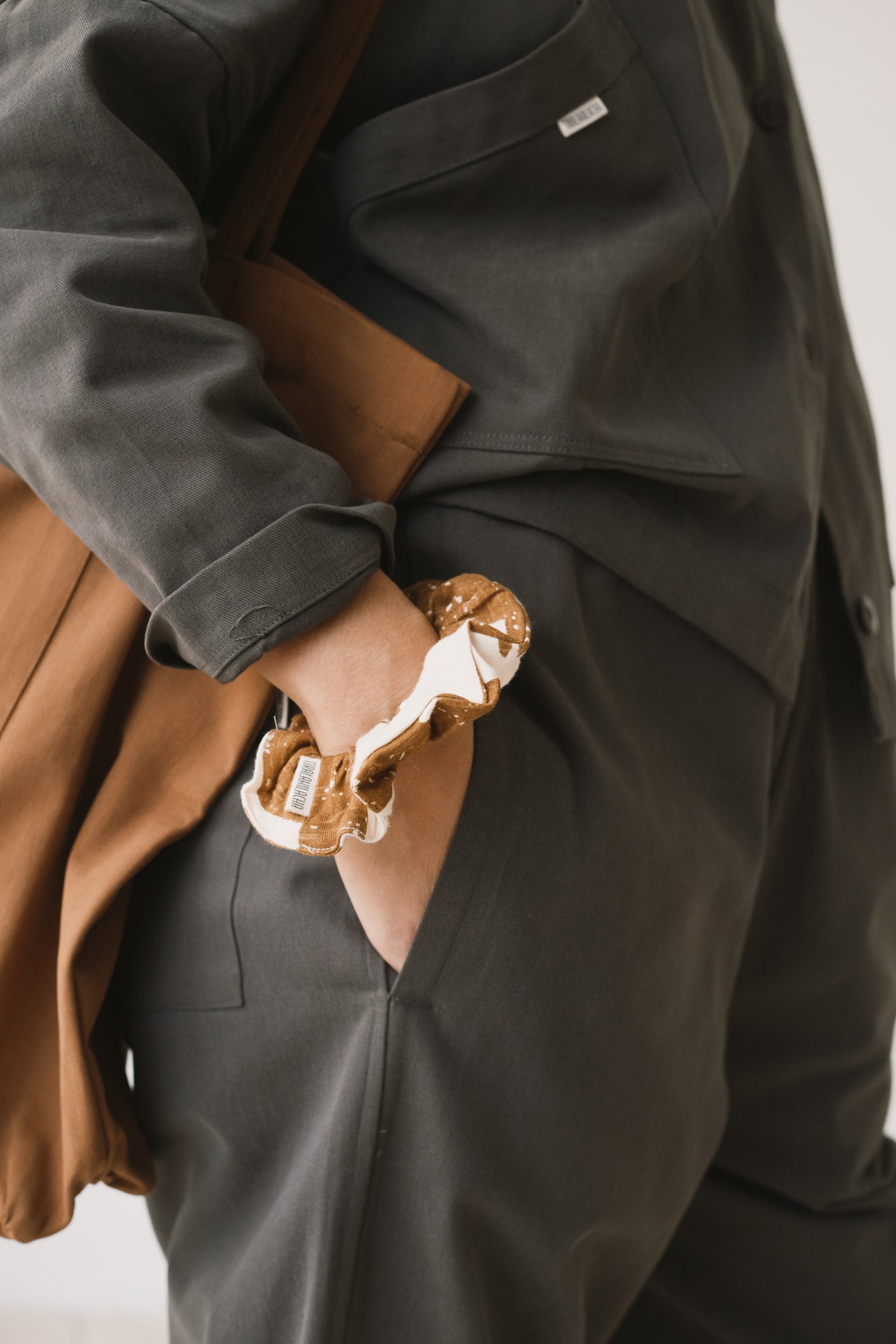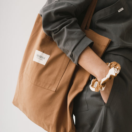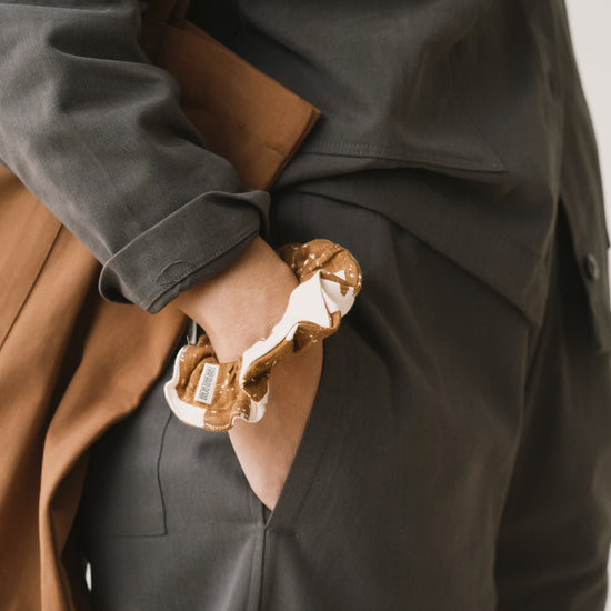Designed with circularity in mind, this scrunchie is crafted from surplus fabrics left over from our garment production. This upcycling method helps reduce waste and extend the life of valuable materials. It is made from a soft, premium-quality organic cotton that feels light and refined. Its brown geometric pattern is inspired by the textures of tree bark, creating a quiet connection with nature wherever you are. The print conveys warmth and stability, bringing balance and depth to any look.