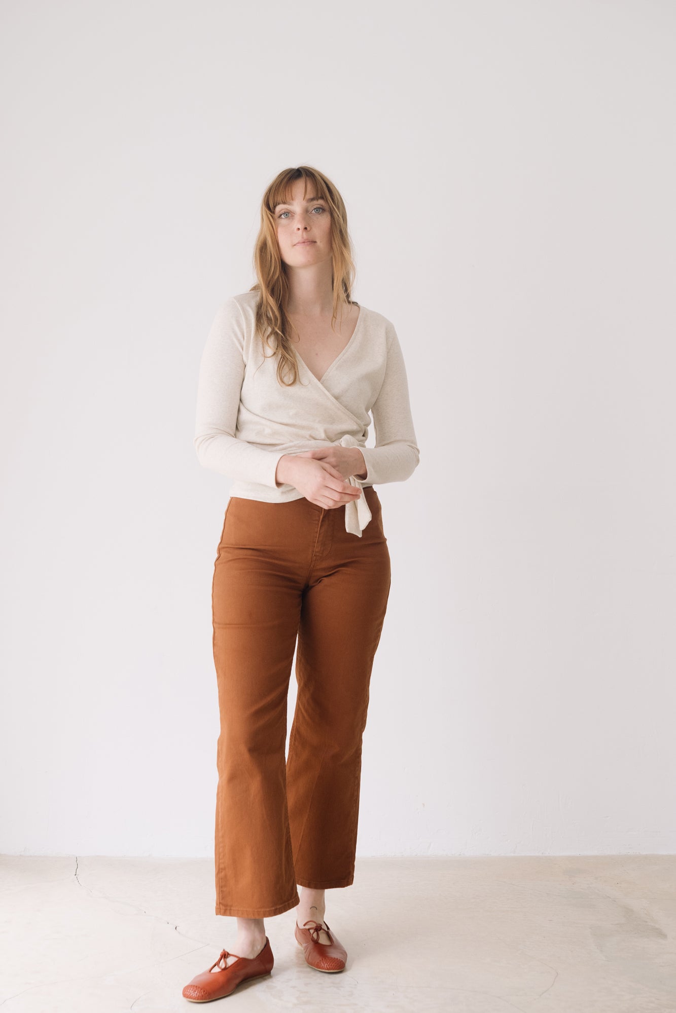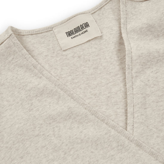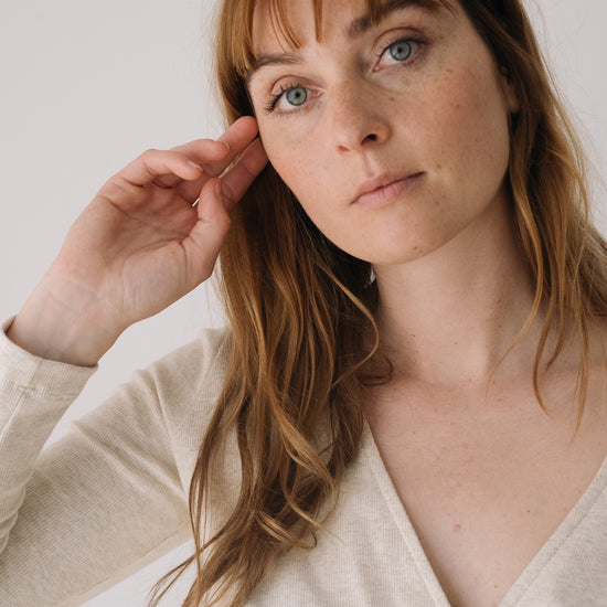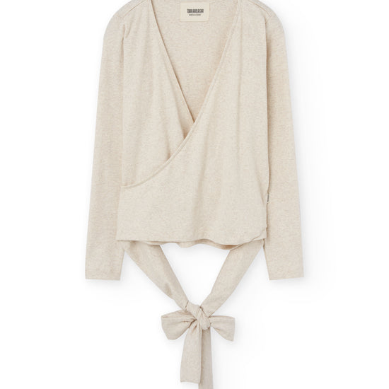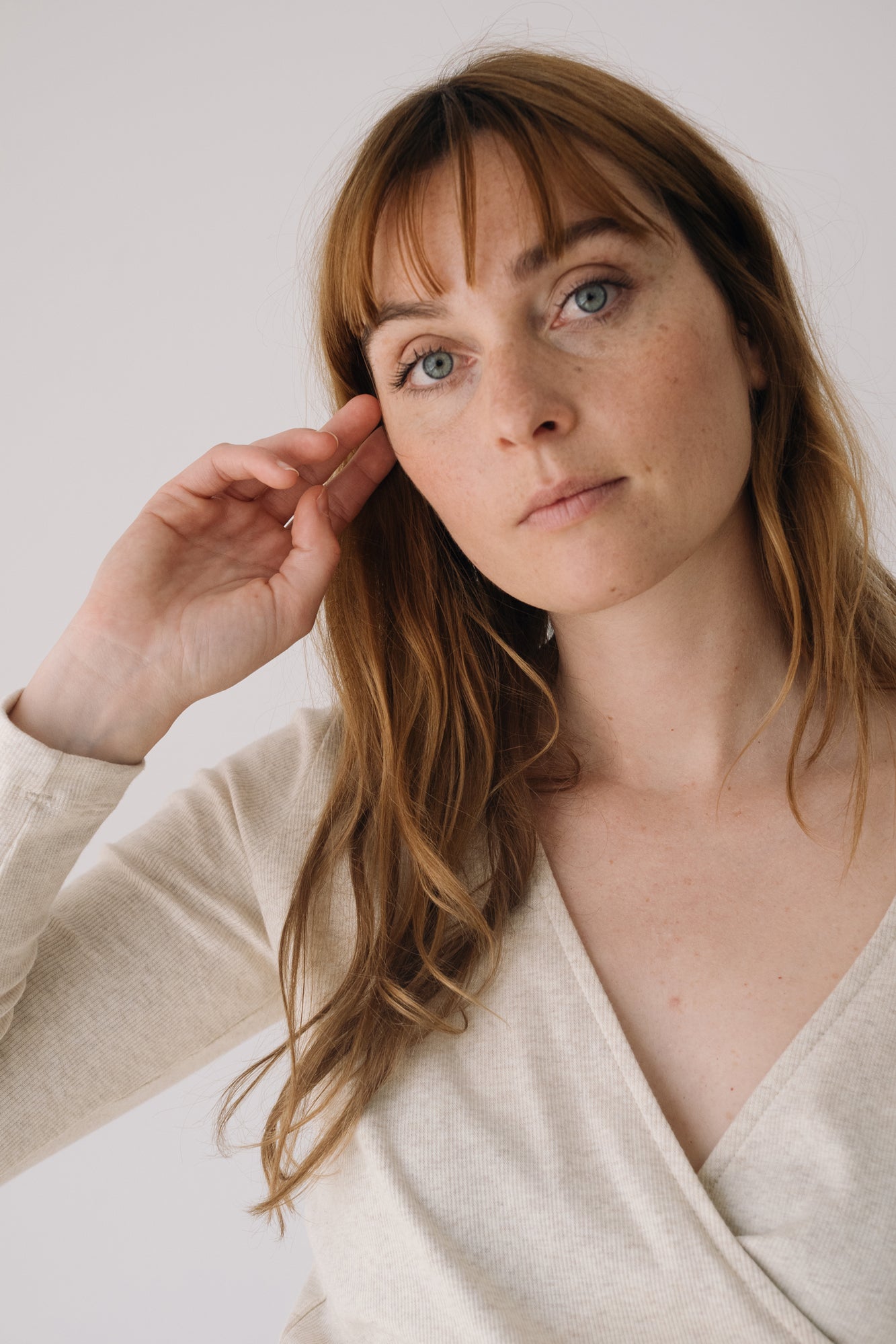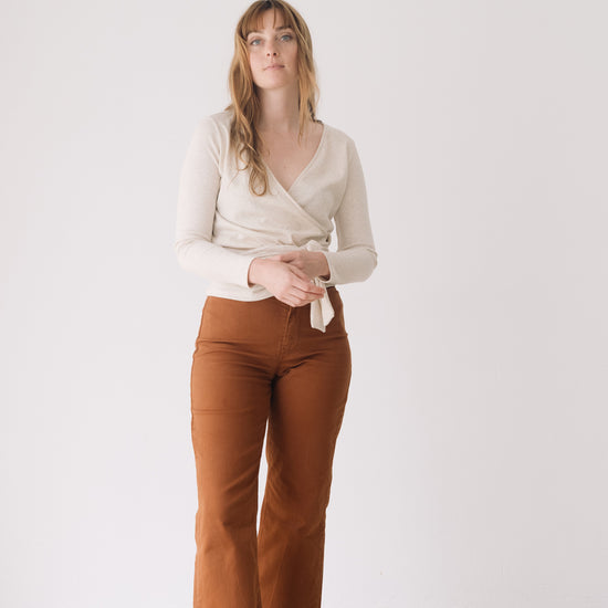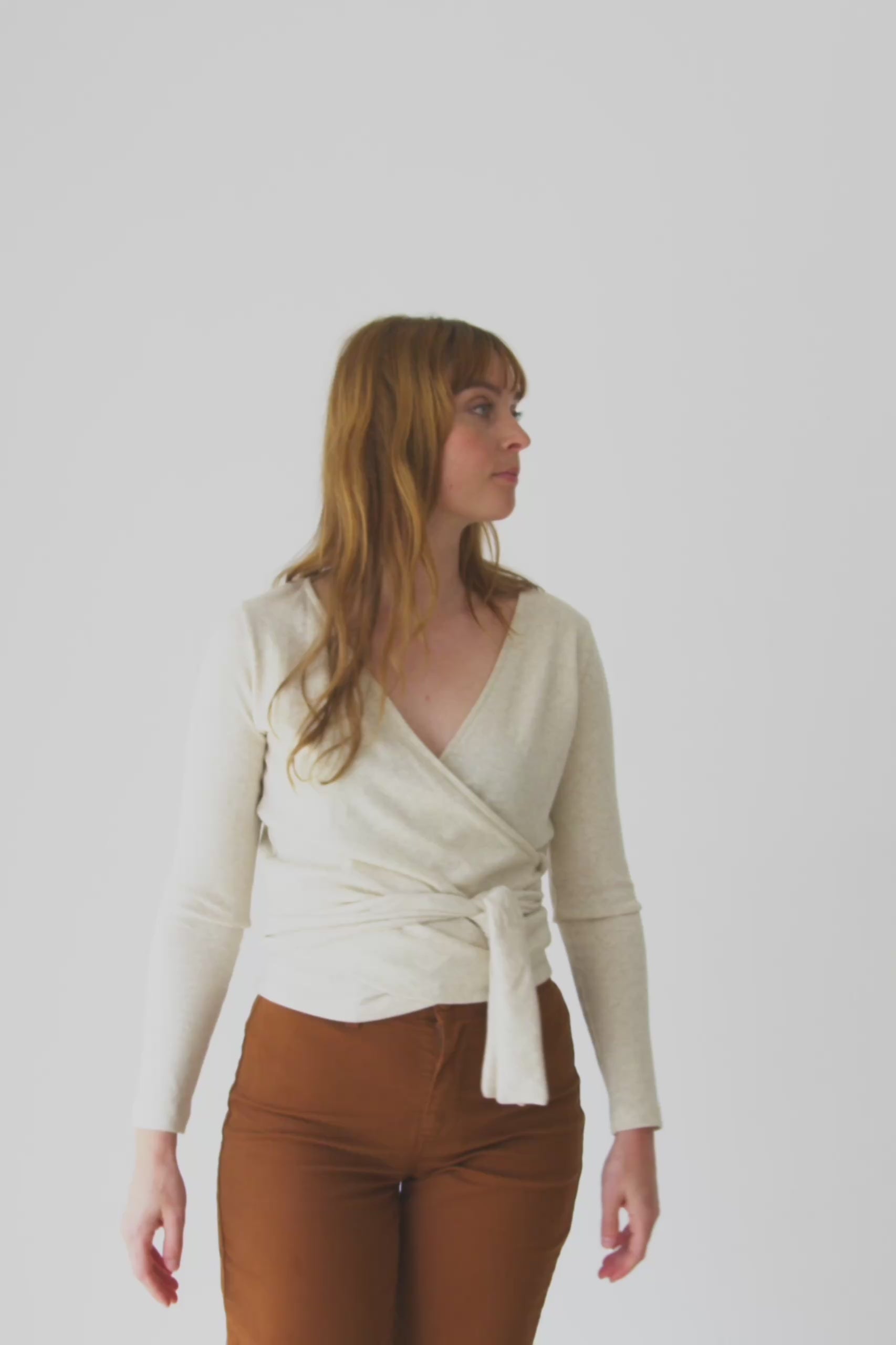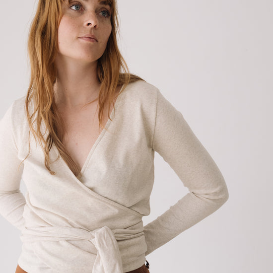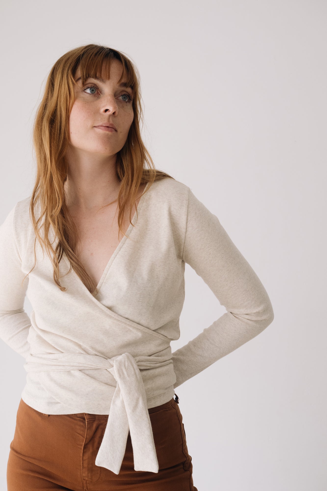 This Wrap Top in brown is a comfortable, feminine, and versatile piece designed to accompany you in your everyday life with style. A must-have essential for your sustainable wardrobe! Crafted from GOTS-certified organic cotton jersey, it features a soft, thick, and stretchy texture that adapts to your body without feeling tight. Its wrap design, with a V-neckline and tie at the waist, allows you to adjust the fit to your liking, naturally enhancing your silhouette. This neutral ecru shade evokes calm, warmth, and balance. Versatile and luminous, it pairs effortlessly with any outfit, adding serenity and timeless sophistication.
