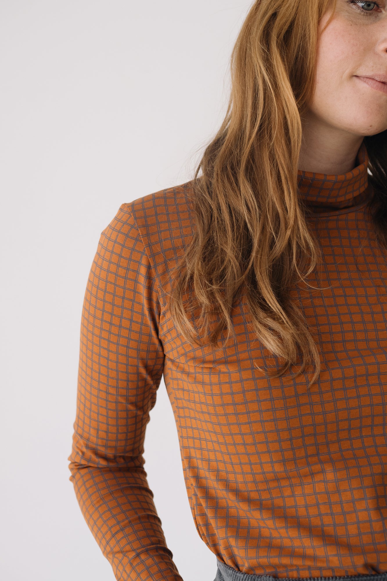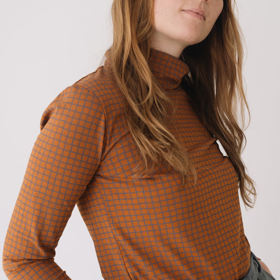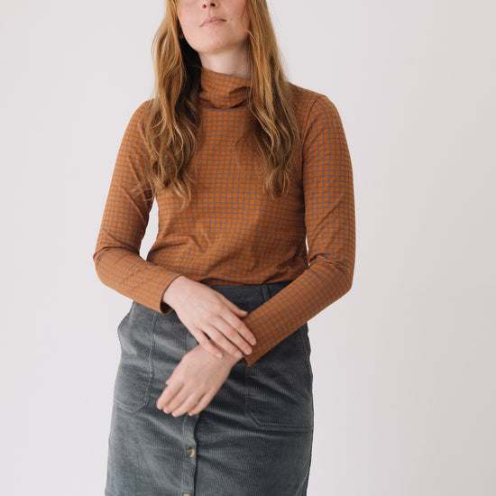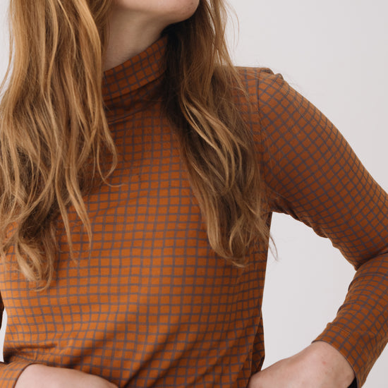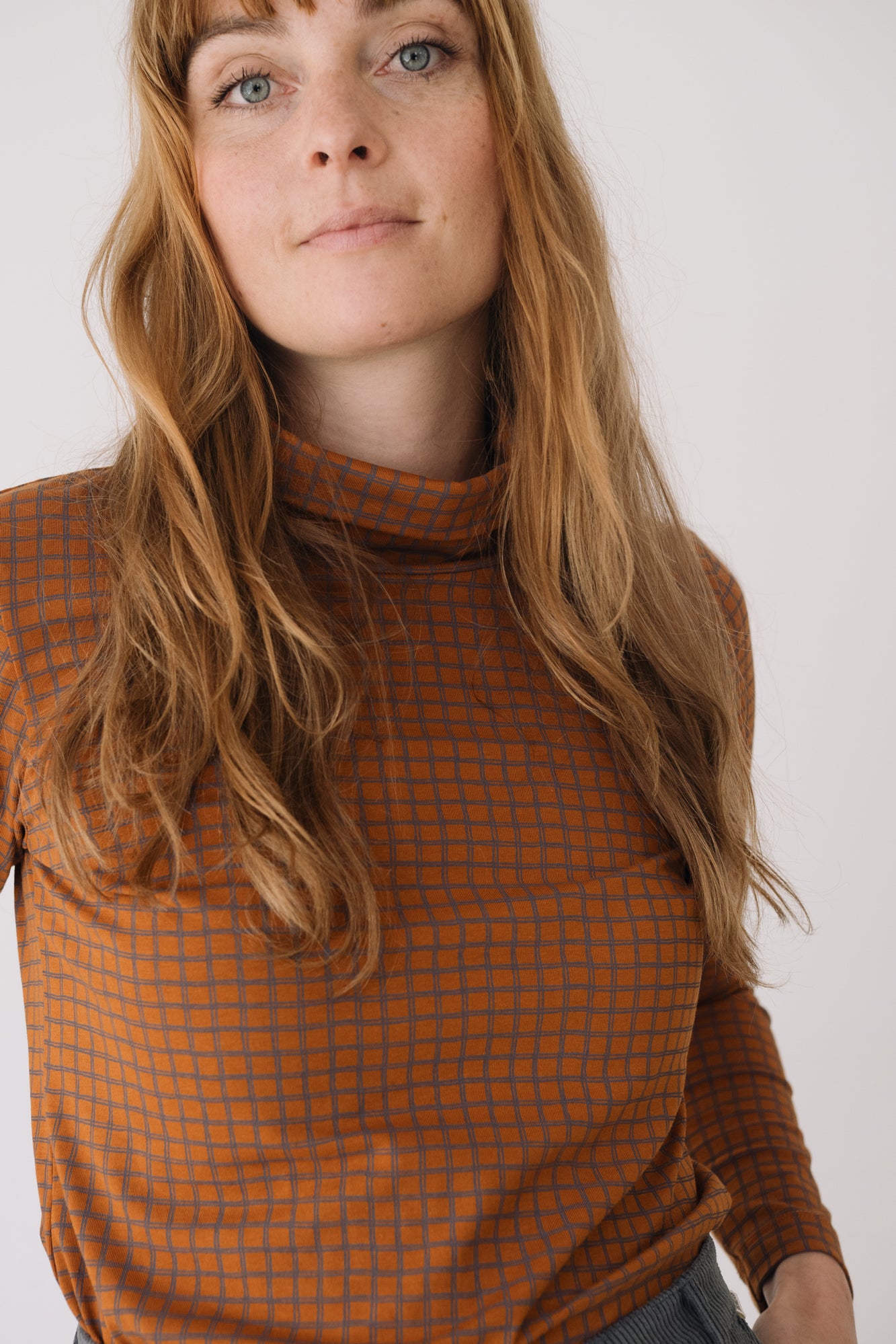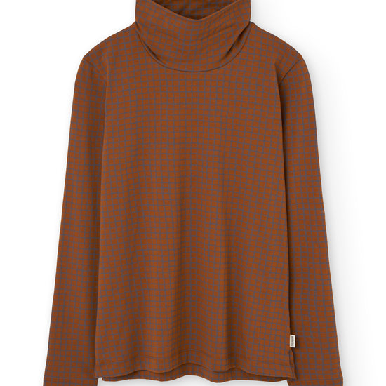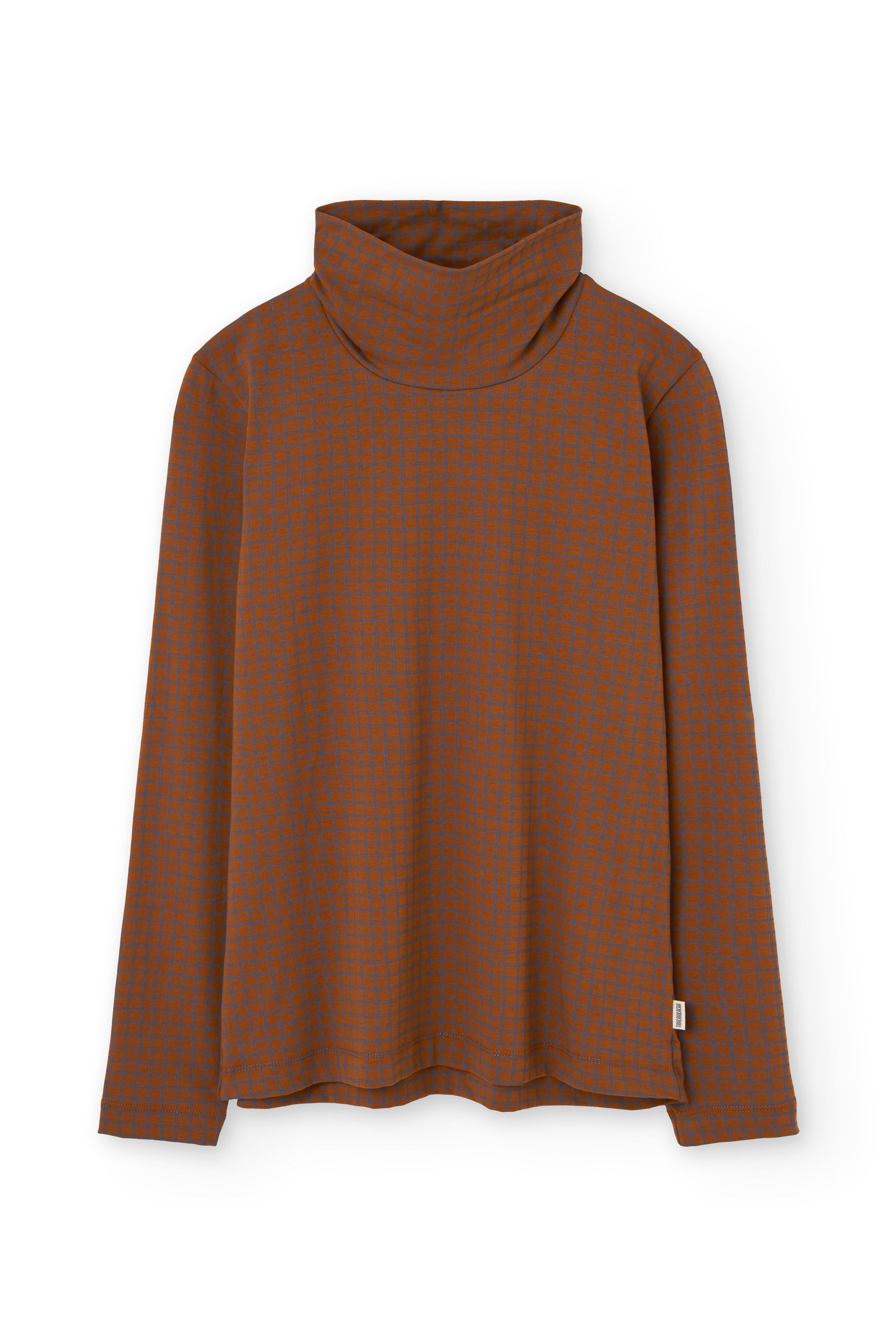 El modelo Taavi de cuello alto es una prenda cálida y suave, ideal para acompañarte durante los meses fríos. Está confeccionada en punto de jersey de algodón orgánico certificado GOTS, ccon estampado de cuadros deshiguales. Su cuello alto amplio se adapta cómodamente sin oprimir, y su corte recto favorece todo tipo de siluetas. Su estampado de cuadros en tonos teja y gris transmite calidez, creatividad y equilibrio. Una combinación original y armónica que aporta carácter a cualquier look.