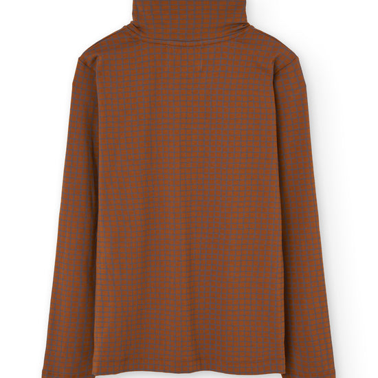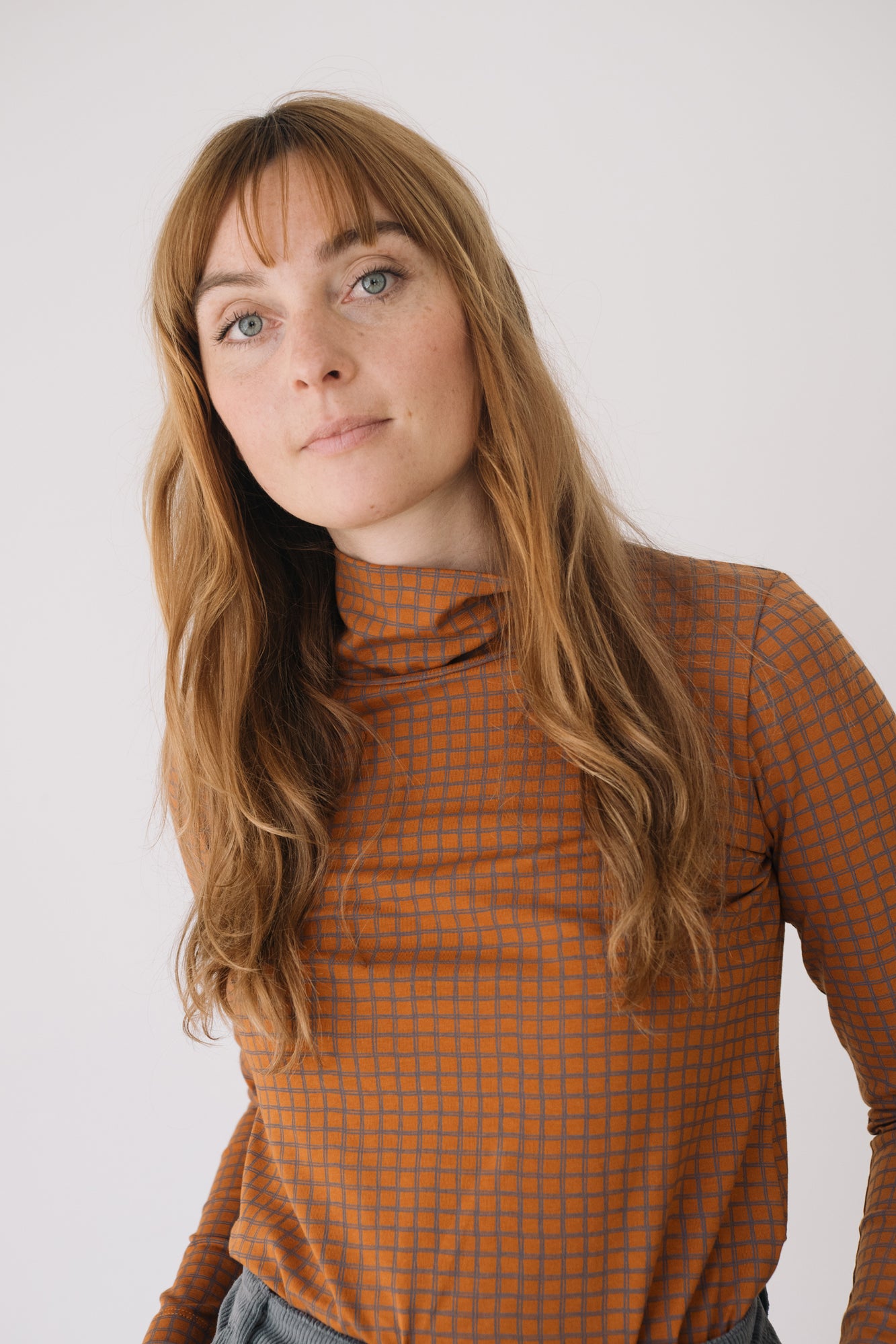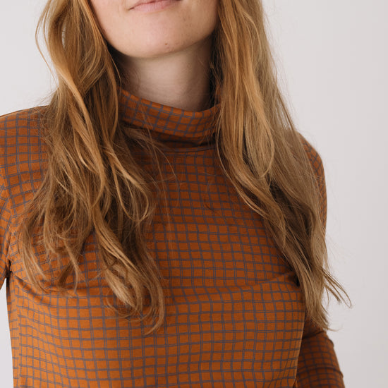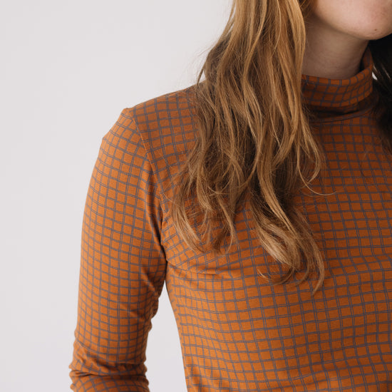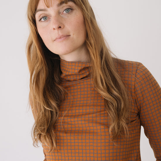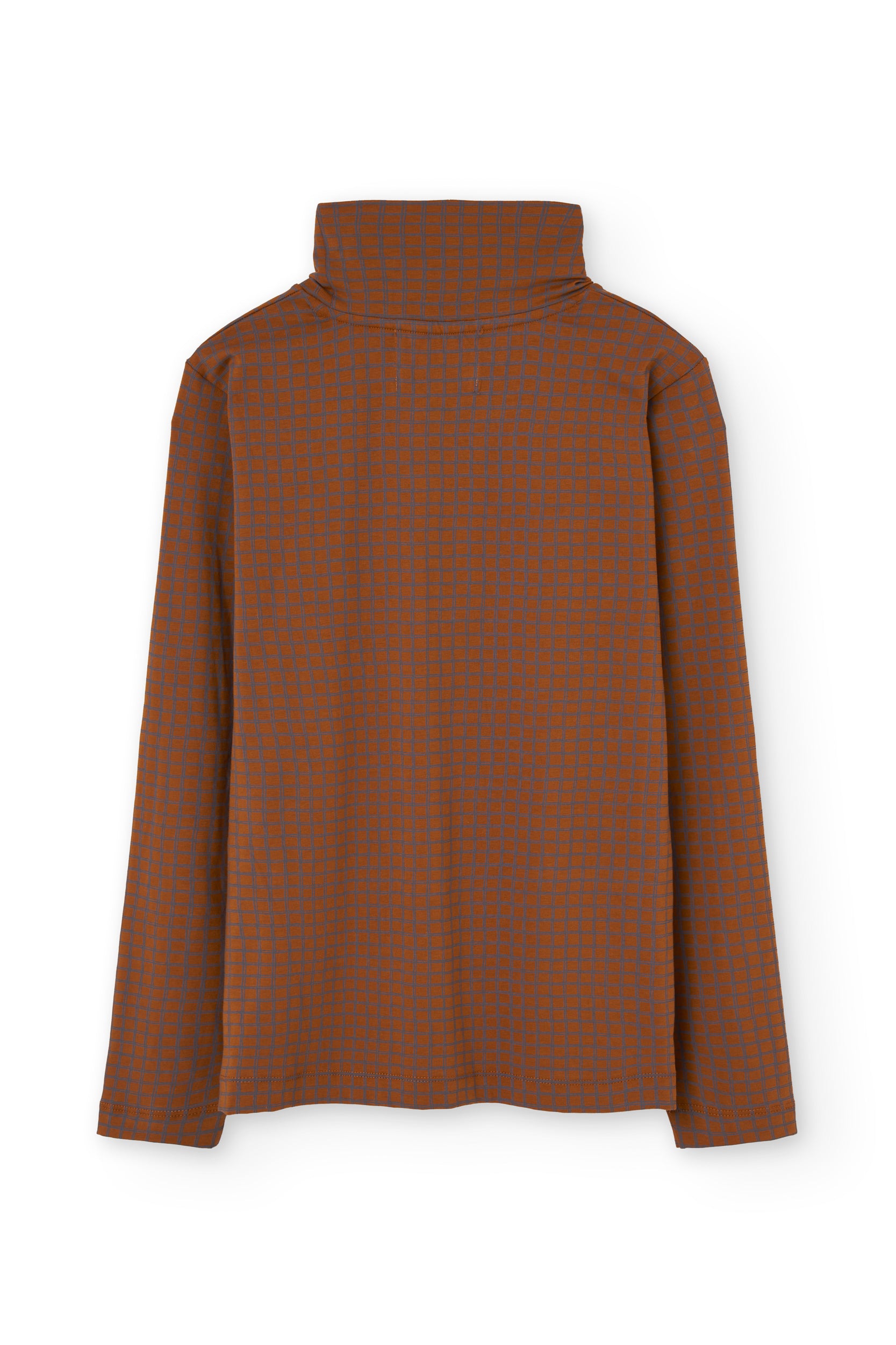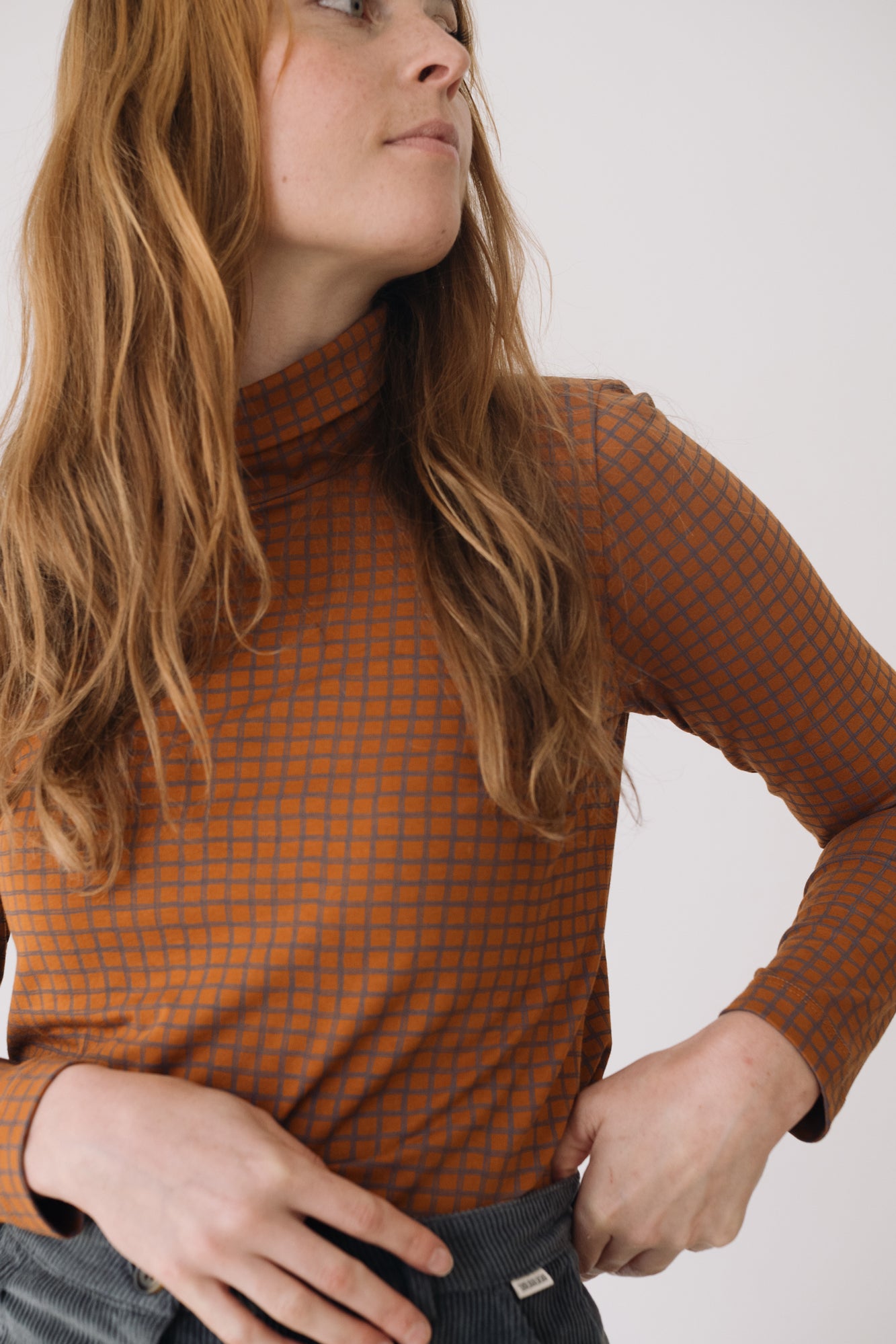 El modelo Taavi de cuello alto es una prenda cálida y suave, ideal para acompañarte durante los meses fríos. Está confeccionada en punto de jersey de algodón orgánico certificado GOTS, ccon estampado de cuadros deshiguales. Su cuello alto amplio se adapta cómodamente sin oprimir, y su corte recto favorece todo tipo de siluetas. Su estampado de cuadros en tonos teja y gris transmite calidez, creatividad y equilibrio. Una combinación original y armónica que aporta carácter a cualquier look.