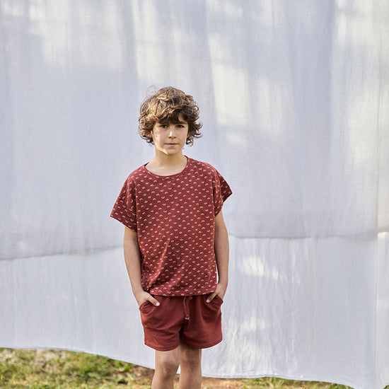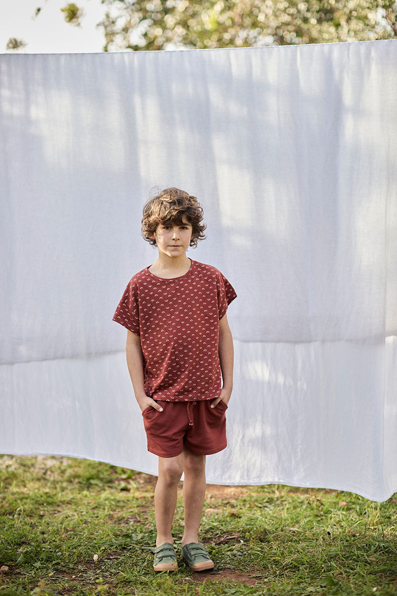 Pantalón corto de rizo con bolsillos en los laterales de algodón orgánico. Lleva una goma en la cintura con una lazada para mayor ajuste. Básico ORIGEN color rojo rooibos que puedes combinar con la camiseta roja con estampado y así tener el conjunto completo. Esta prenda tiene un tacto muy suave y agradable en la piel. Además, está confeccionada libre de tóxicos y es hipoalergénica para la delicada piel de tu pequeñx.