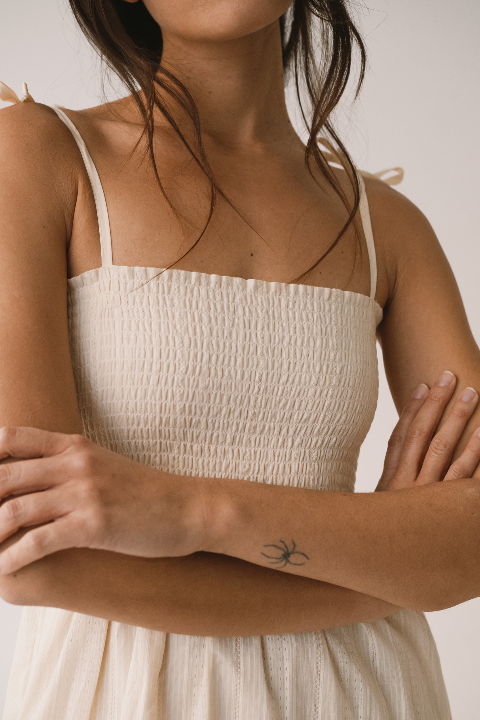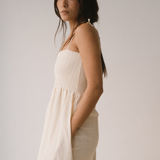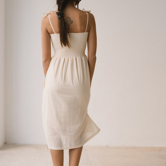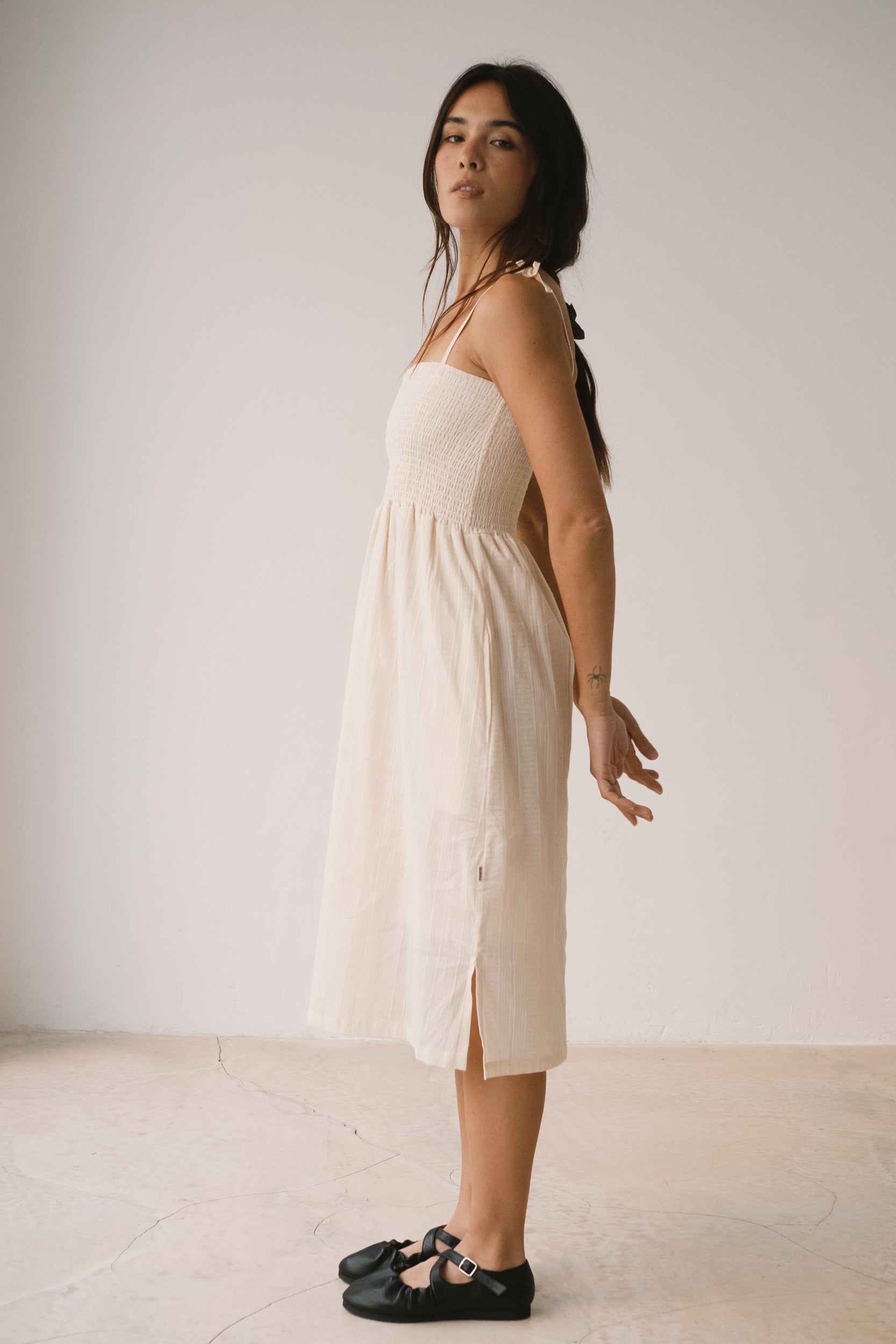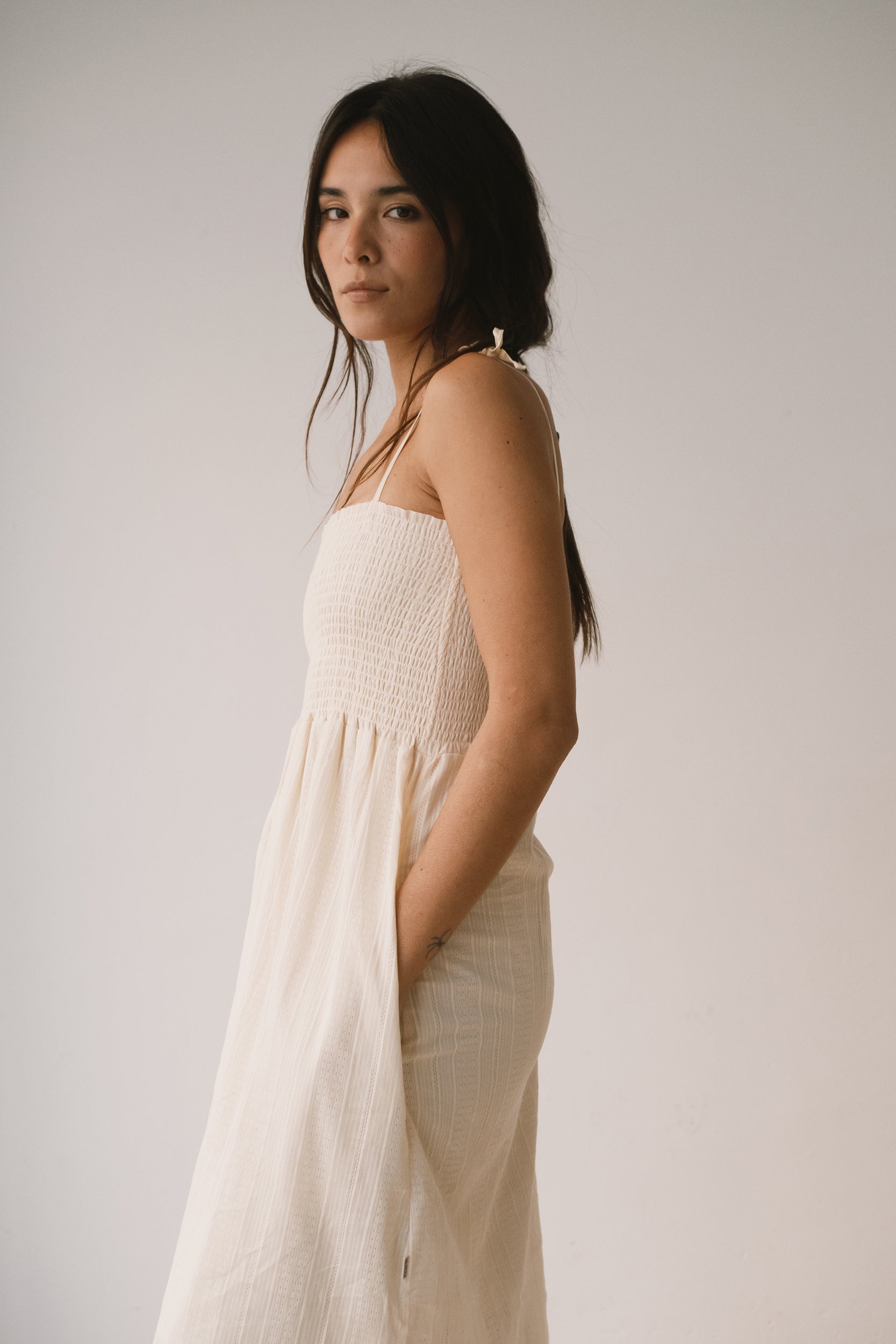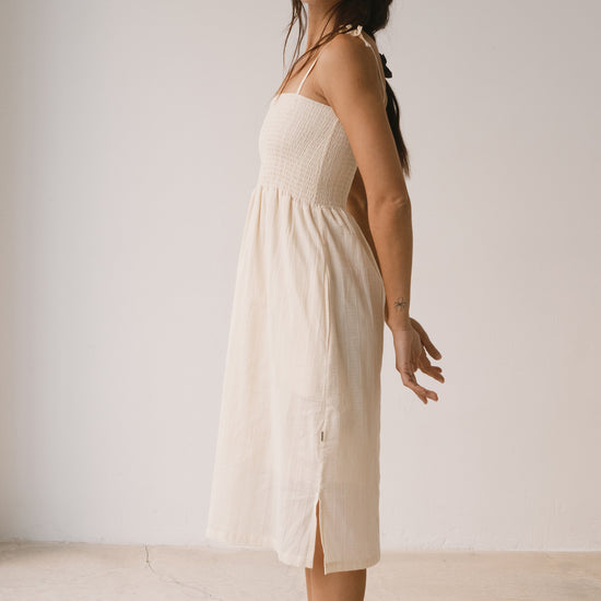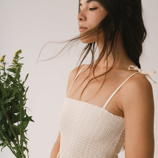 Amelie es un vestido largo pensado para acompañarte con ligereza en los días más cálidos. La parte superior con nido de abeja se adapta suavemente al cuerpo, mientras que los tirantes regulables, rematados con un lazo, permiten ajustar el vestido a tu gusto. Los bolsillos laterales aportan funcionalidad a una prenda diseñada para disfrutarla sin prisas. Está confeccionado en un delicado tejido dobby de algodón orgánico de calidad premium, creado especialmente para Tiralahilacha. Su forro interior, de voile de algodón orgánico, aporta comodidad y suavidad, y hace que el vestido resulte ligero, fresco y muy agradable sobre la piel. Una prenda favorecedora, honesta y atemporal que no querrás dejar de vestir. El color crudo transmite calma, calidez y equilibrio. Es un color neutro y luminoso que combina con todo, aportando serenidad y sofisticación a cualquier look.