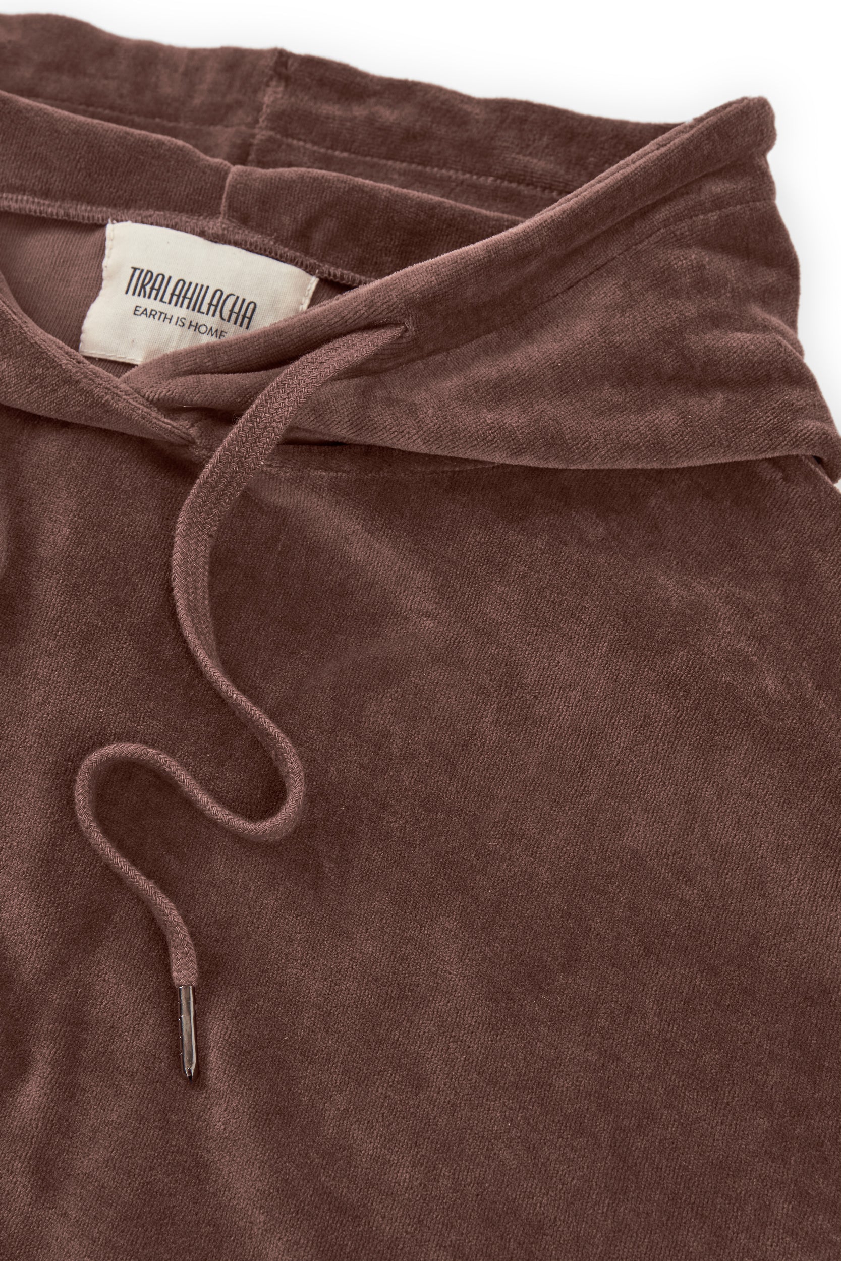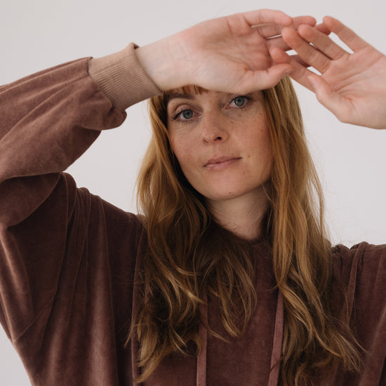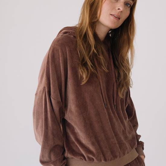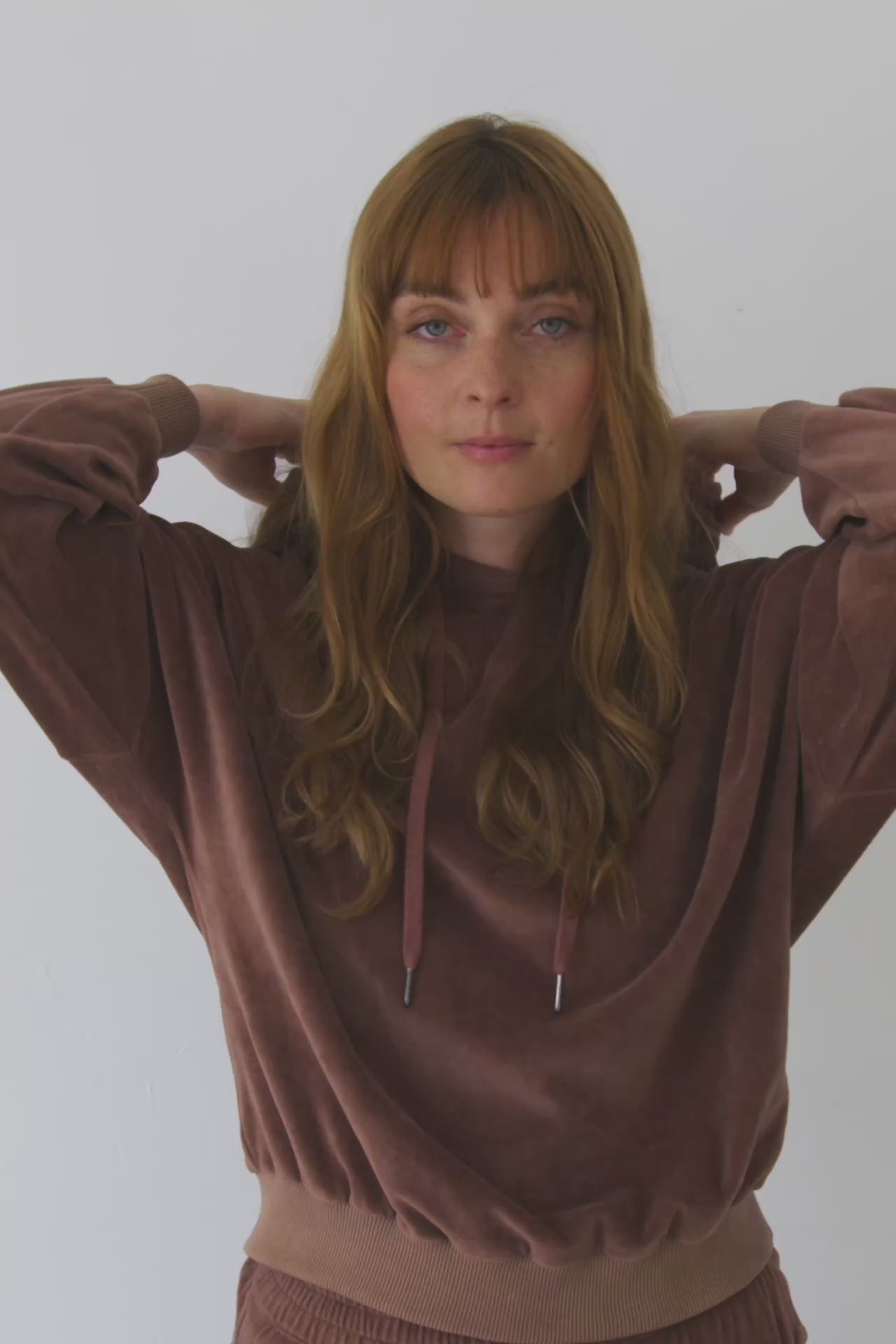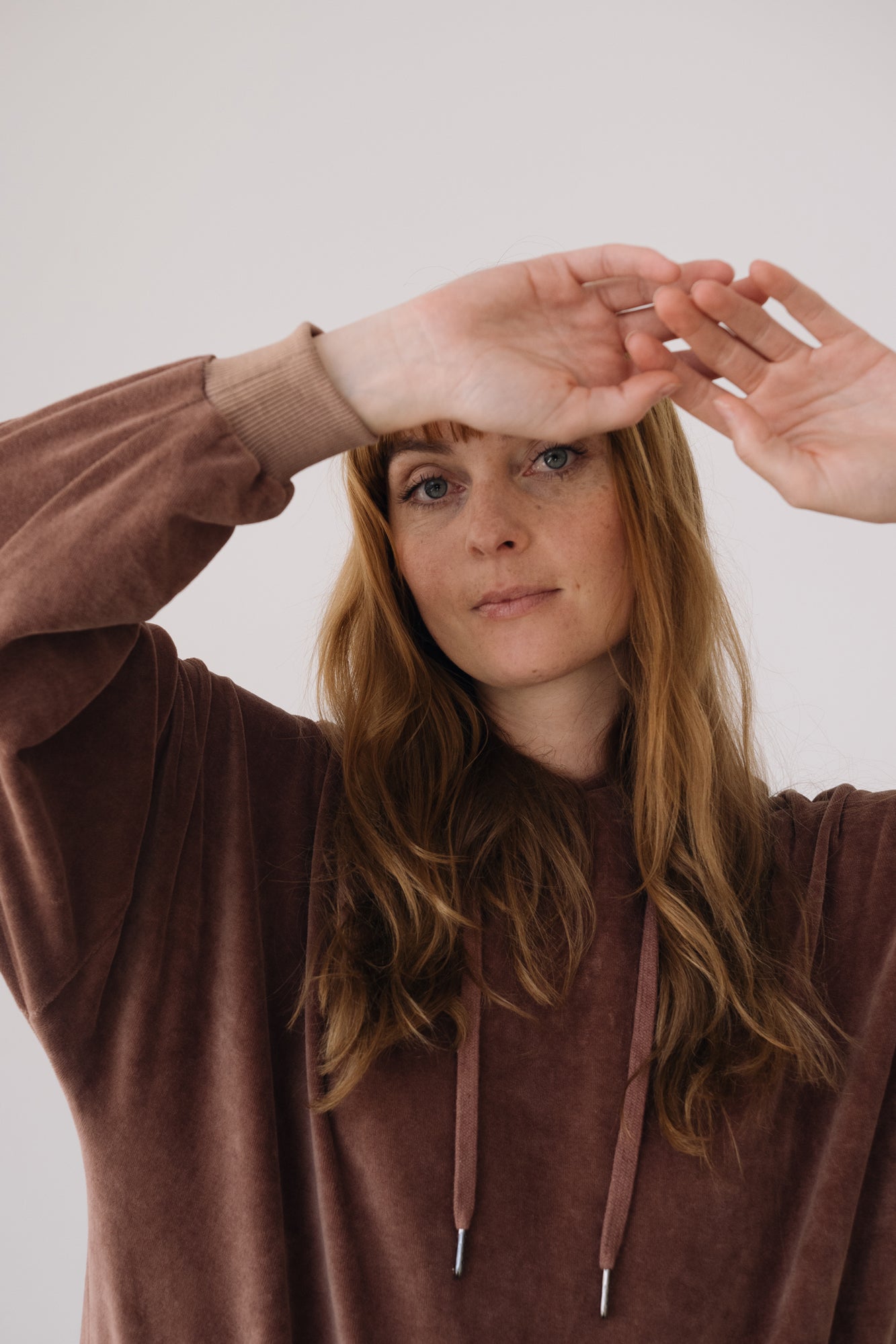 El modelo Telma es una sudadera acogedora y con personalidad. Es perfecta para los días que buscas confort para descansar, hacer ejercicio o salir cómoda sin renunciar al estilo. Es una sudadera de terciopelo con capucha, manga caída y corte holgado. ¡Es la prenda perfecta para combinarla con nuestros joggers Thais! Una prenda respetuoda con tu piel y el medio ambiente, confeccionada en terciopelo de algodón orgánico certificado GOTS, un tejido suave, cálido y ligeramente elástico que lo hace ideal para los meses fríos. El color malva aporta calma, delicadeza y una luz especial a tus looks de otoño e invierno