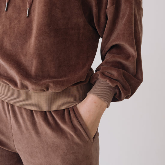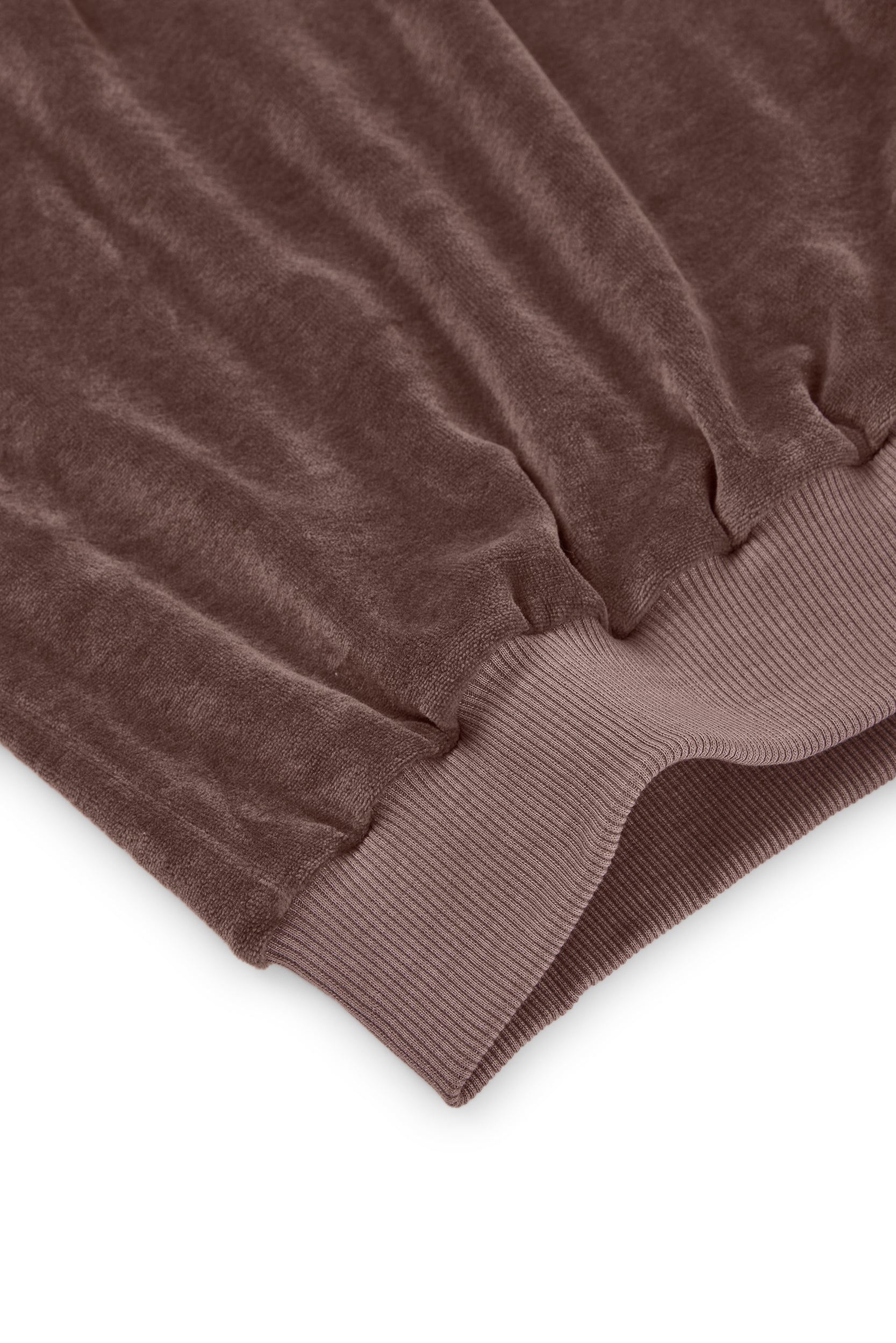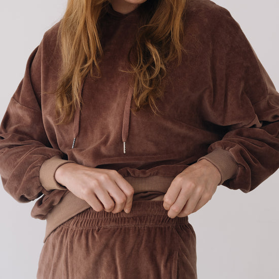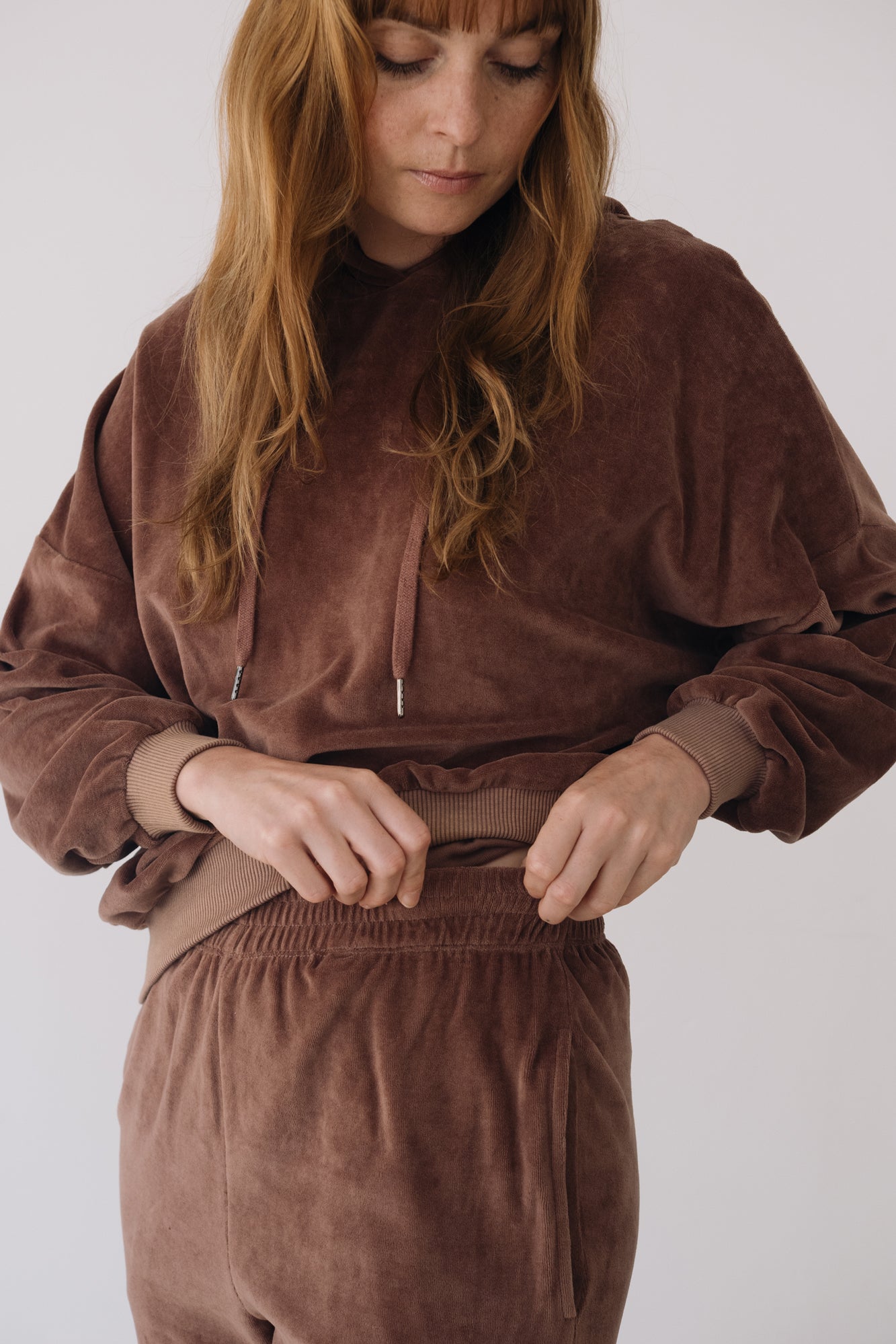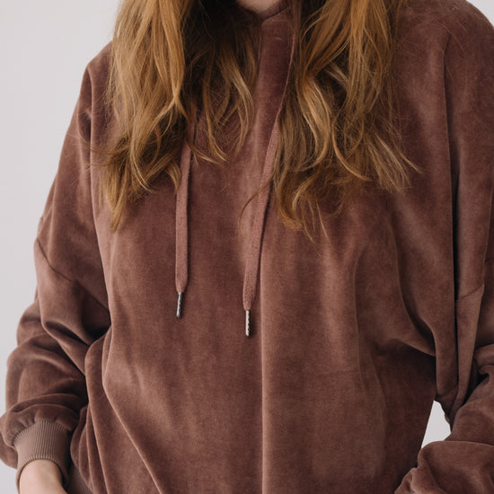El modelo Telma es una sudadera acogedora y con personalidad. Es perfecta para los días que buscas confort para descansar, hacer ejercicio o salir cómoda sin renunciar al estilo. Es una sudadera de terciopelo con capucha, manga caída y corte holgado. ¡Es la prenda perfecta para combinarla con nuestros joggers Thais! Una prenda respetuoda con tu piel y el medio ambiente, confeccionada en terciopelo de algodón orgánico certificado GOTS, un tejido suave, cálido y ligeramente elástico que lo hace ideal para los meses fríos. El color malva aporta calma, delicadeza y una luz especial a tus looks de otoño e invierno