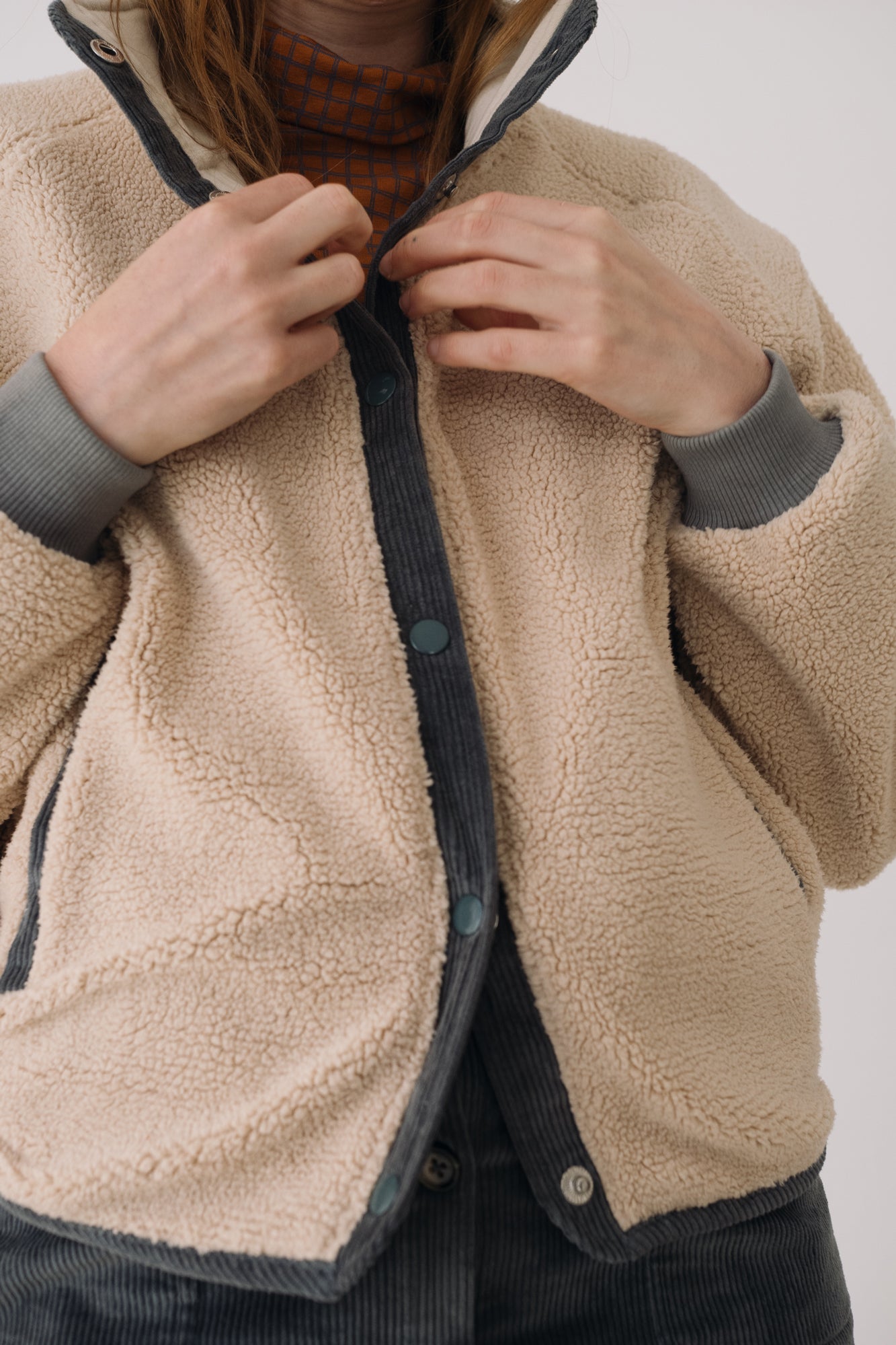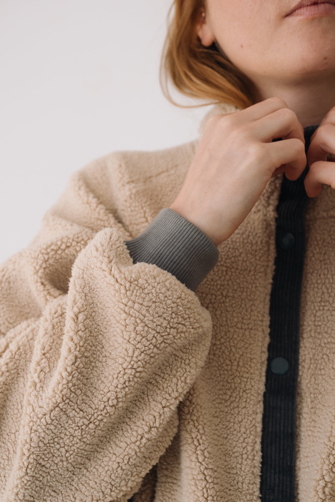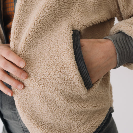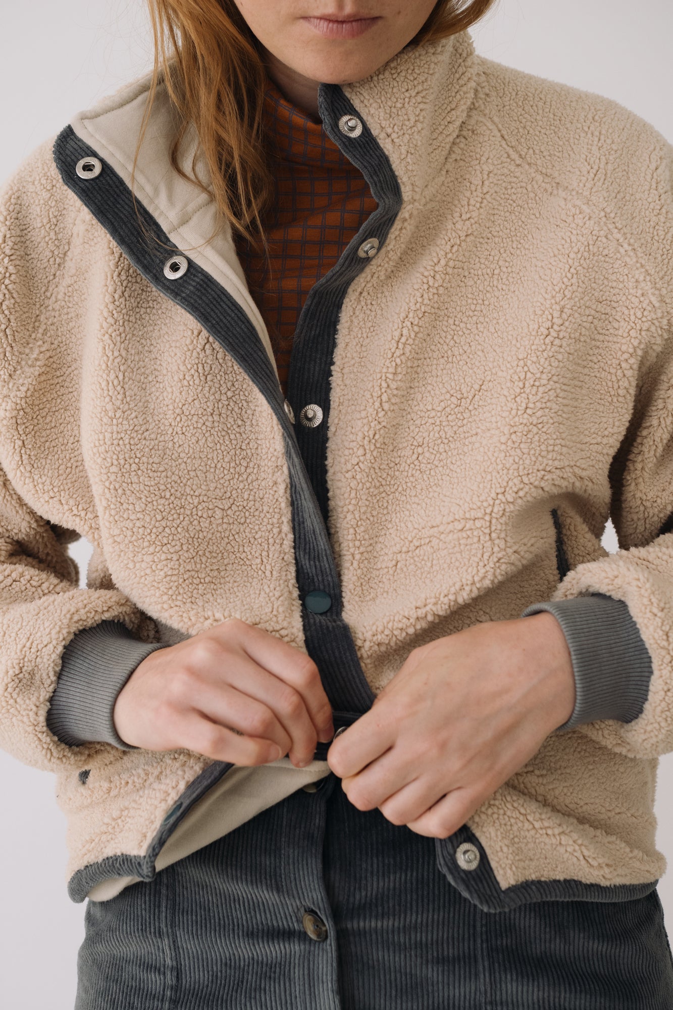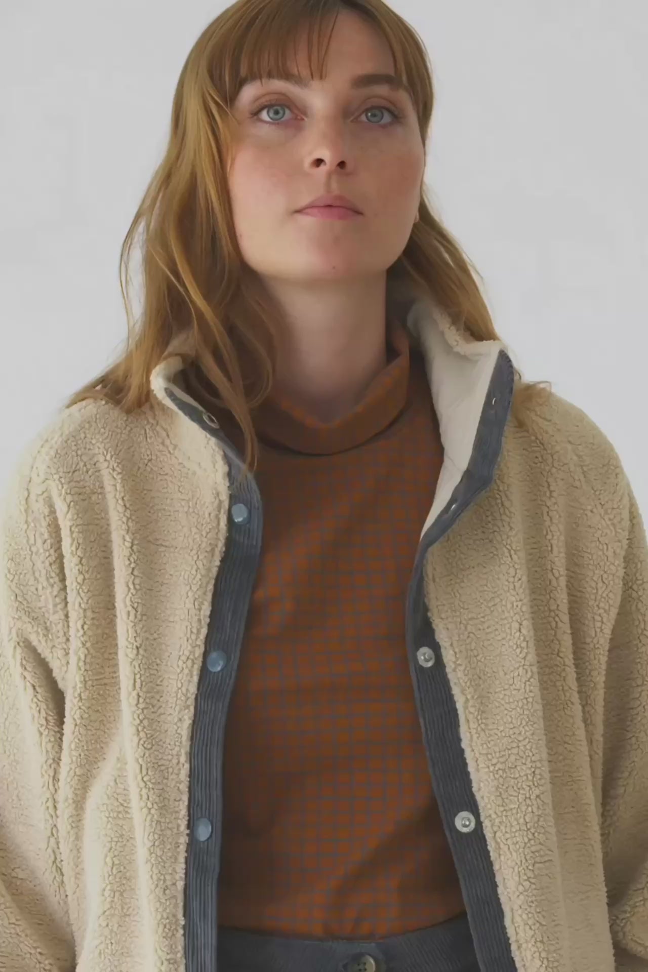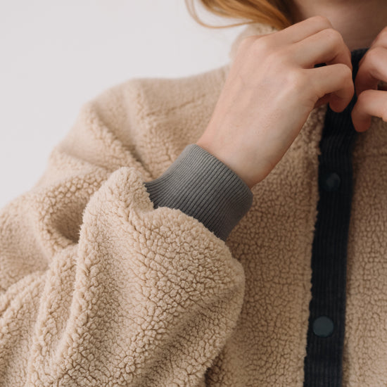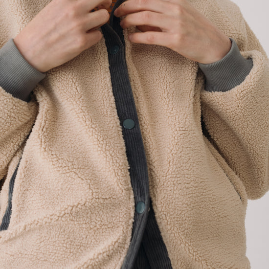 El modelo Tulipa es la chaqueta de borreguito perfecta para acompañarte y arroparte en los días más fríos. Diseñada con un corte holgado pero ajustado a la cadera para no dejar que entre el frío. Sus mangas con corte ranglán son perfectas para llevar un jerséy comodamente. Lleva botones a presión, bolsillos laterales en tejido de pana en contraste, que realzan su diseño cómodo y funcional. Está confeccionada en borreguito grueso 100% de algodón orgánico certificado GOTS, sin fertilizantes ni tintes tóxicos. Un tejido suave, esponjoso y muy acogedor, forrado con punto de jersey para mayor calidez y libertad de movimiento. El color crudo transmite calma, calidez y equilibrio. Es un color neutro y luminoso que combina con todo, aportando serenidad y sofisticación a cualquier look.