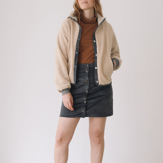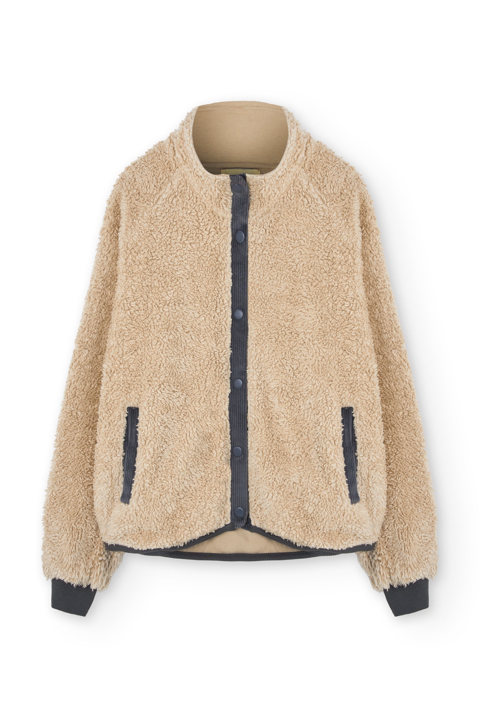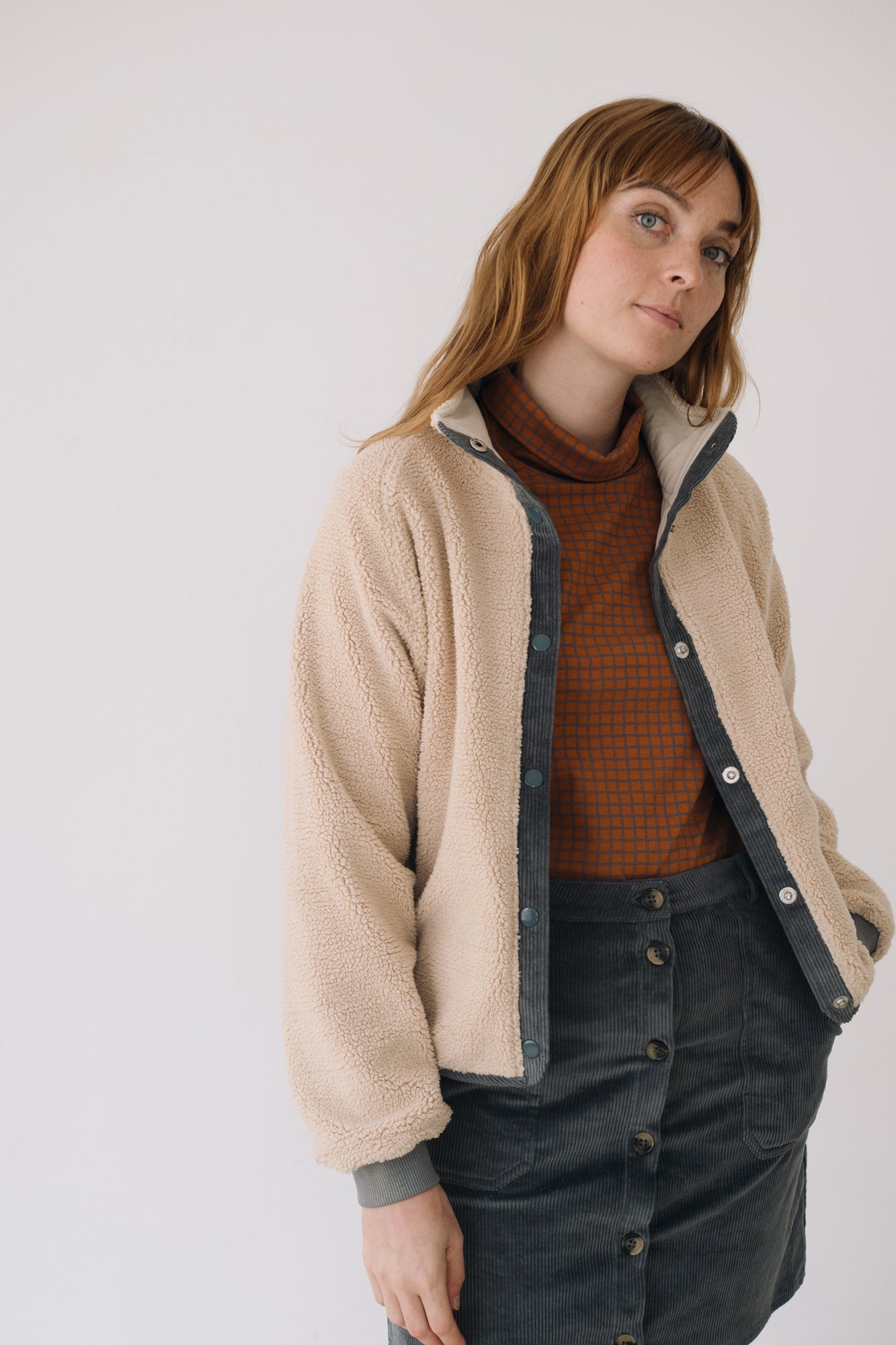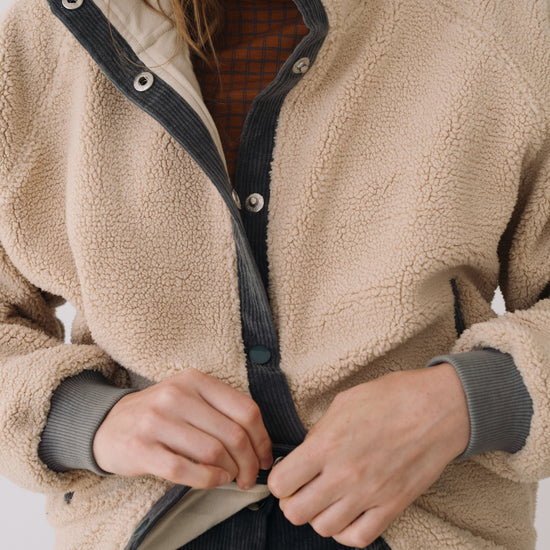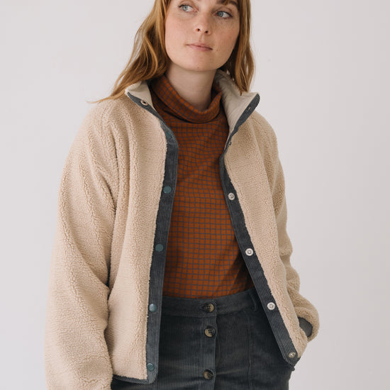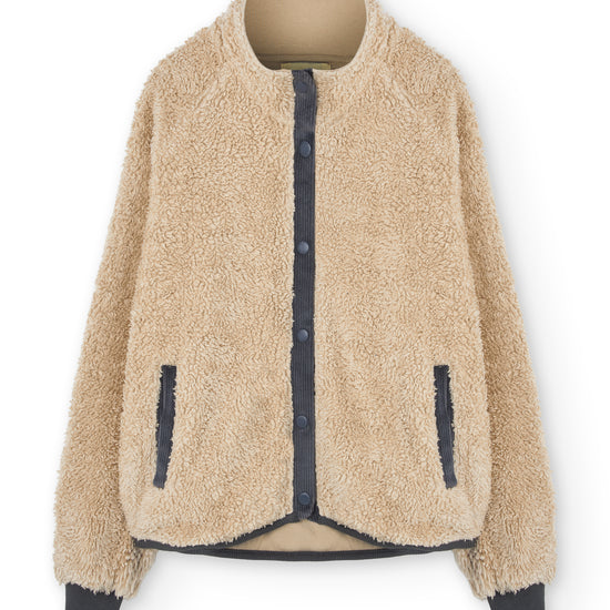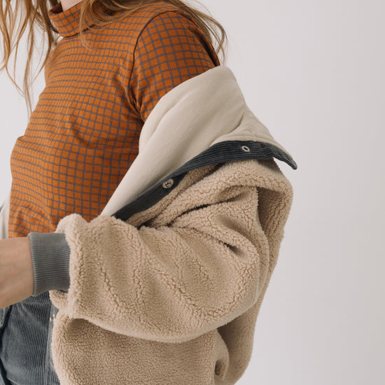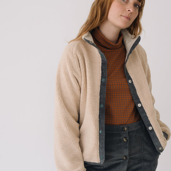 El modelo Tulipa es la chaqueta de borreguito perfecta para acompañarte y arroparte en los días más fríos. Diseñada con un corte holgado pero ajustado a la cadera para no dejar que entre el frío. Sus mangas con corte ranglán son perfectas para llevar un jerséy comodamente. Lleva botones a presión, bolsillos laterales en tejido de pana en contraste, que realzan su diseño cómodo y funcional. Está confeccionada en borreguito grueso 100% de algodón orgánico certificado GOTS, sin fertilizantes ni tintes tóxicos. Un tejido suave, esponjoso y muy acogedor, forrado con punto de jersey para mayor calidez y libertad de movimiento. El color crudo transmite calma, calidez y equilibrio. Es un color neutro y luminoso que combina con todo, aportando serenidad y sofisticación a cualquier look.