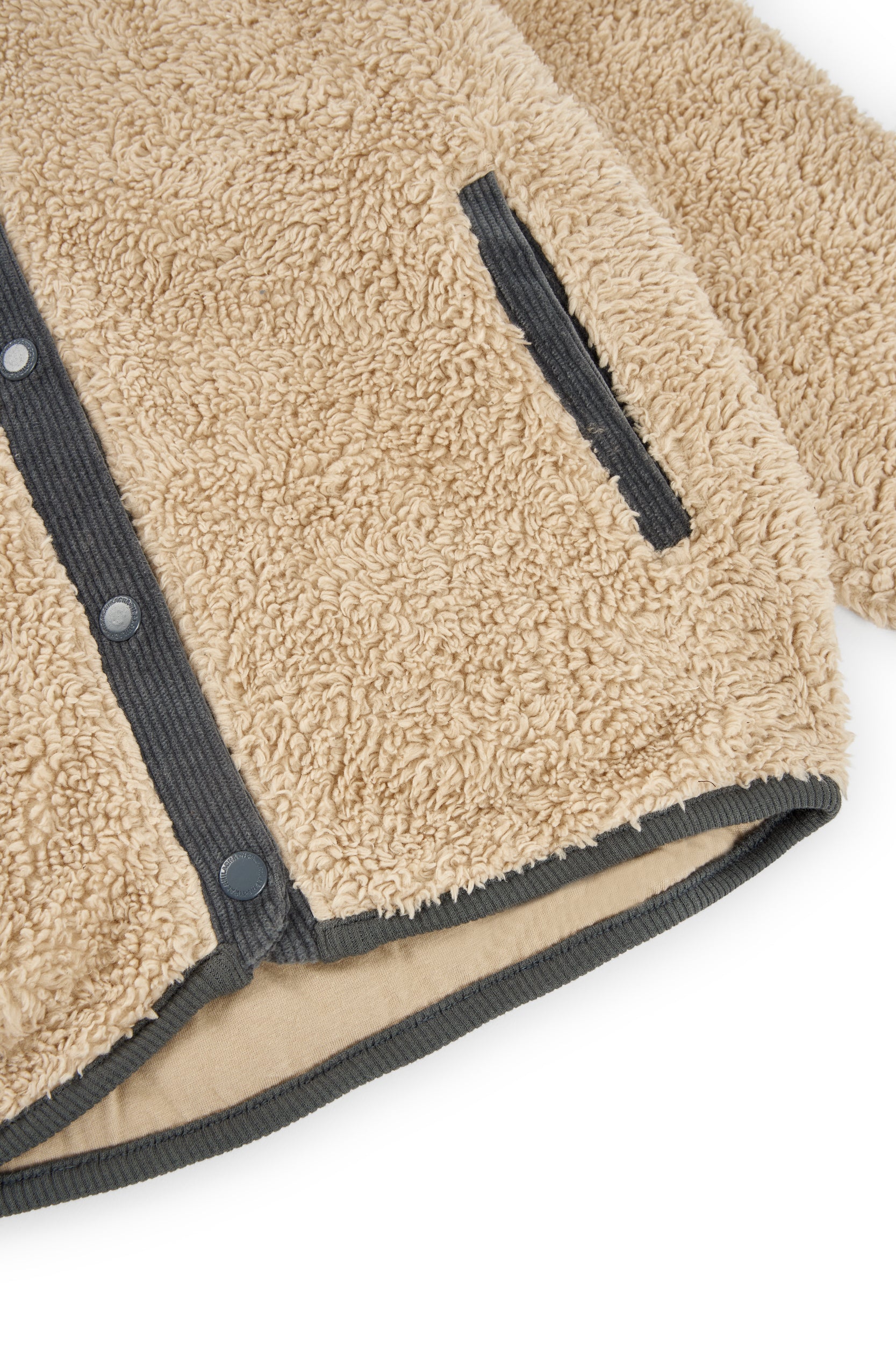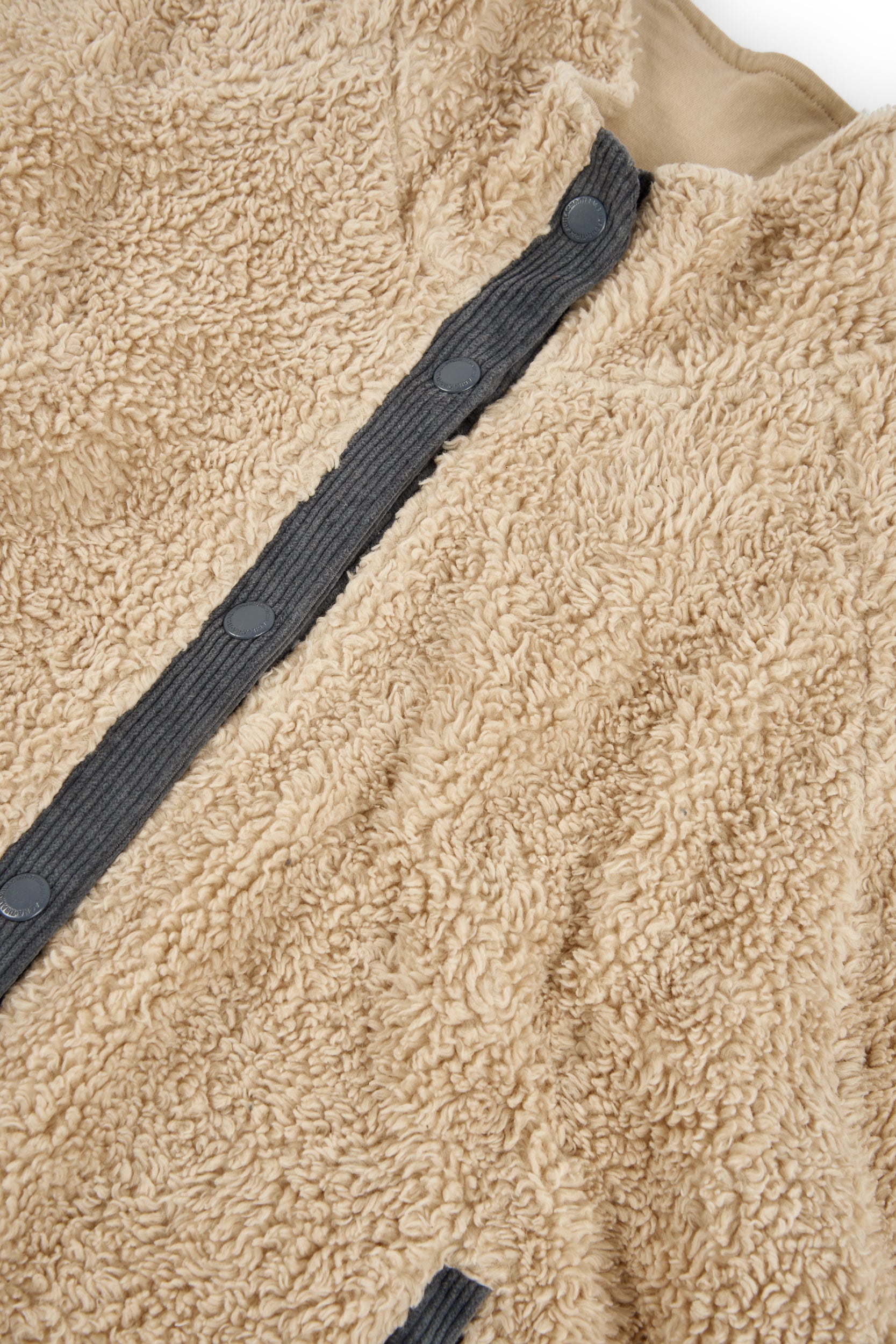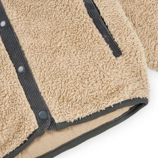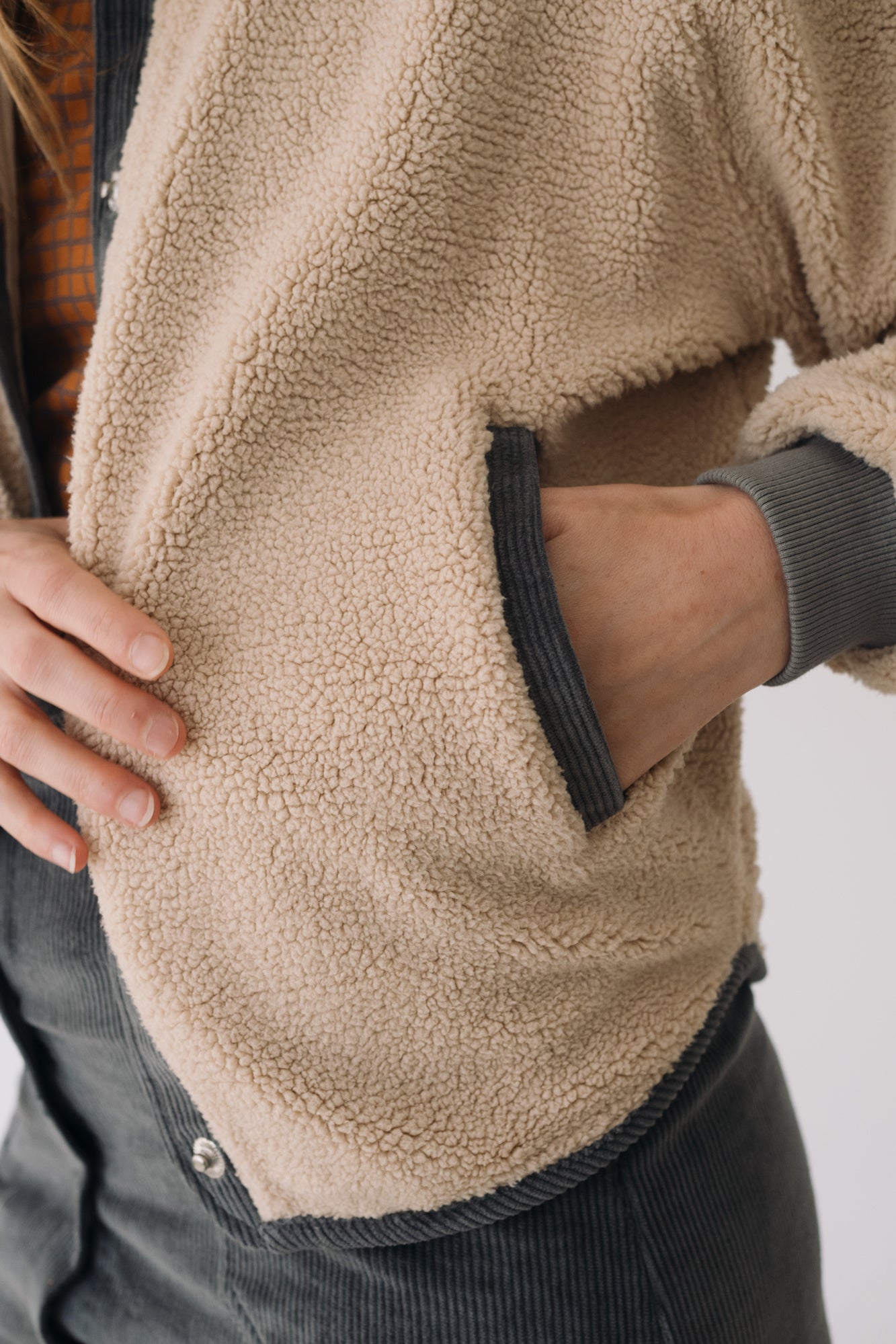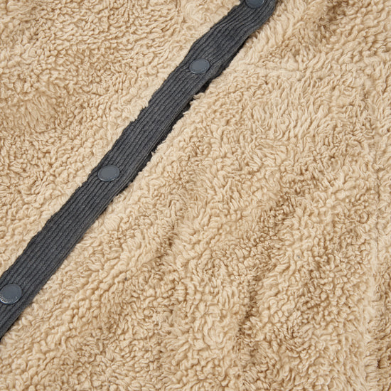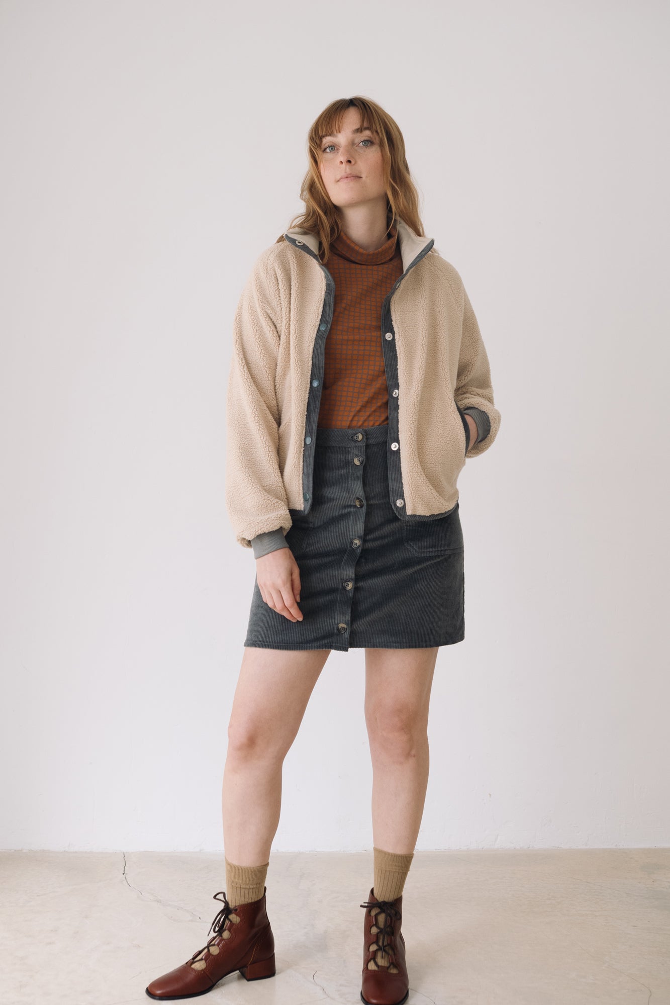 El modelo Tulipa es la chaqueta de borreguito perfecta para acompañarte y arroparte en los días más fríos. Diseñada con un corte holgado pero ajustado a la cadera para no dejar que entre el frío. Sus mangas con corte ranglán son perfectas para llevar un jerséy comodamente. Lleva botones a presión, bolsillos laterales en tejido de pana en contraste, que realzan su diseño cómodo y funcional. Está confeccionada en borreguito grueso 100% de algodón orgánico certificado GOTS, sin fertilizantes ni tintes tóxicos. Un tejido suave, esponjoso y muy acogedor, forrado con punto de jersey para mayor calidez y libertad de movimiento. El color crudo transmite calma, calidez y equilibrio. Es un color neutro y luminoso que combina con todo, aportando serenidad y sofisticación a cualquier look.