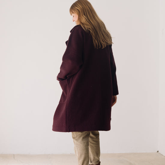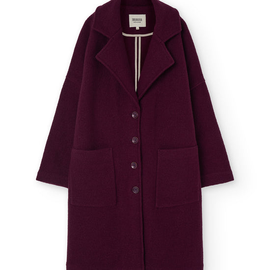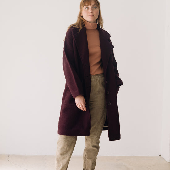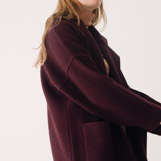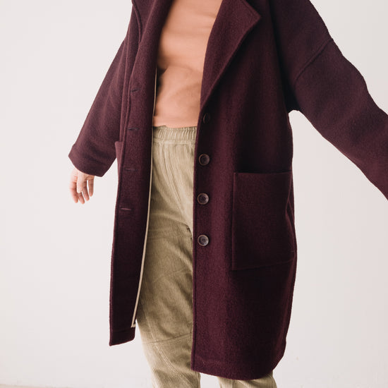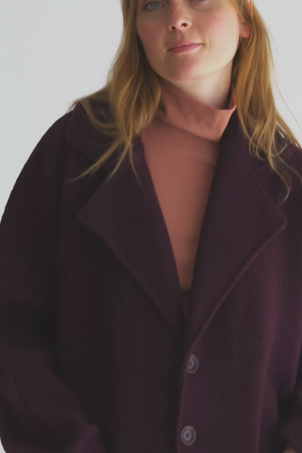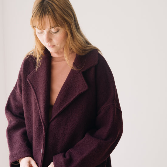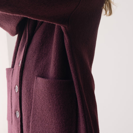 The perfect Coat for those who seek warmth with elegance, sustainability, and comfort without compromising on design. Sophisticated and timeless, it has been thoughtfully designed to stay with you for many years without ever going out of style. Featuring an oversized cut with dropped shoulders, a notched lapel collar, and spacious patch pockets, it’s a statement of effortless elegance. Crafted from Woolmark- and RWS-certified merino wool knit, it ensures animal welfare and an ethical, environmentally respectful production process. The fabric has body yet feels wonderfully lightweight and warm—perfect for cold days. Finished with biodegradable corozo buttons and lovingly made in our atelier in Tàrrega, Spain. The purple shade evokes depth, introspection, and mystery—a color that connects with our inner world, creativity, and sensitivity.