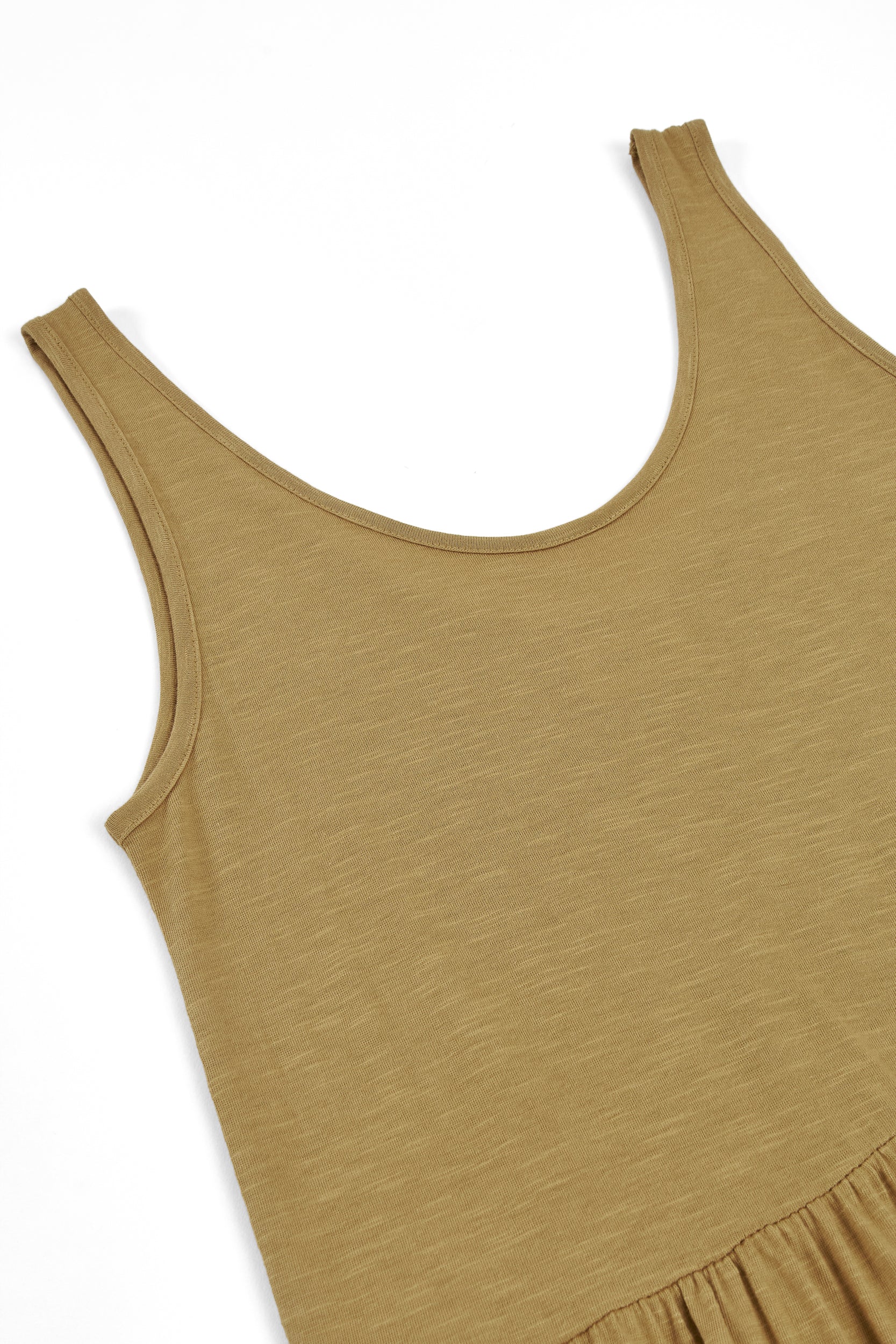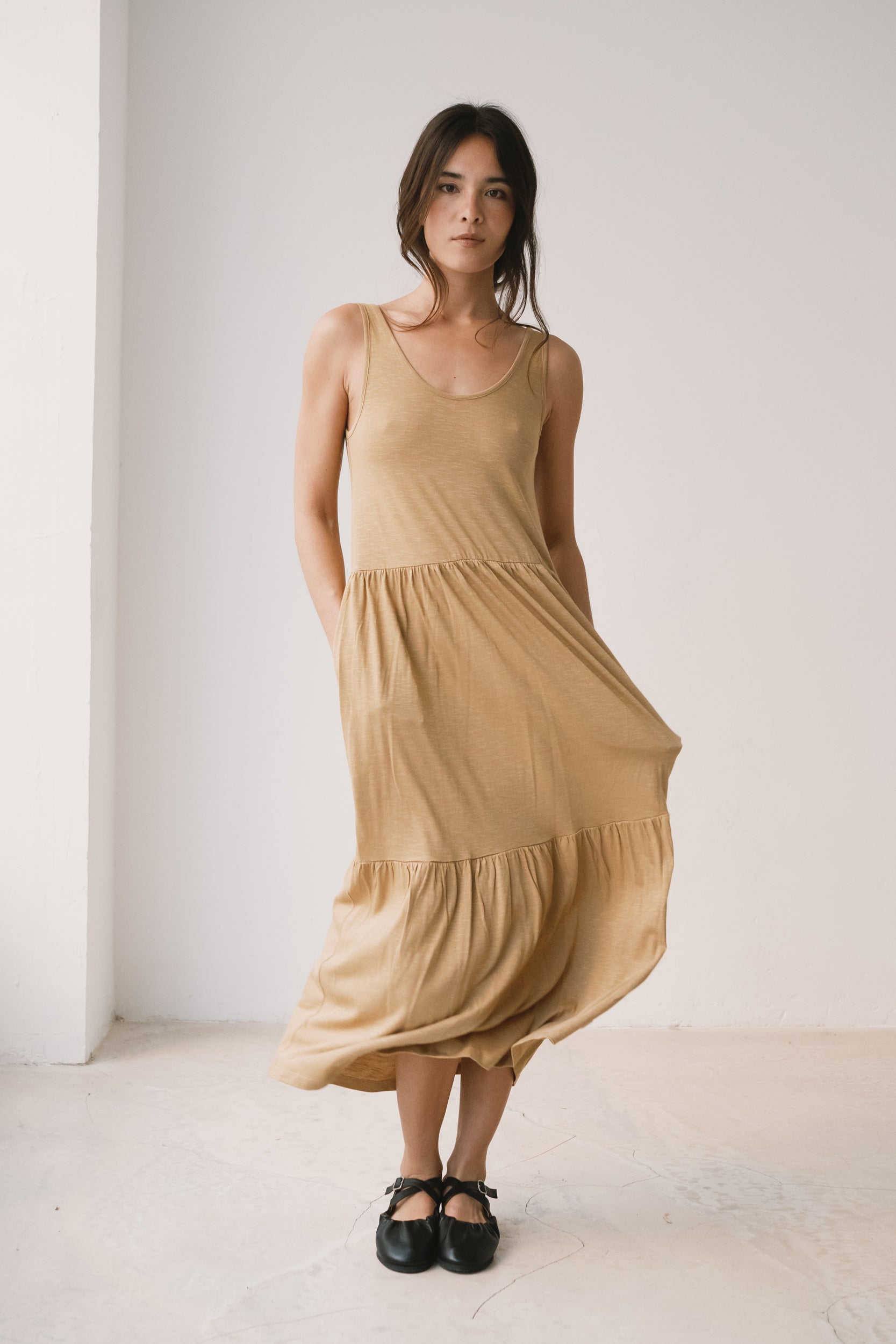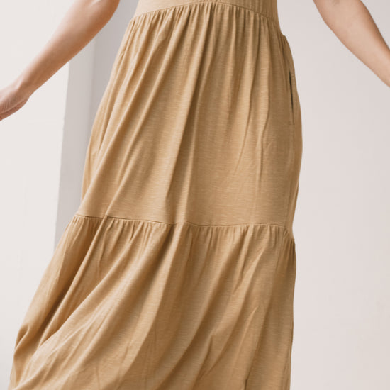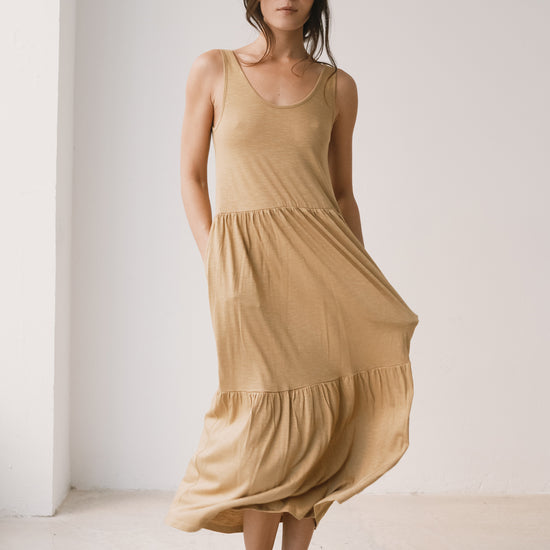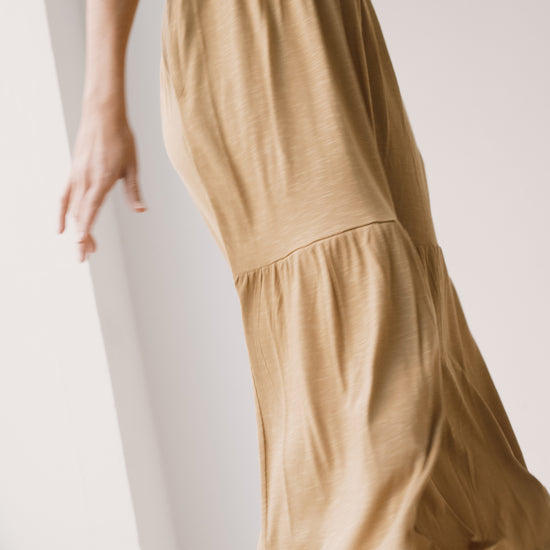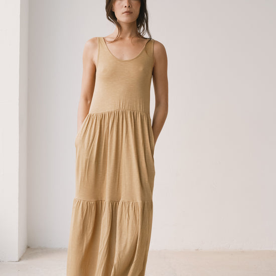 With its fluid silhouette and soft ruffles, the Alice long dress moves effortlessly, offering lightness and ease throughout the day. The deeper back neckline brings a refined, feminine detail without compromising comfort, while side pockets add discreet functionality. Made from a breathable blend of organic cotton and modal, the fabric drapes beautifully and feels cool and gentle against the skin. A versatile piece that transitions naturally from beach walks to relaxed summer evenings. This pastel yellow shade conveys warmth and serene joy. A soft, luminous color that adds brightness to your wardrobe in a subtle and timeless way.