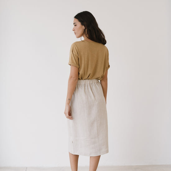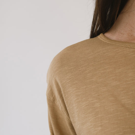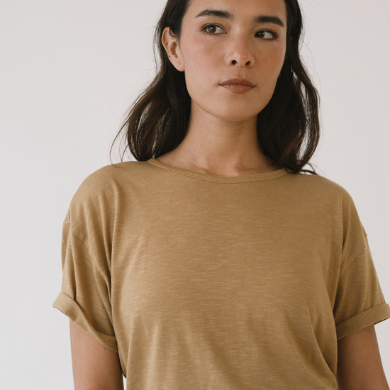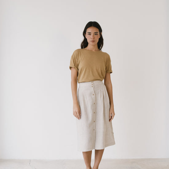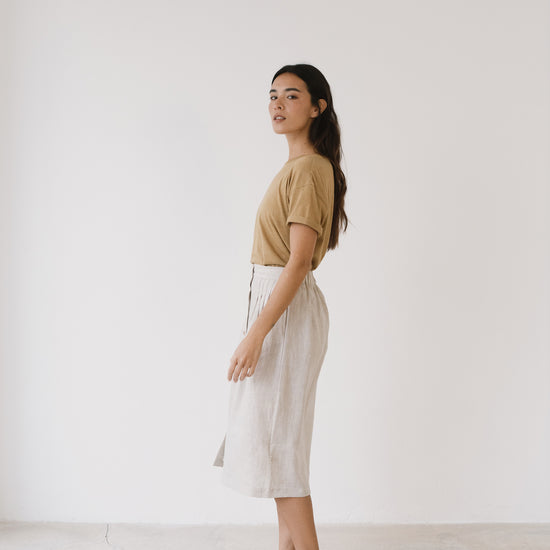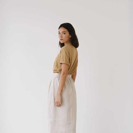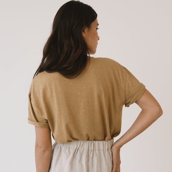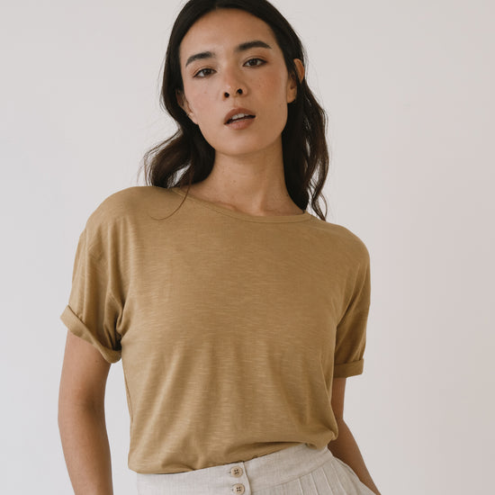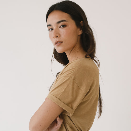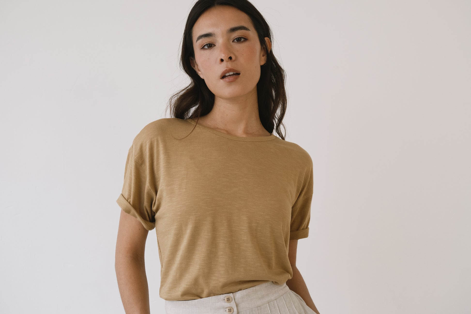 The Amber basic T-shirt is defined by its elegant drape and fluid silhouette, creating a piece that feels both simple and refined. Its premium blend of organic cotton and modal ensures a soft, breathable feel that stays fresh and comfortable all day long. With its clean, timeless design, it pairs naturally with our jeans for everyday ease or with a skirt or linen trousers for a more structured, professional look. This pastel yellow shade conveys warmth and serene joy. A soft, luminous color that adds brightness to your wardrobe in a subtle and timeless way.