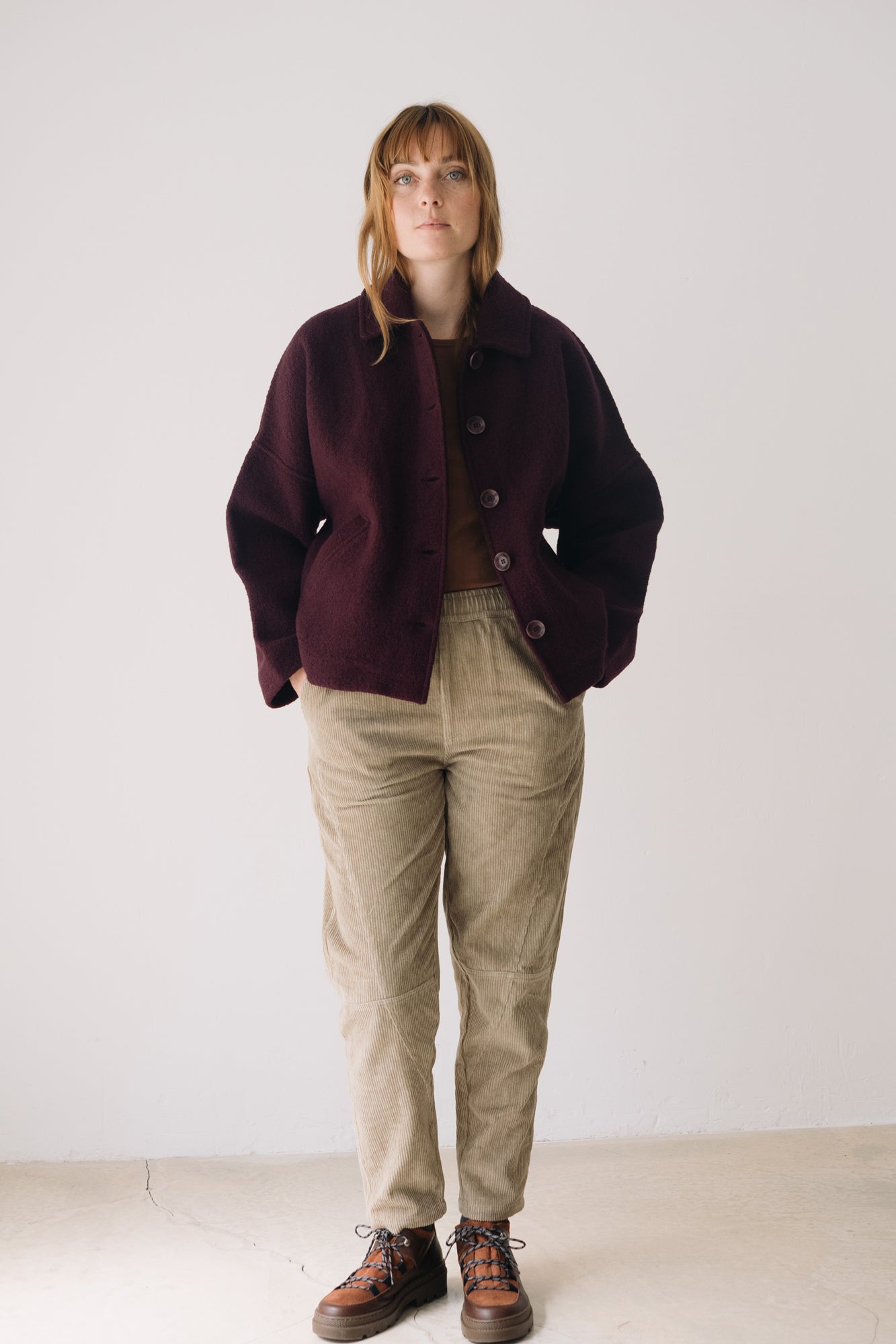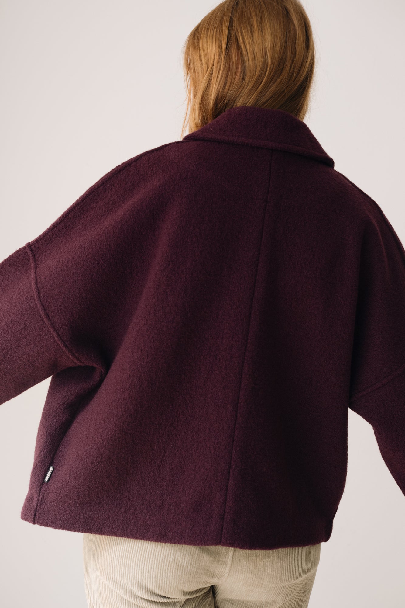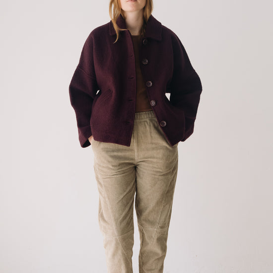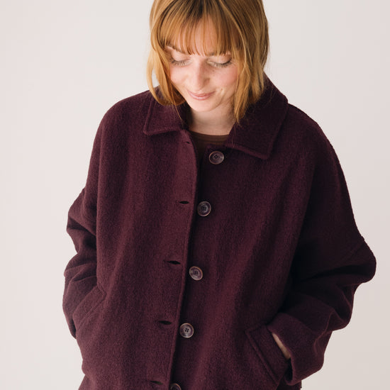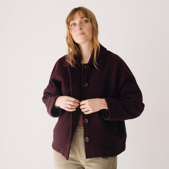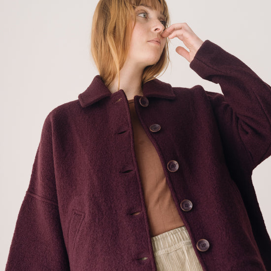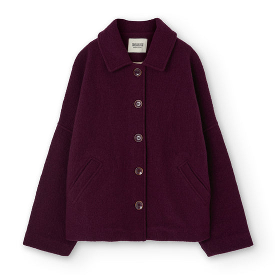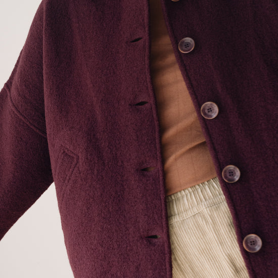 This merino wool Jacket blends warmth, timeless style, and sustainability. With a retro-inspired cut, shirt collar, dropped shoulders, and diagonal pockets, it’s designed to be a lasting essential in any sustainable wardrobe. Made from Woolmark- and RWS-certified merino wool knit, this eco-friendly jacket guarantees animal welfare and responsible production. Its structured yet lightweight and warm fabric makes it perfect for cold days. Finished with biodegradable corozo buttons and carefully crafted in our atelier in Tàrrega, Spain. The purple shade evokes depth, introspection, and mystery—a color that connects with our inner world, creativity, and sensitivity.