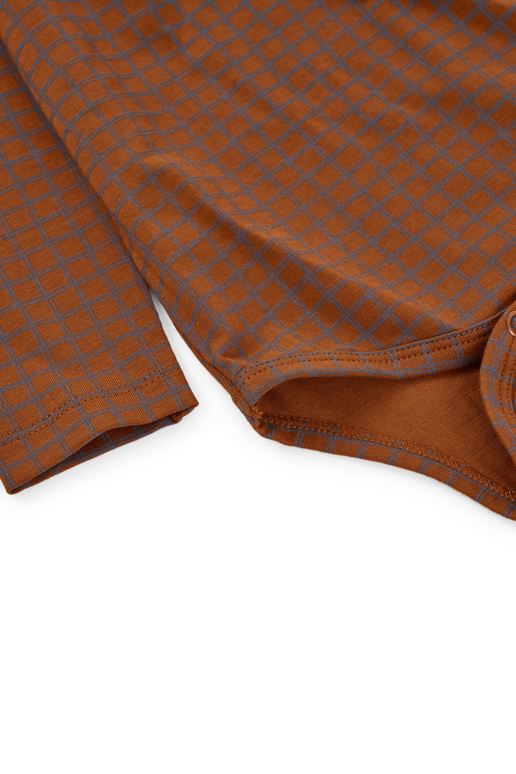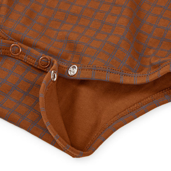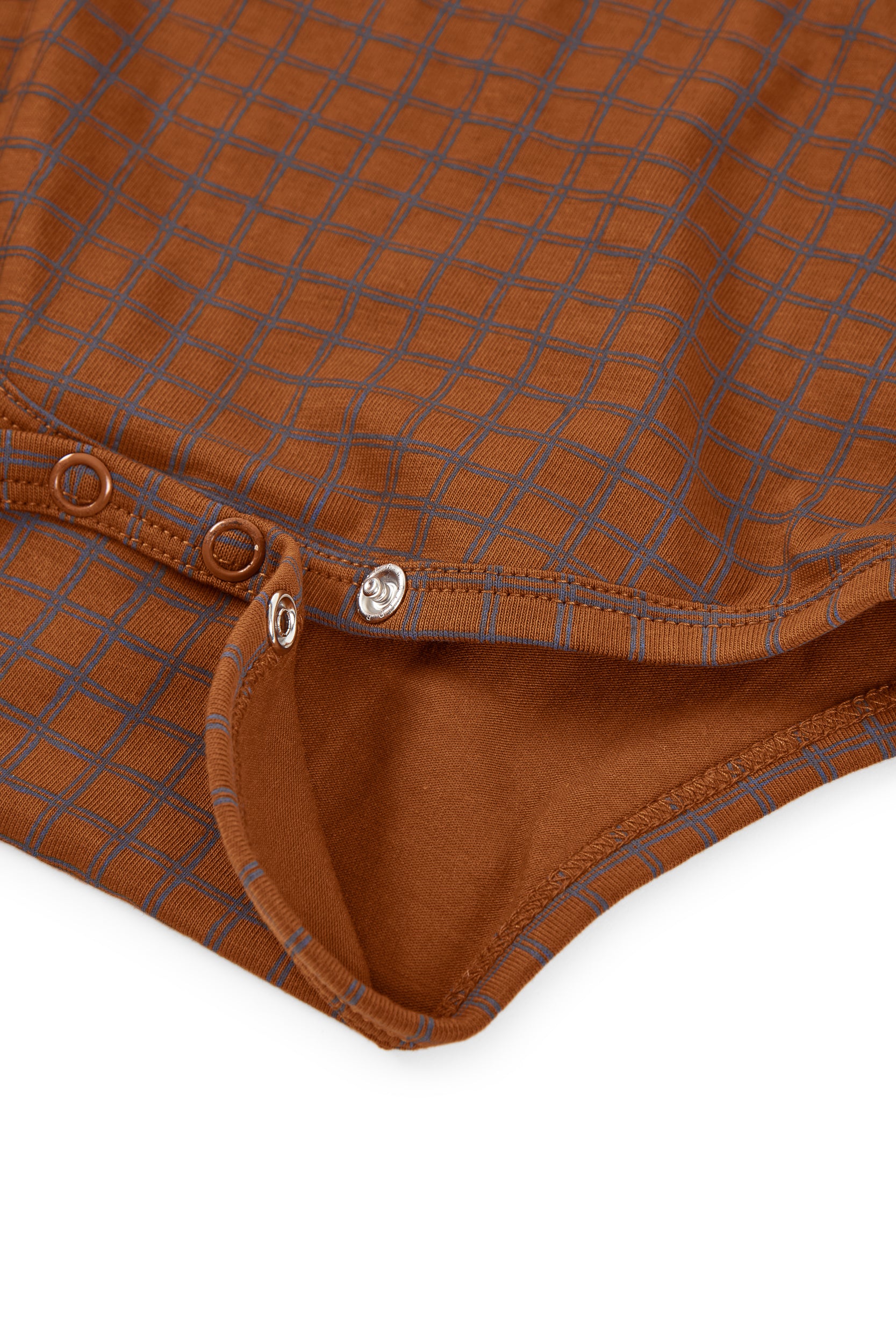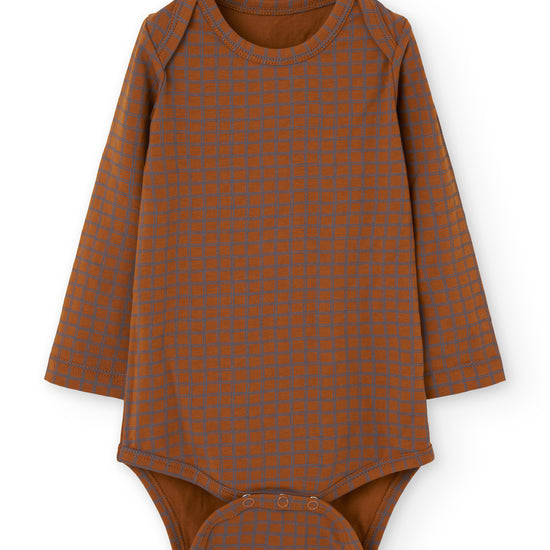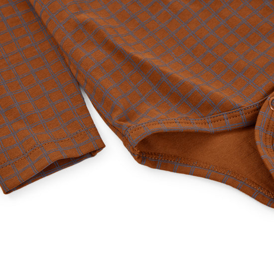 This GOTS-certified organic cotton Bodysuit is designed to support your baby’s free movement and growth. With long sleeves, overlapping shoulders, and nickel-free snaps at the crotch, it offers both comfort and practicality. Made from a lightweight rib fabric that’s warm, breathable, and incredibly soft to the touch. All our baby garments are toxin-free and hypoallergenic, carefully crafted to protect and respect your baby’s delicate skin. Its checkered pattern in terracotta and grey tones conveys warmth, creativity, and balance. A unique and harmonious plaid print that brings character and timeless style to any outfit.