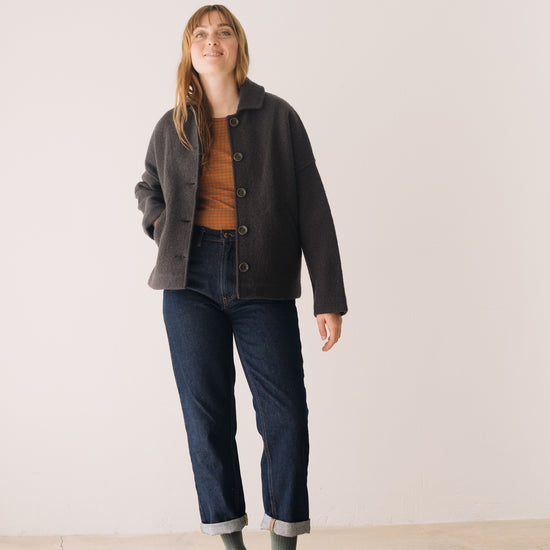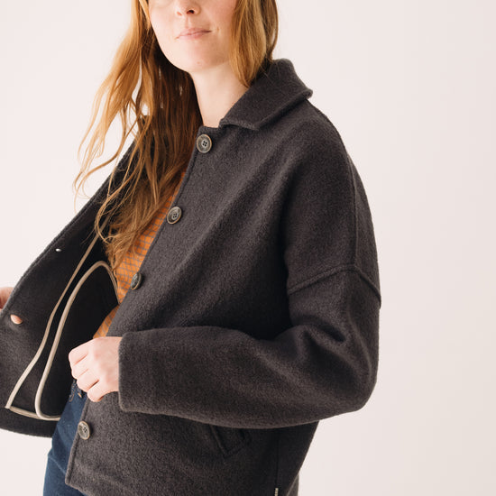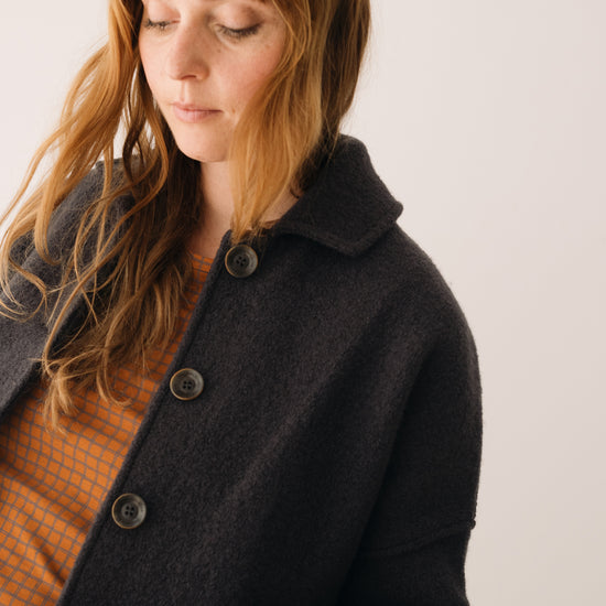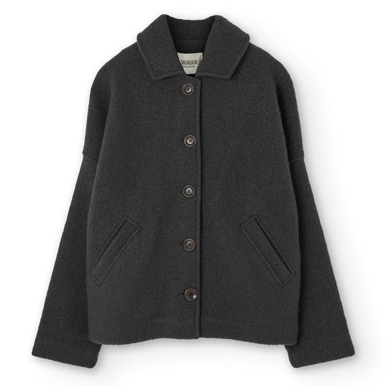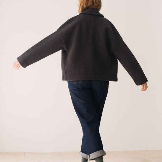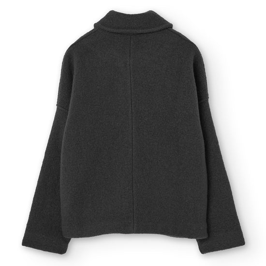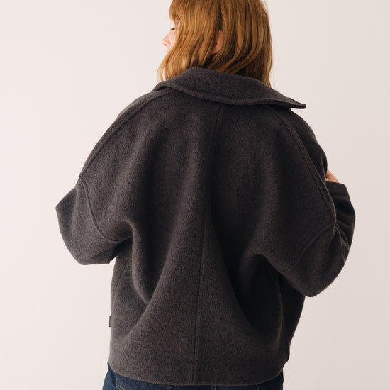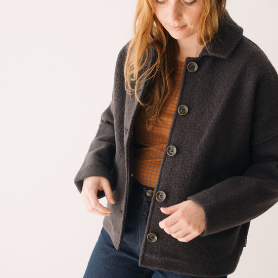 This Jacket is perfect for those who seek warmth, design, and sustainability all in one piece. Thoughtfully created to accompany you for many years, it features a retro-inspired cut with a shirt collar, dropped shoulders, and diagonal pockets. A timeless staple that will become a must-have in your sustainable wardrobe. Crafted from Woolmark- and RWS-certified merino wool knit, ensuring animal welfare and an ethical, environmentally respectful production. The fabric has structure yet feels incredibly lightweight and warm—perfect for chilly days. Finished with biodegradable corozo buttons and lovingly made in our atelier in Tàrrega, Spain. The Bark Grey shade is an essential neutral, a timeless basic that conveys seriousness and stability. A durable color that makes us feel elegantly minimalist.