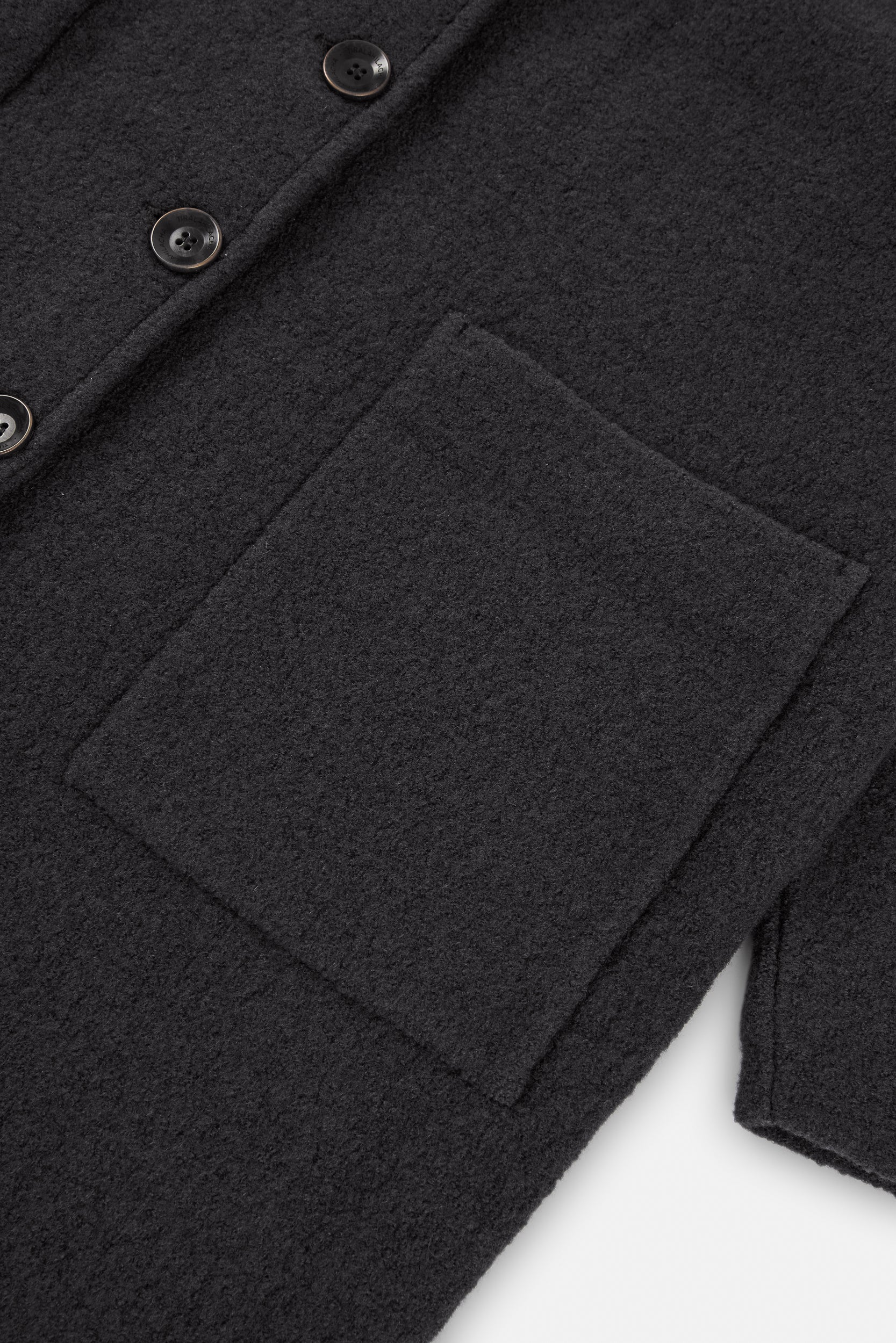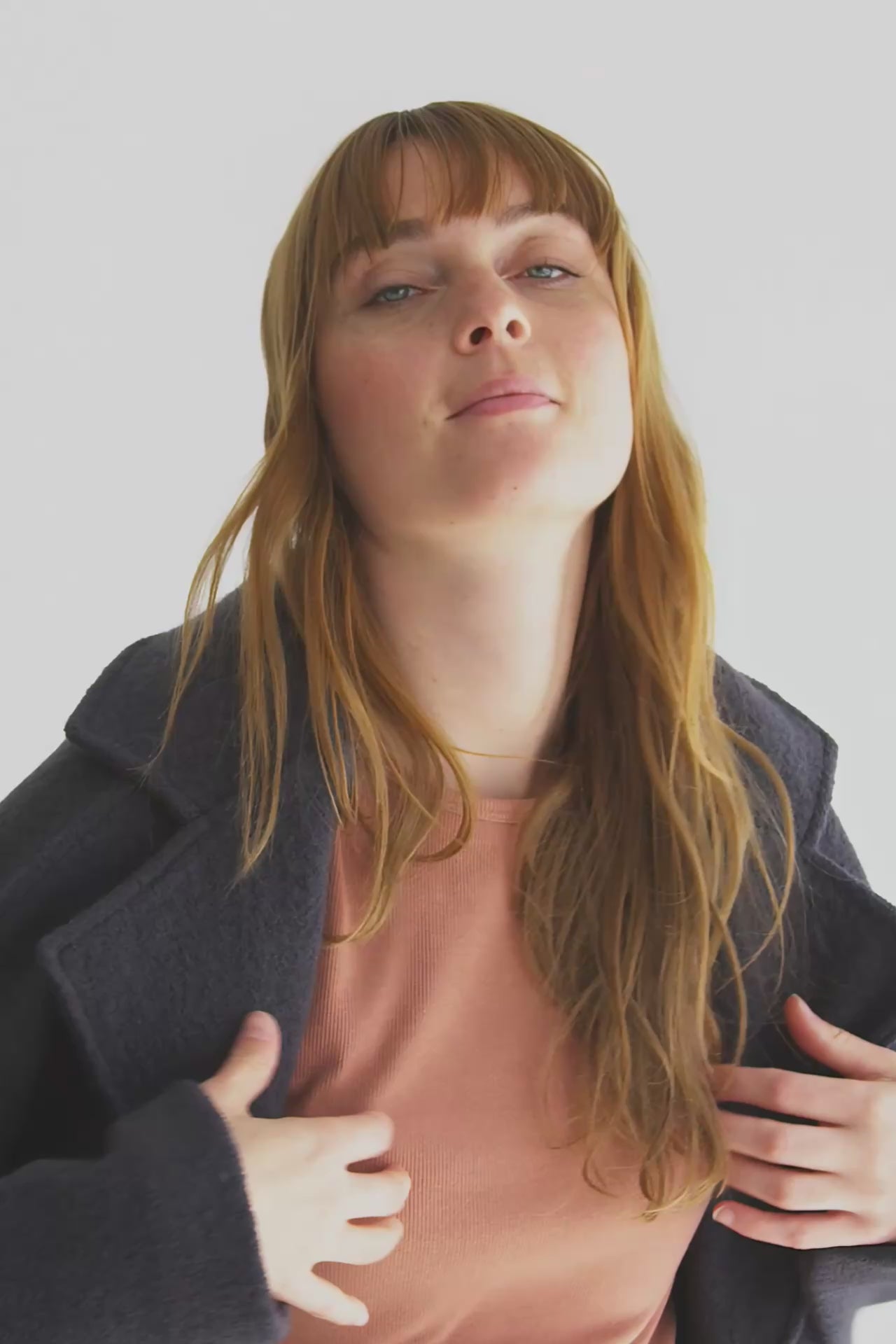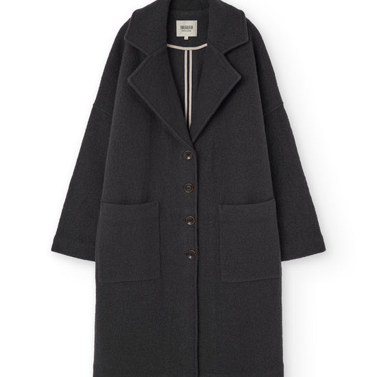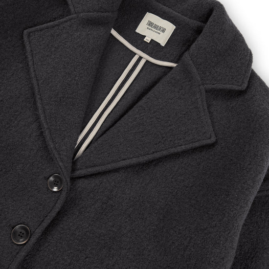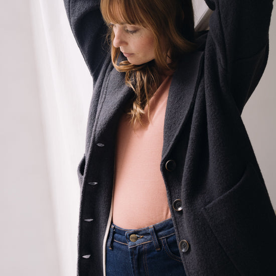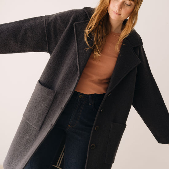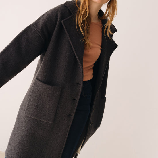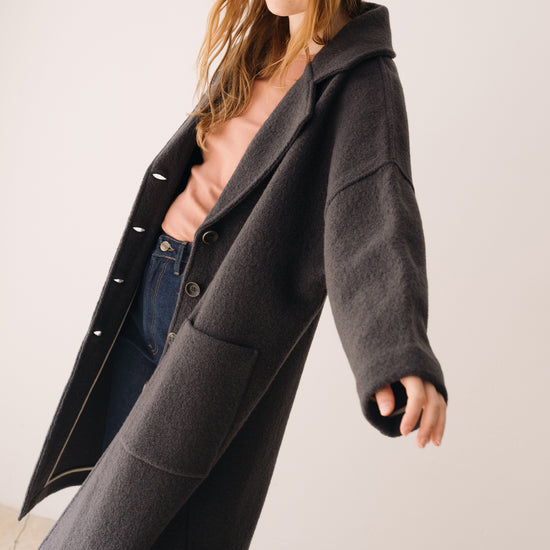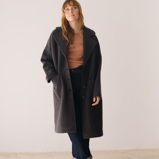 The perfect Coat for those who seek warmth with elegance, sustainability, and comfort without compromising on design. Sophisticated and timeless, it has been thoughtfully designed to stay with you for many years without ever going out of style. Featuring an oversized cut with dropped shoulders, a notched lapel collar, and spacious patch pockets, it’s a statement of effortless elegance. Crafted from Woolmark- and RWS-certified merino wool knit, it ensures animal welfare and an ethical, environmentally respectful production process. The fabric has body yet feels wonderfully lightweight and warm—perfect for cold days. Finished with biodegradable corozo buttons and lovingly made in our atelier in Tàrrega, Spain. The Bark Grey shade is an essential neutral, a timeless basic that conveys seriousness and stability. A durable color that makes us feel elegantly minimalist.